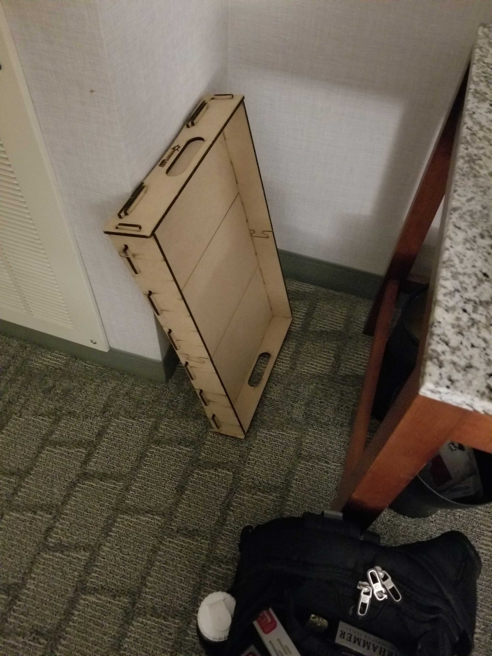 I meet up with John Lennon again and we watch the first half of the Sunday Night Football game (he's a Packers fan) and talk about our games. John lost in round 5 to Brent Simon in the 4-0 bracket, though he already won a GW event this year - Seattle - so he's punched his Golden Ticket. I'll end up catching an Uber to the airport with him and Nanavati and Paul in the morning, since my flight leaves only about half an hour after theirs. Getting packed to go home is always the hardest part; I have a bunch of extra stuff to get back, like a t-shirt, two models, some LEGO kits I bought for my son, plus this trophy. Sadly, something has to stay behind and well, the MDF carrying tray is starting to look pretty rough around the edges. Thank you for your service, tray.