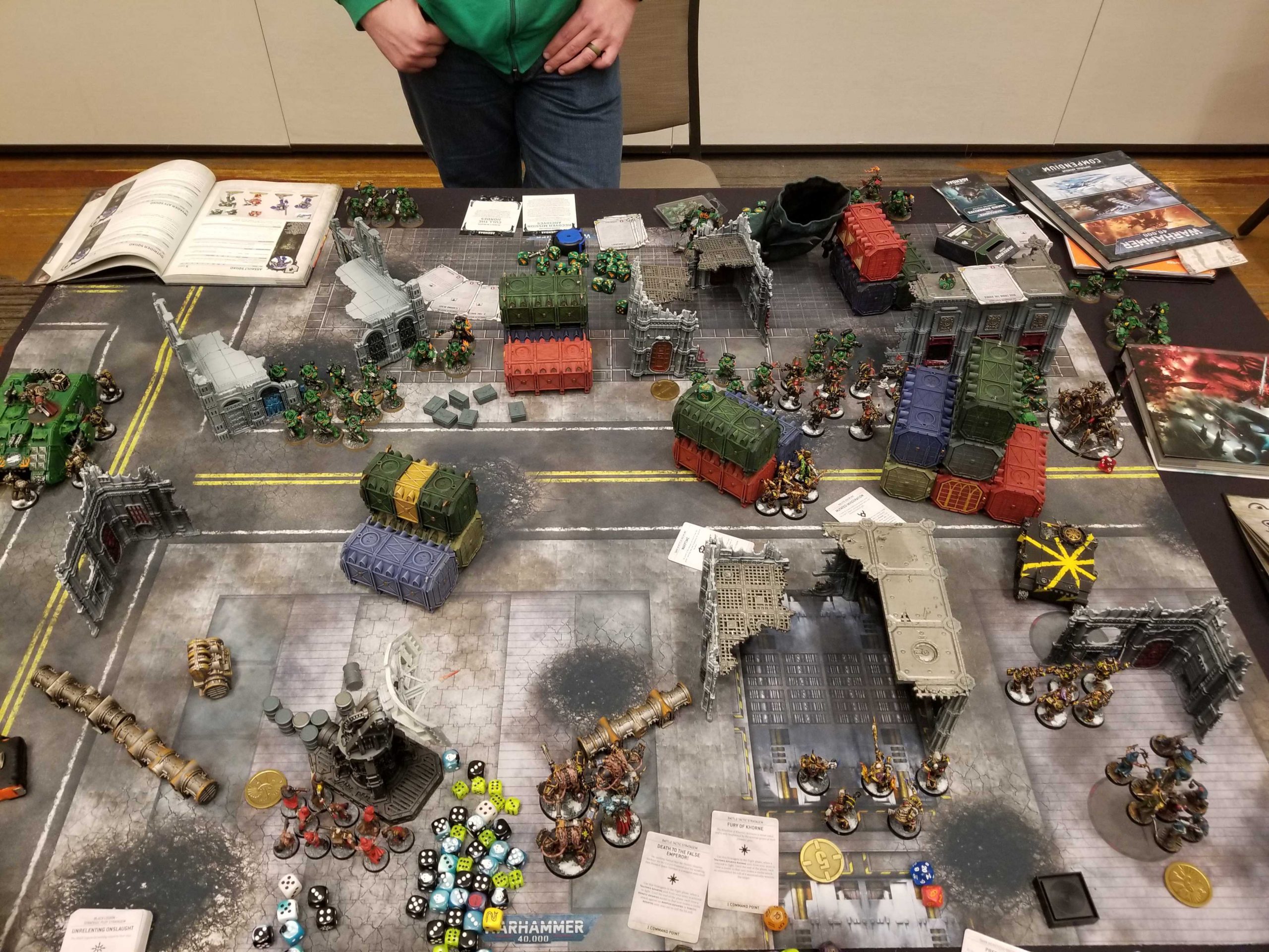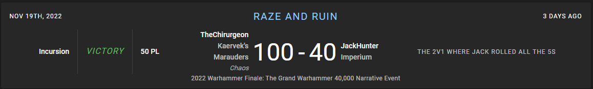 This time there aren't enough Imperium players to match into all of us Chaos folks, so Jack agrees to take on Condit and I in a 2v1 game. Jack's an incredibly rad dude and one of the key executives who helps keep Goonhammer running, and I have never had a chance to play against him in a game. We're playing Raze and Ruin, a mission I like