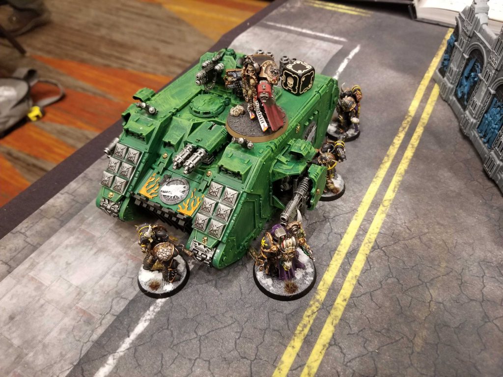 After pairing everyone else up, I get matched into Rob and his Salamanders. Rob's a great guy, and was an absolute pleasure to play against. His Salamanders look great, but he's still putting the finishing touches on some of them. He's running heavier on Flamers than melta, though he's got a unit of six Eradicators, and those will be my primary concern. Rob gets the first turn and moves forward a bit but I've kept a good amount of my forces hidden, so the Land Raider avoids much real damage.