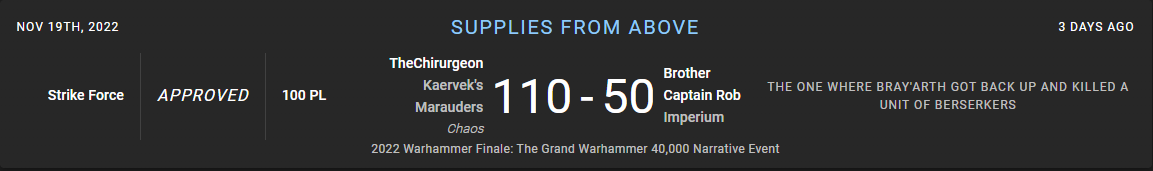 I end up heading in early - around 11:30 - and crash for the evening. I don't sleep particularly well, but waking up early means I can help schedule Goonhammer posts. Overall a fun day 2 at the event, with one to go. Check back on Saturday for the recap of the final day.