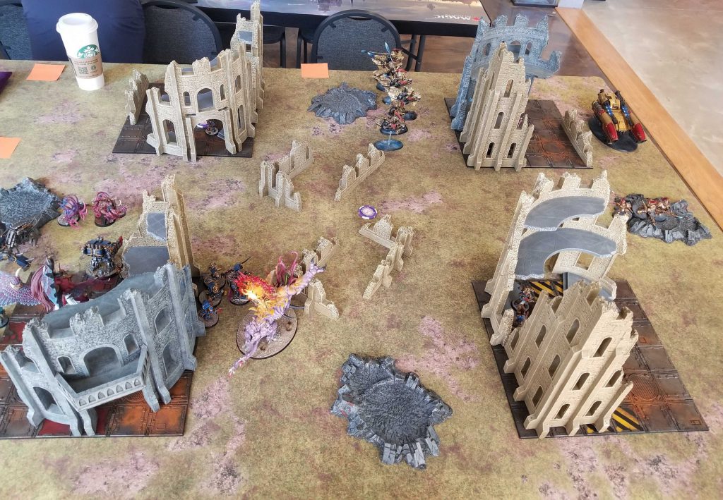 Despite losing Magnus the big story this game was that I was able to keep a number of units on the table. On the top left objective I threw my defiler at a pair of Allarus terminators only to be deeply disappointed when it failed to kill either and died two turns later - the Rubrics would end up finishing one off while the other tore through them - and my Mutalith did some work dominating them middle, never quite taking enough wounds to be removed. Meanwhile on the right side of the table I was able to bring back a Scarab twice and used their shooting and smites to remove the remaining Allarus and take the objective.