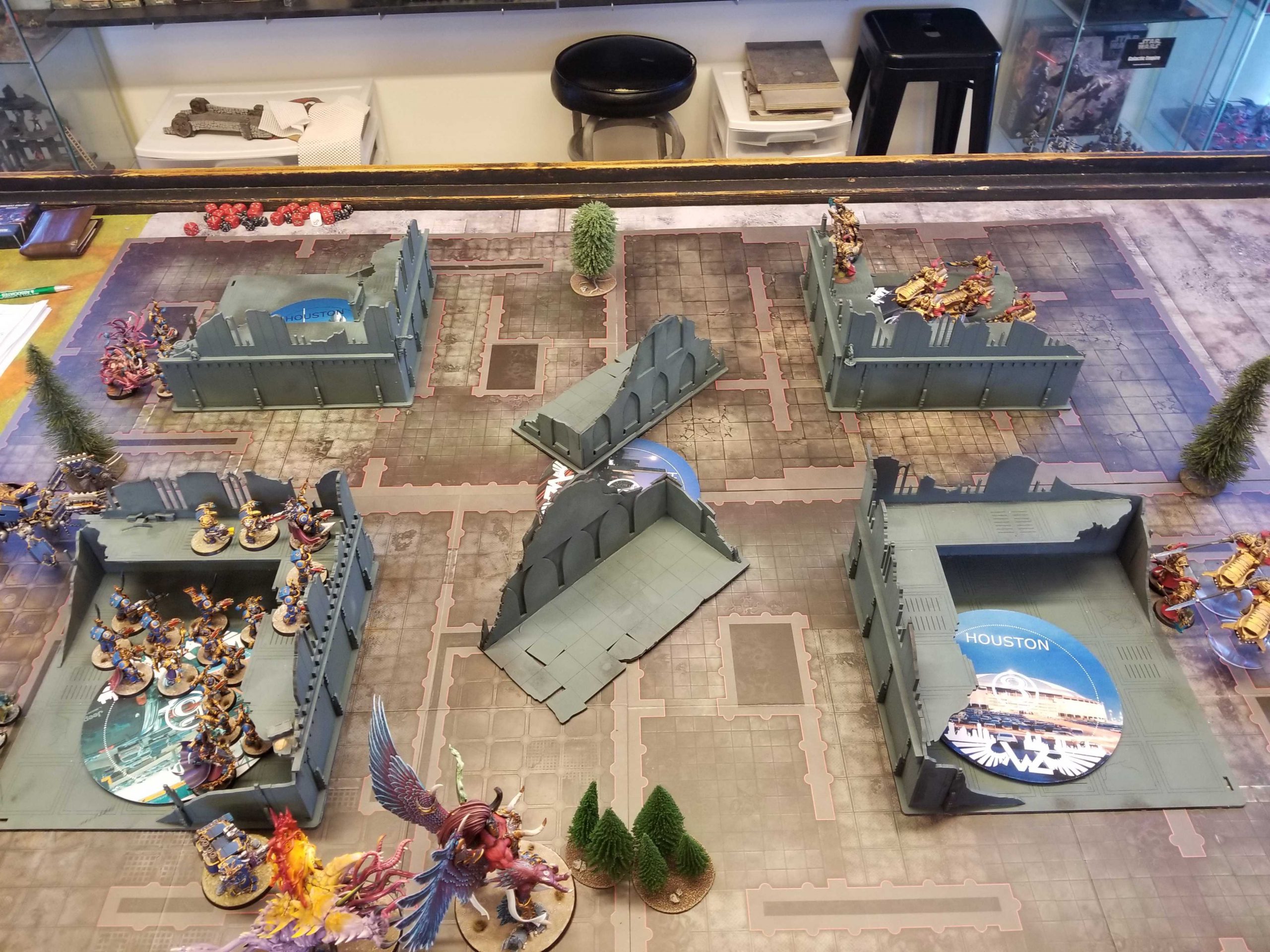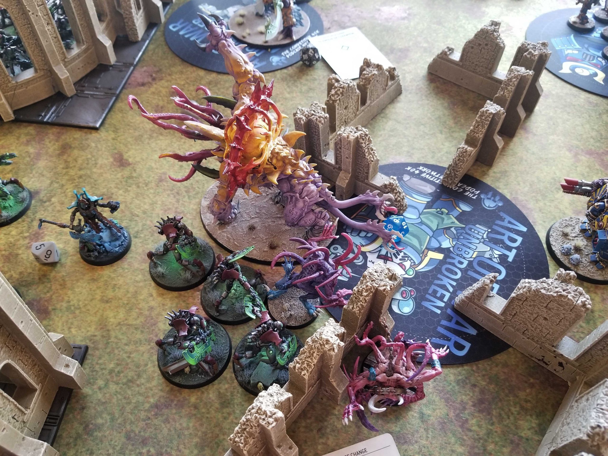 Poor Greg. You may recognize Greg "Klobasnek" Narro as the other, Texas-bound Greg I play from time to time, the one with some beautifully painted Sisters models. Greg's brought his Necrons to the event and well, running into Thousand Sons is just real unfortunate. My whole deal is throwing out mortal wounds and his whole deal is not standing back up when he loses models to mortal wounds. On top of that the only thing he has that's really a threat to Magnus are the Doomstalkers, who hit on a 4+, and the Gauss Reapers with volume of fire. It's a very heavy matchup in my favor. Greg's army is, however, absolutely beautiful, and if I weren't bringing my Thousand Sons he'd be a shoe-in to win Best Painted today.