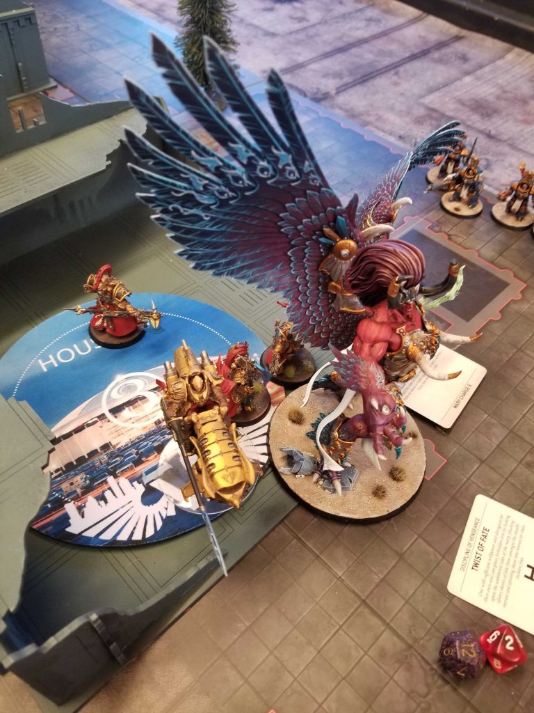Magnus' luck runs out on turn 2 when he charges the Bike Captain, only to have a Praetorian Plate character, and another Allarus intervene into him, and then the bike captain survived despite not having an invulnerable save active. The bike captain would then fall back and charge on the following turn to finish Magnus off. What did work out well for me however, were the Scarab Terminators using Sorcerous Facade to teleport over to the edge of the board. This put me in Jake's deployment zone for Behind Enemy Lines scoring and also gave Magnus some support.