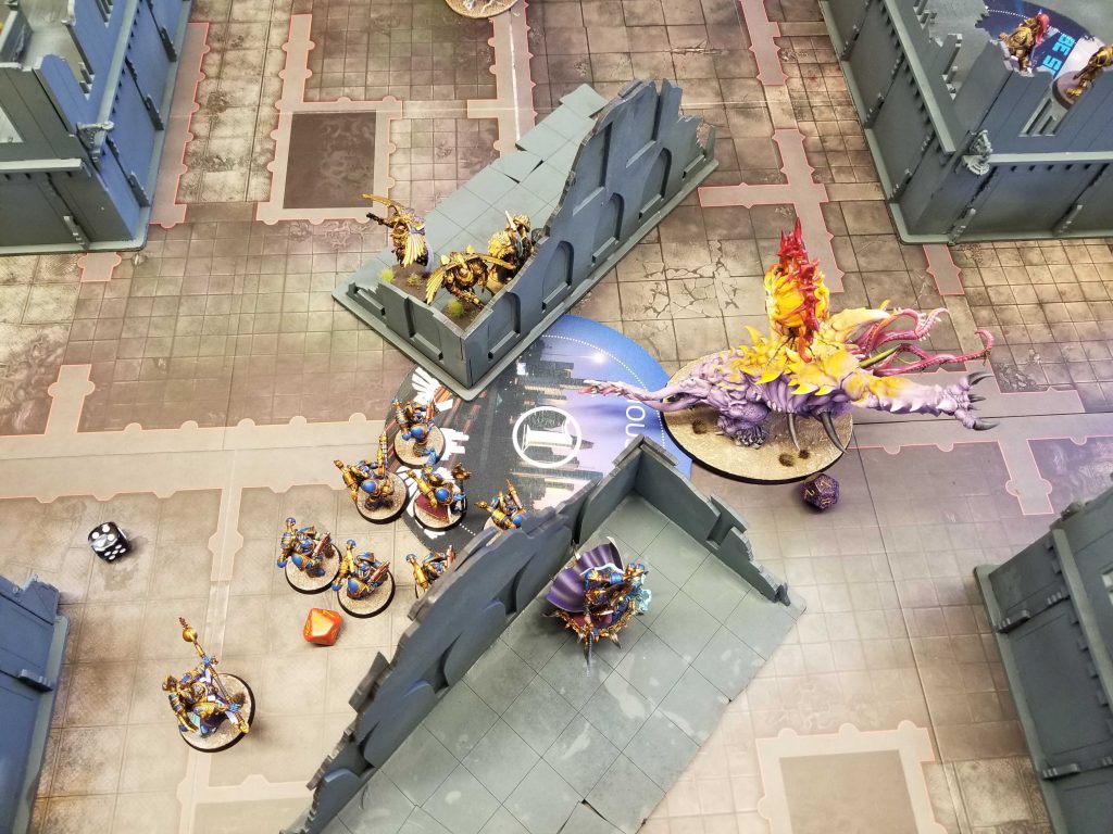 Magnus wipes out the Lychguard and to add insult to injury Greg fails two 6" charges on his turn to fail to close with the Mutalith, who survives another turn throwing out mortal wounds before finally being killed by the Skorpekhs. It then explodes (a 4+ roll), killing another Skorpekh and putting a ton of wounds on Greg's characters. I mop them up the next turn as the rest of the army marches forward. Magnus is eventually brought down by Necron Warriors but has done more than enough and Greg's out of gas. We call it on turn 4.