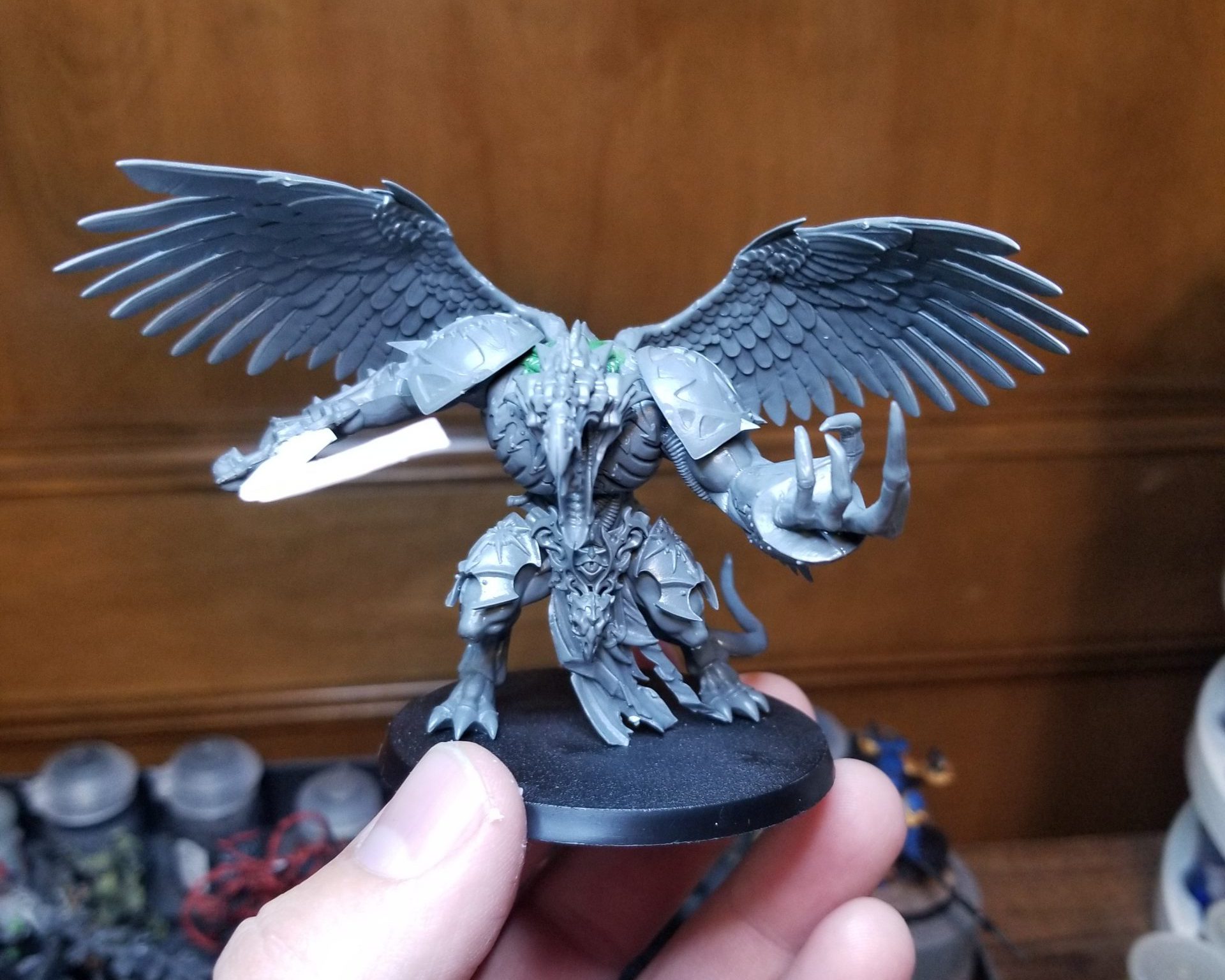 That gives me a model I'm pretty happy with, especially when the wings are added. They're big but not oversized, and the whole effect is pretty great. He's big and obviously doing what he needs to be doing without being a chore to transport. Let's paint this badboy.