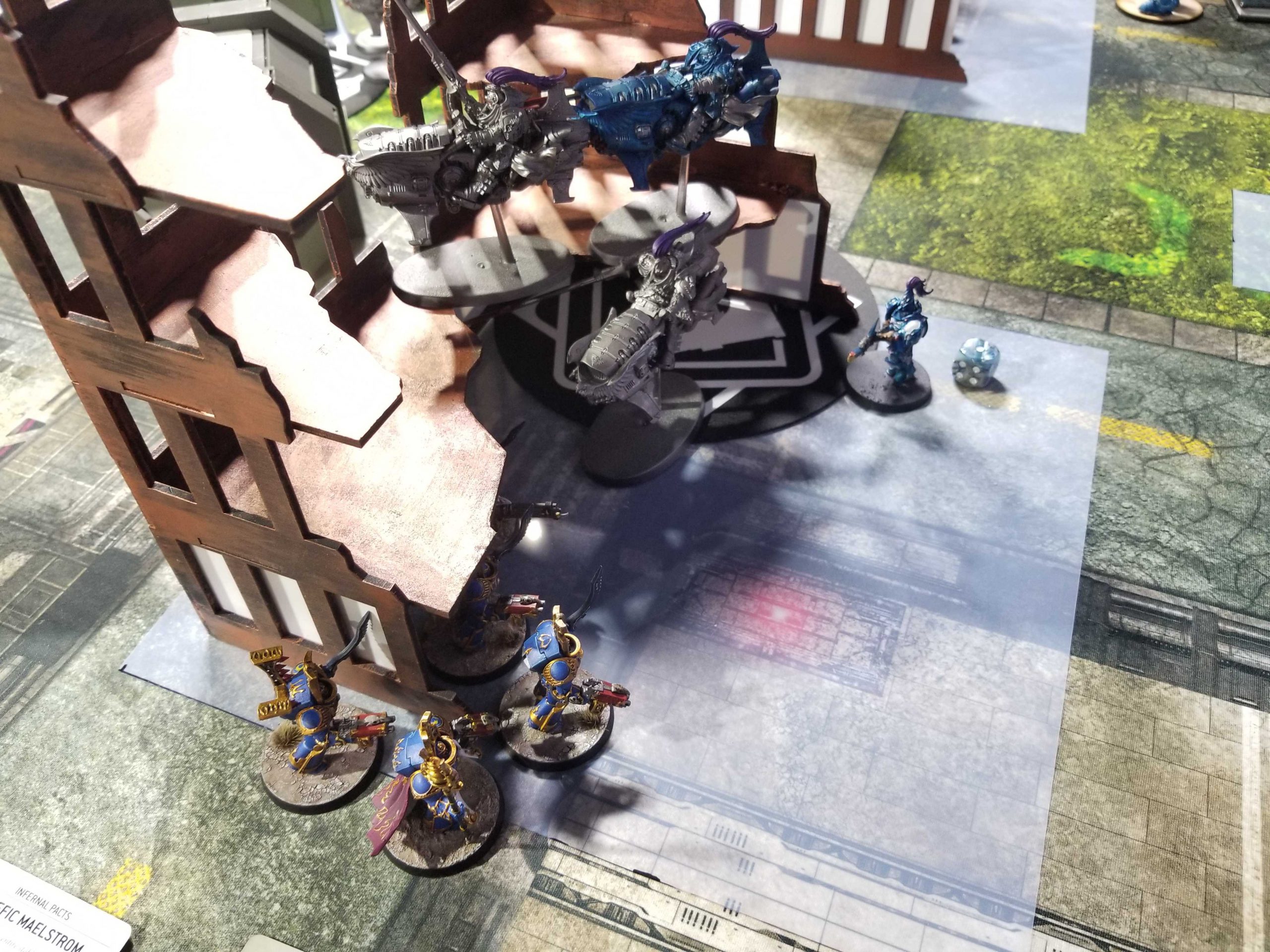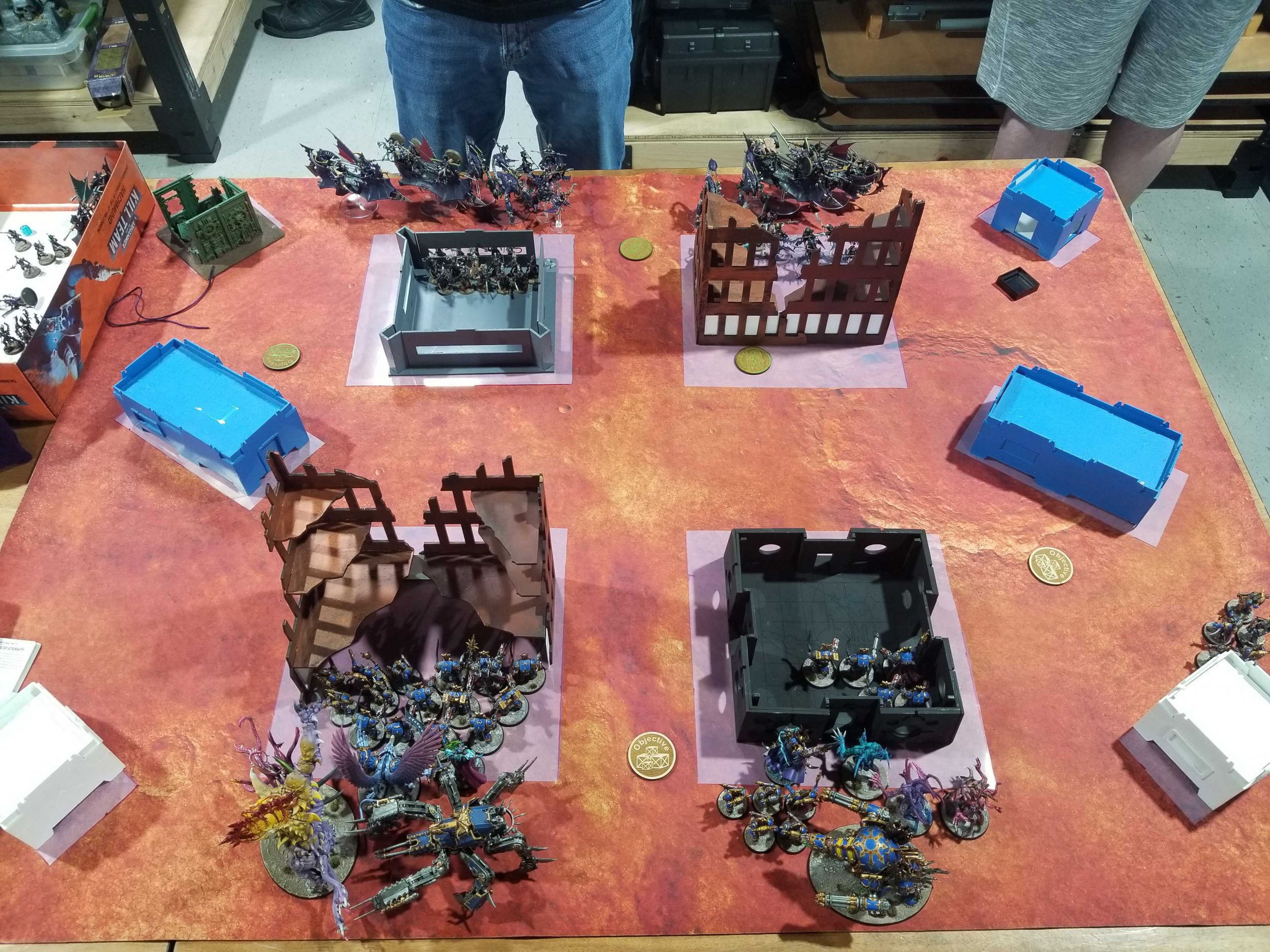 Ettin had moved to a new, larger space, giving them the room to have up to 8 tables. The new space is well lit, open, and clean. Some of the tables are a little low, but I've been told they're getting risers for them, and most of the terrain needs to be completely overhauled (I've partially been spoiled by Asgard using the GW layouts) - most of the terrain is too short and the first floors only measure 3", while the side ruins are boxes that have to be traversed. But overall the venue is nice.