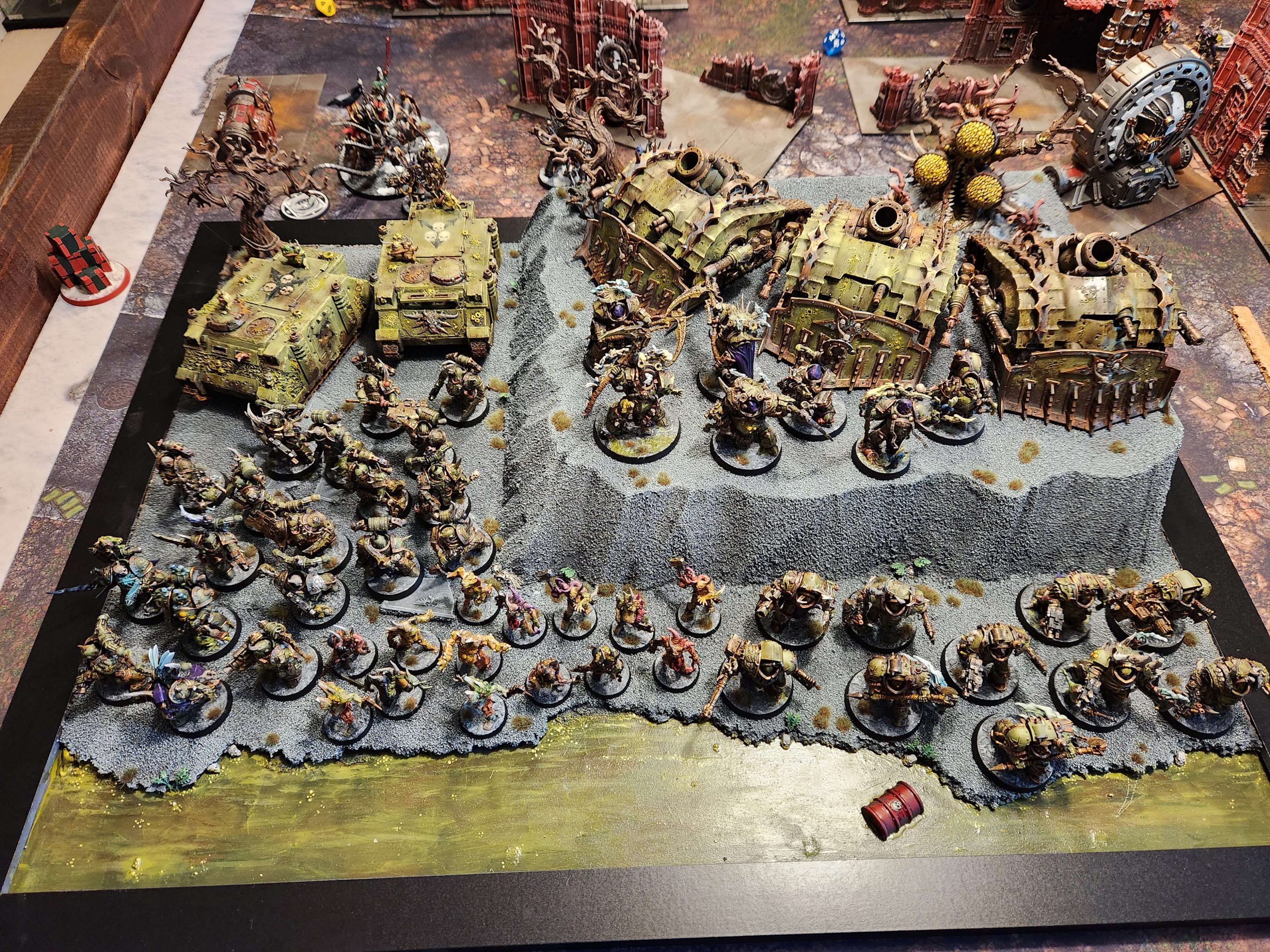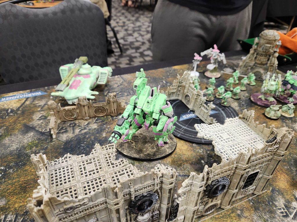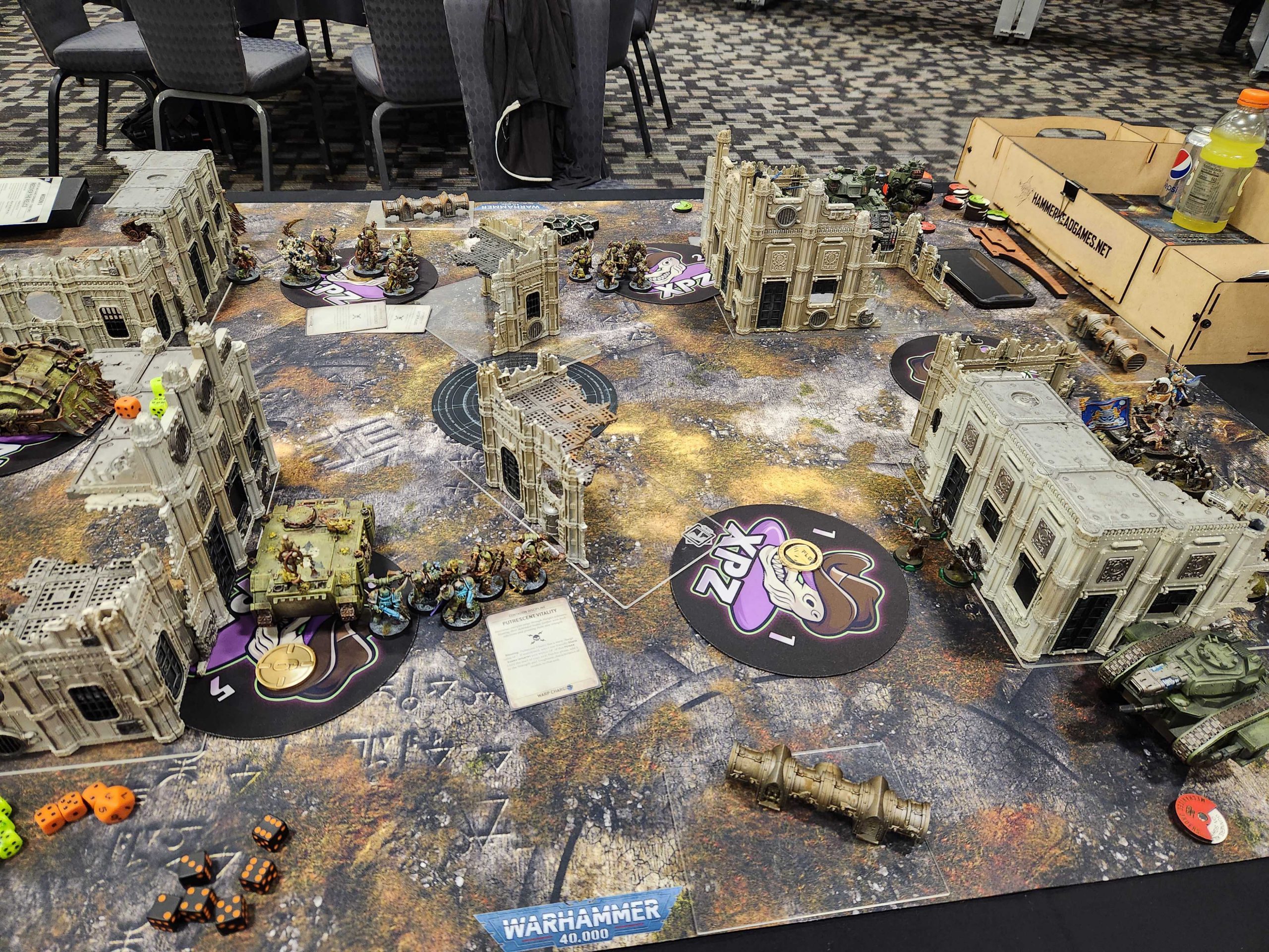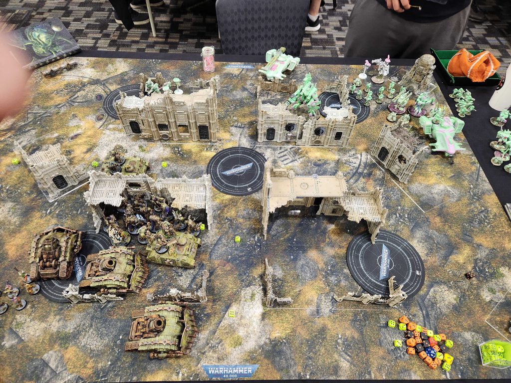 Juan steps out on his turn but isn't able to do more than kill a couple of Blightlords. That leaves me free on my turn to step back with some Plague Marines and spread the sickness and work on screening his Crisis suits out from anywhere interesting. I'm also able to press forward and get charges off on Longstrike, and this turn will kick off a 12-4 primary deficit Juan won't be able to recover from. I clear out his Kroot and some breachers, bracket his Riptide, and start bogging him down.