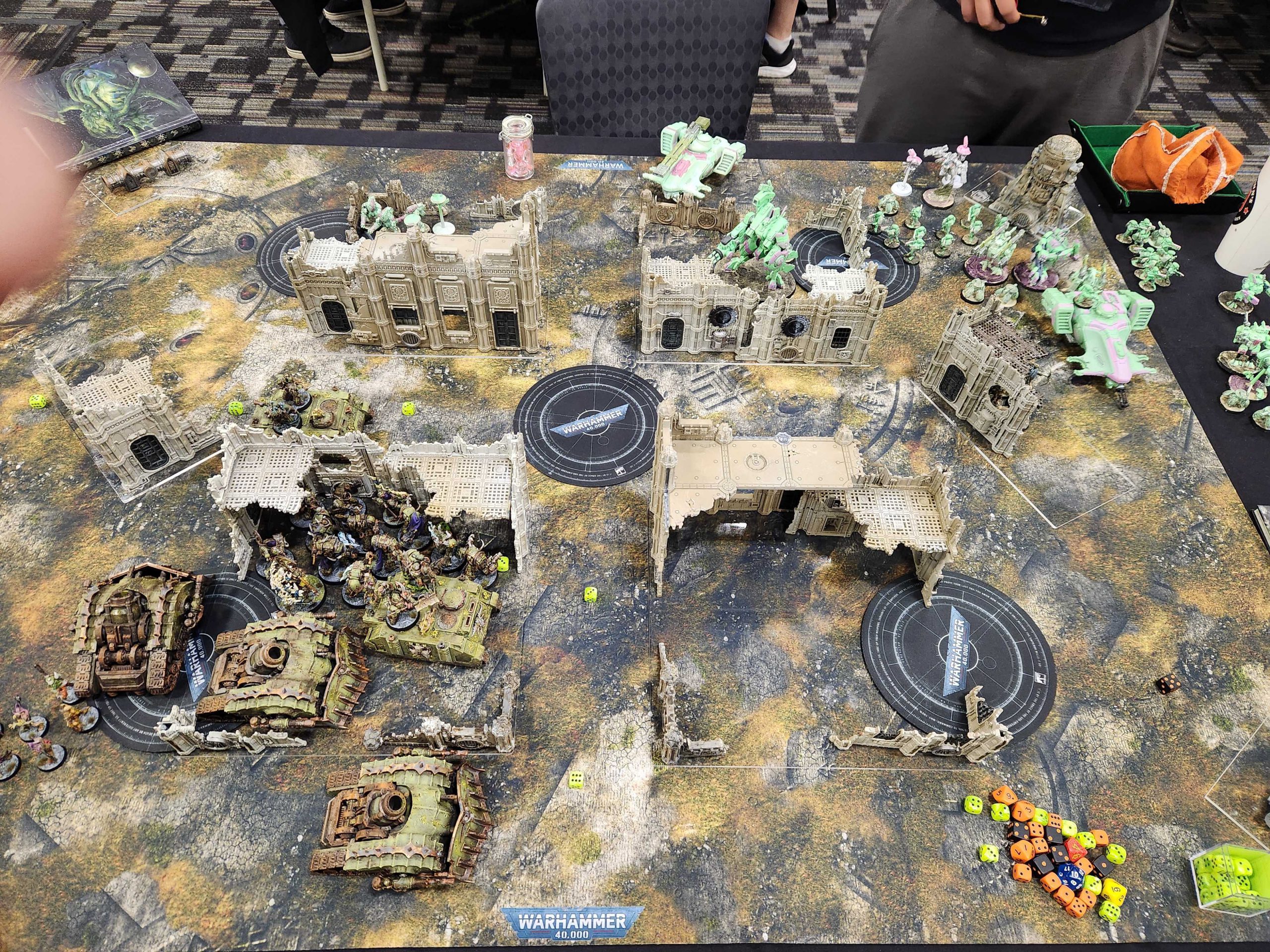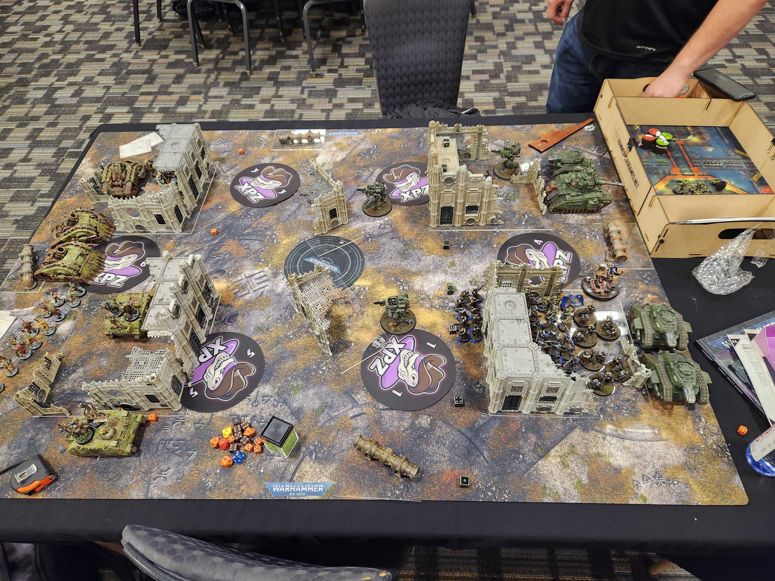 After dinner we waddle back to the hotel and I hang out with the team in the event space for a bit - Nick and Gonyo are playing their 10th edition stream game and because Eldar are completely fucked Nick is steamrolling Gonyo trivially, even with a list that seems designed to not do that. Fun times. We crash around midnight and I sleep pretty well, all things considered.