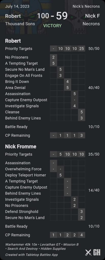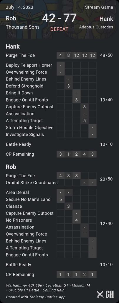 I finish the day 2-1 and while that's worse than I wanted I lost to a very good opponent in a matchup tilted against me. I can still win my first game on day 2 and make the top bracket with some good scoring and OGW luck. As it turns out, Ben won his third game, beating an Aeldari player, which is absolutely fucking incredible. He stopped by the stream game to tell me. What an absolute Chad.
