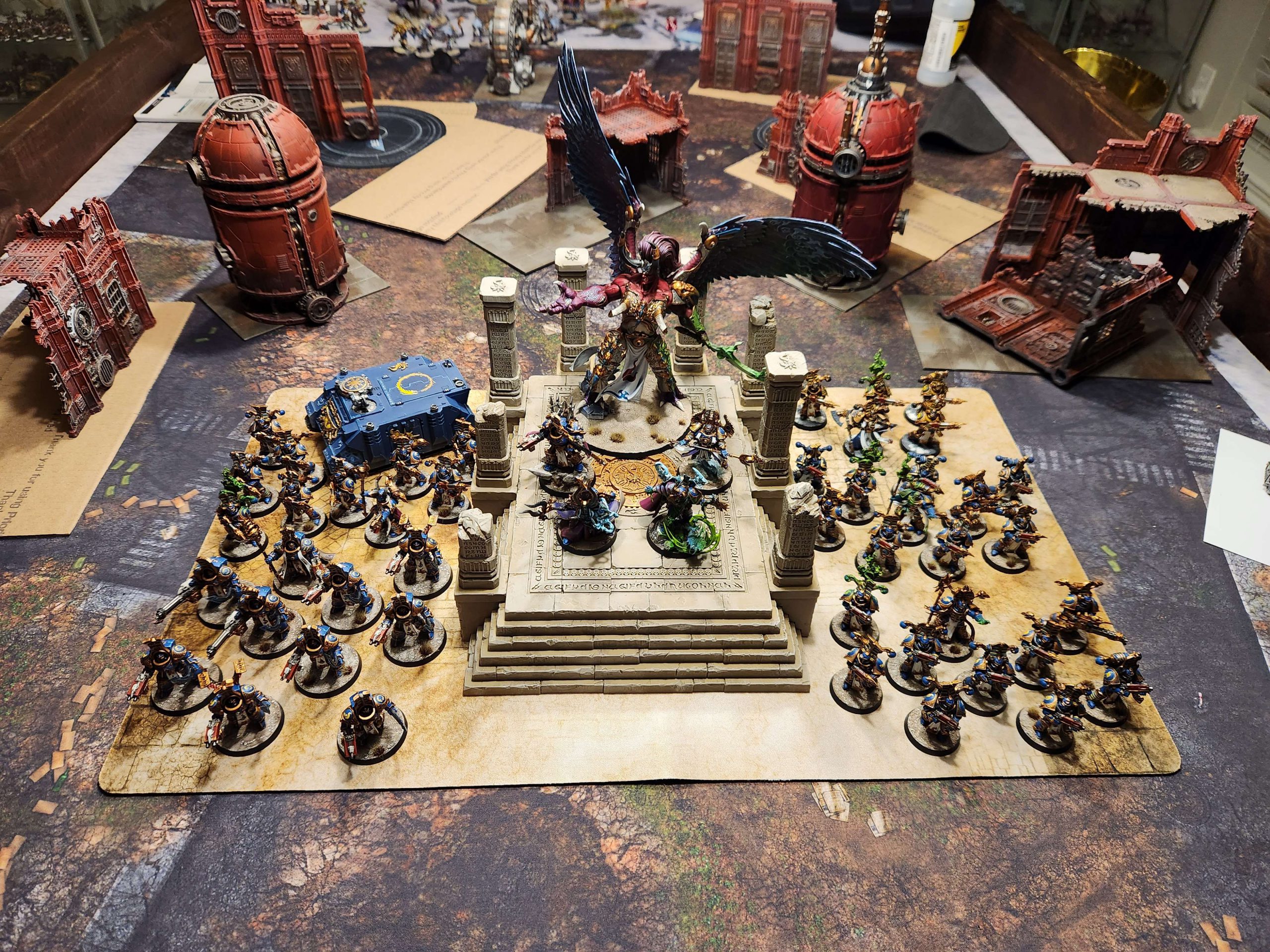 Wings tells me that Nick's got a decent list - close to the meta pick - but it's missing a few key pieces. Specifically, he's not running the Gauss heavy destroyers, nor any doomsday arks. That means that, outside of Orikan - who can use a once-per-game ability to reliably drop about 8-12 mortal wounds in a single Fight phase - he doesn't have anything which can really hurt Magnus. This means I can drop Magnus on the middle of the table and bully him around as long as I can keep away from Orikan. He also doesn't have a Tomb Spyder, and that means no invuln against my psychic attacks.