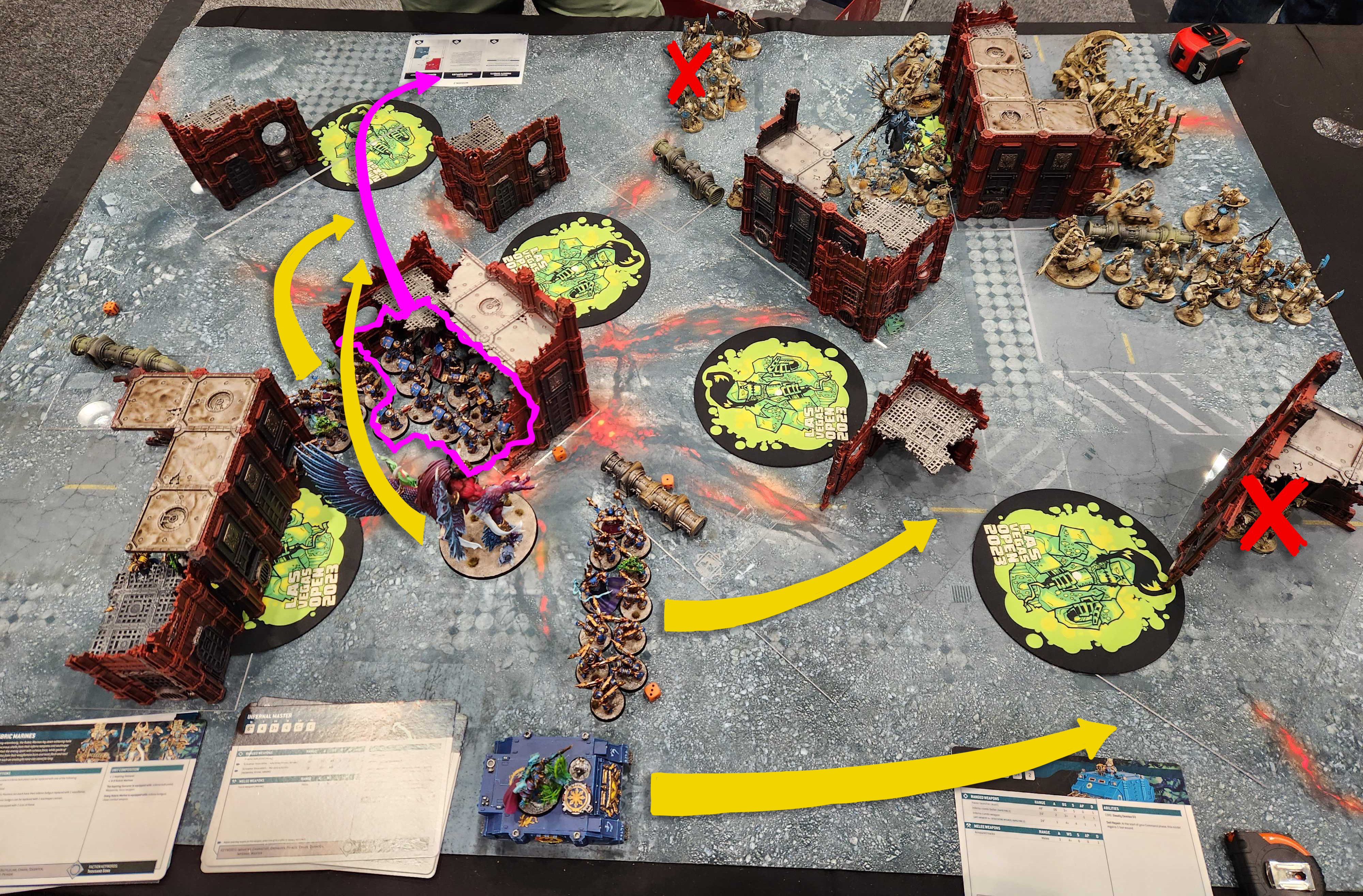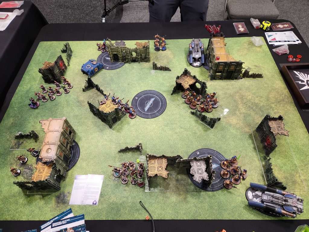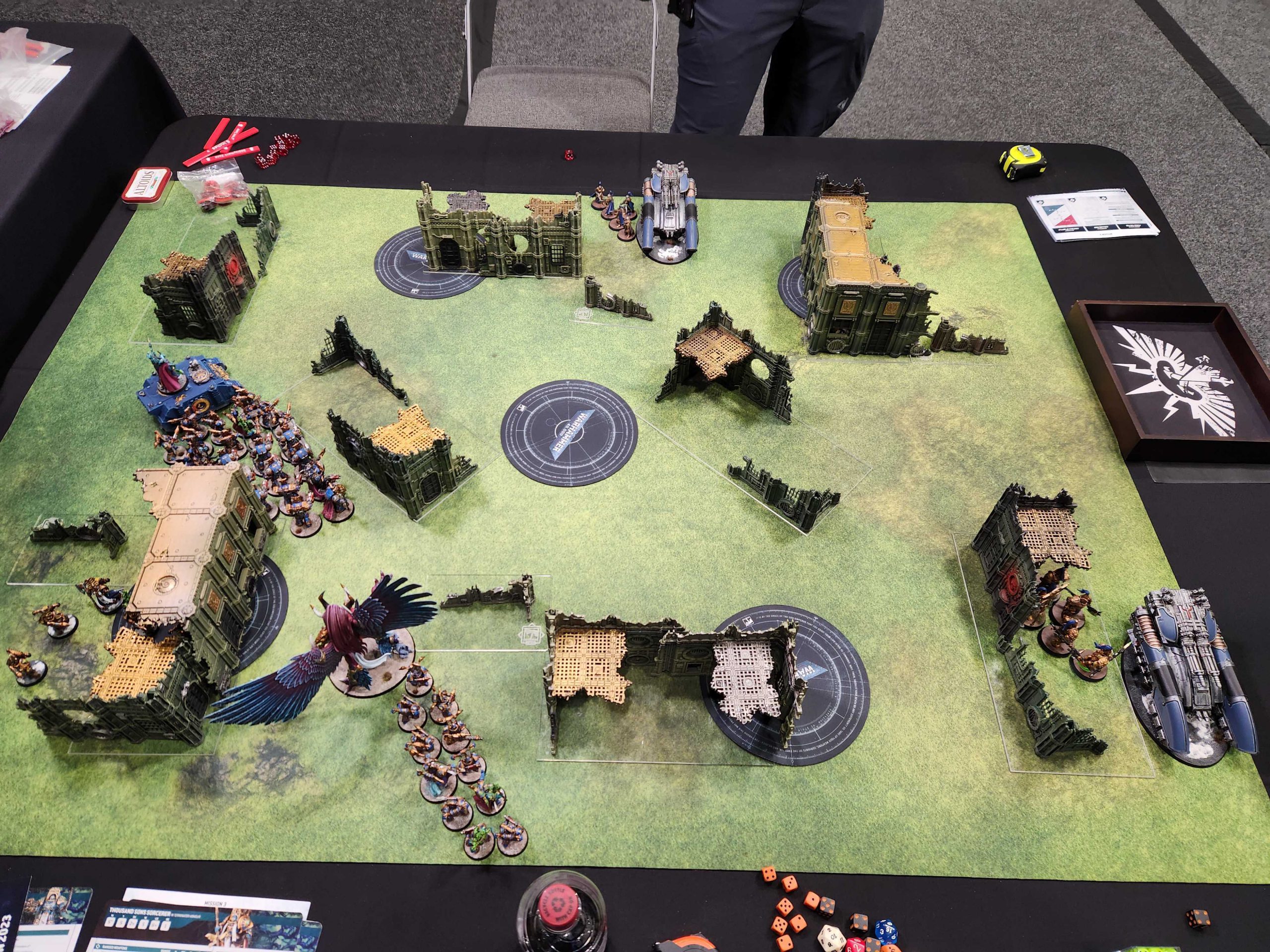 The warhound can see the whole table thanks to TOWERING, so I want to go first and hit it with Magnus and a bunch of shooting. That said, my big goal is to just try and keep it occupied while I score other objectives and win on primary/secondary. If I go second there's a good chance I lose Magnus but I think I can win without him.