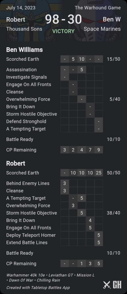 Ben and I talked for a bit after the game about strategy. After the game I have come to the conclusion that warhound lists can be surprisingly viable. Ben mentioned that if he really wanted to be bastard, his pre-nerf list was 30 desolators and a warhound, plus characters, which sounds incredibly brutal. Neat as the vindicators are, they're the boat anchor here - he needs cheaper options and his list could really benefit from 1-2 Assassins to disrupt opponents and score action secondaries. On that topic, I suggest to Ben that because many objective scondaries aren't ever going to be things he can score, he should look at just taking Bring it Down and Assassination every game as fixed so he can just score for killing things and try and win on primary.