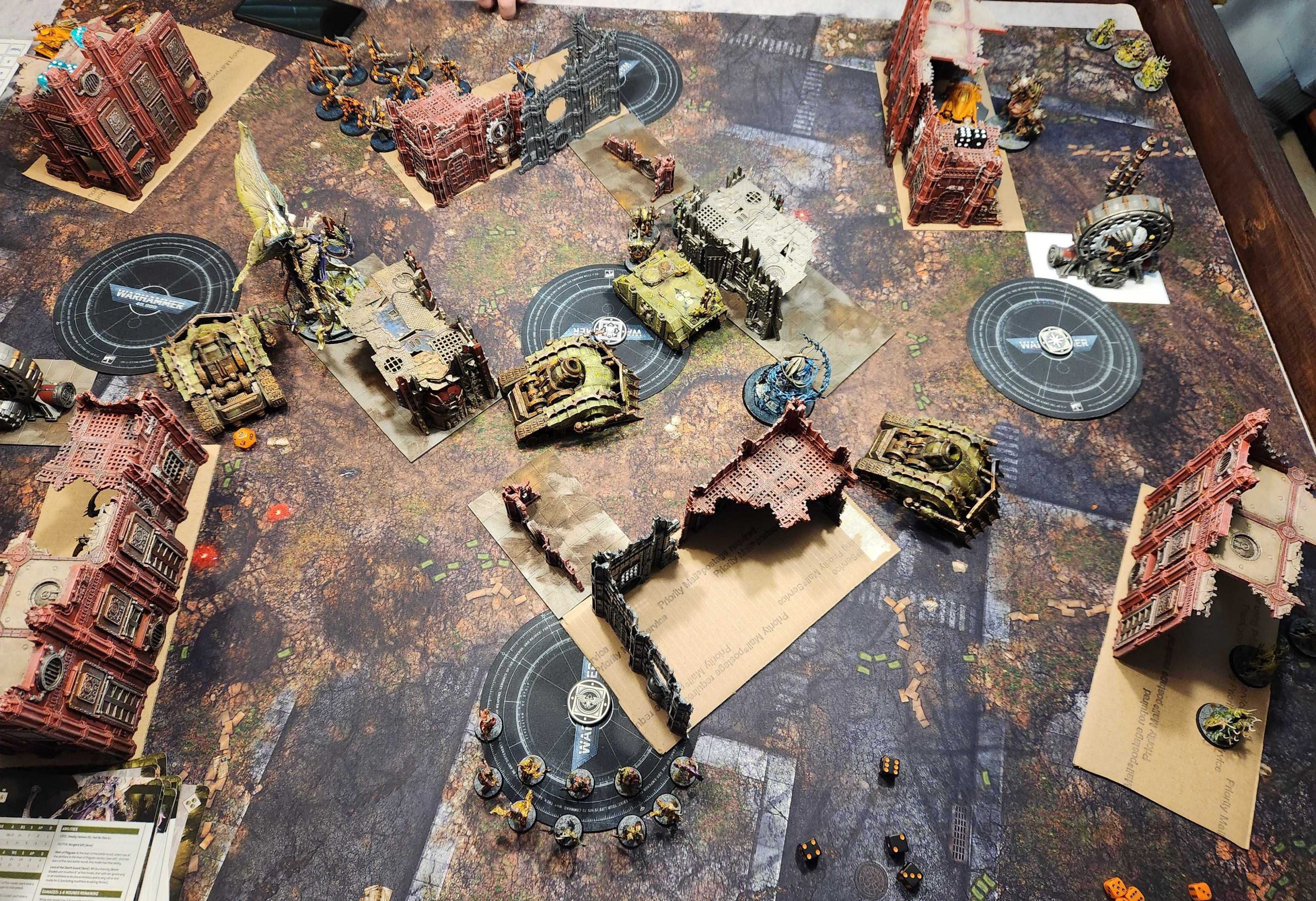 I win the roll-off and jet up the table, popping out my plague marines. They're not amazing but their ANTI-INFANTRY guns that auto-hit in overwatch are enough to make Erik think twice about risking his Wraithguard so he commits a big mistake and backs off with them, keeping them away from the unit while he uses his Night Spinners to pick it off. The Yncarne bounces around a bunch but quickly finds it's harder to kill a PBC than it would like when it's on 3+ to hit (the usual play is that it scores 3-4 wounds, I save 1-2, and the PBC lives with a bit of health. Not ideal but Morty helps mitigate the modifier), and leaving PBCs alive isn't a good deal for him. I wipe out the units Erik puts in my back corner using Typhus and his Deathshroud, and proceed to clear the middle of the table while locking up Erik's Nightspinner with Nurglings and the Flehsmower.