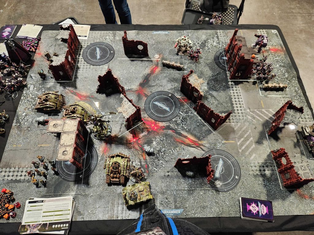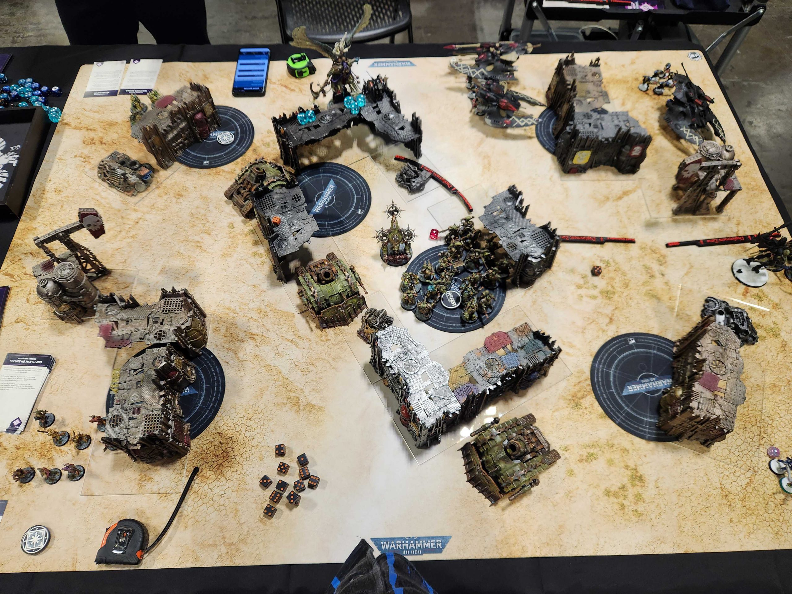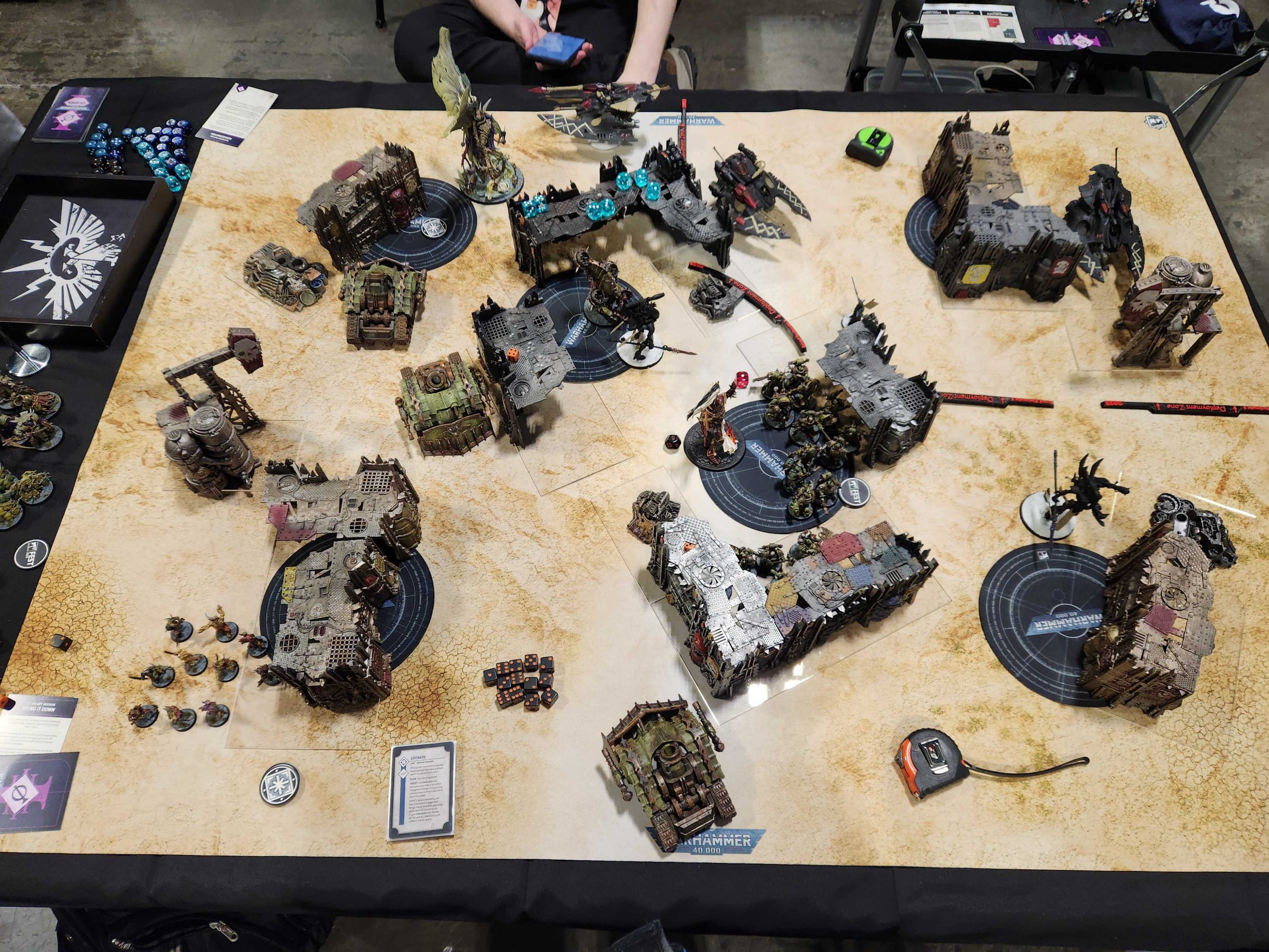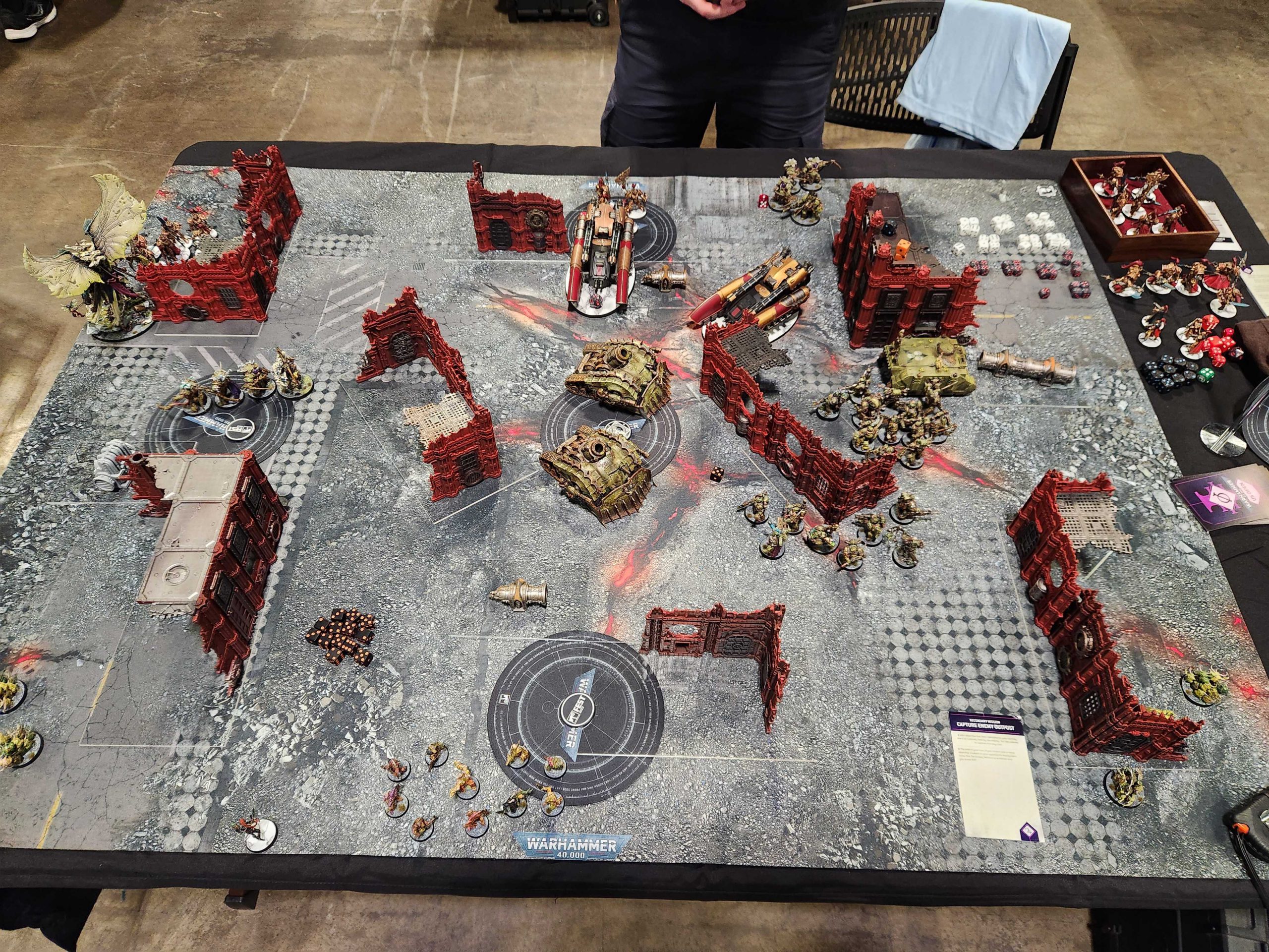 My first game of the weekend is against Custodes, an army I get matched up against in what seems like multiple times per event, though I notably dodged them last time around at Warzone Houston. Tom's running an army of solidly painted lads in gold with some cool marble bases, an effect he's accomplished with contact paper that nonetheless looks great. Tom's here for his first GT, and excited to be playing. He's worried about getting things wrong but I let him know upfront it's not an issue and he can take things back as he needs.