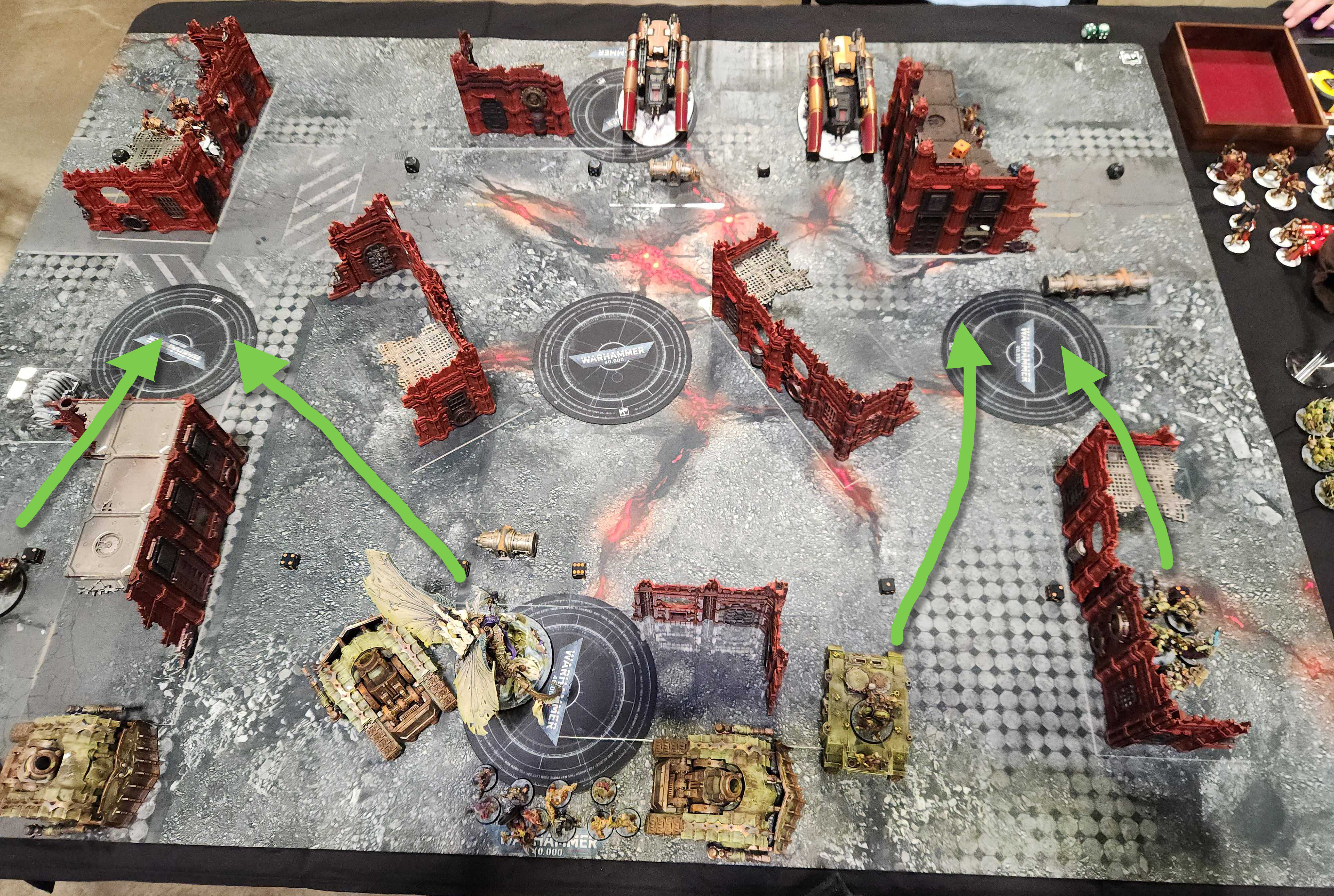 That's less ideal against an opponent who wants to drop half his army on the table from Deep Strike but I can manage here. However it's a big advantage for Purge the Foe, where I can more easily score Kill more by knowing what my kill count target is each turn. My plan here is to move quickly to hold the north and middle objectives and just win by holding 3 objectives to Ash's two on a mission that rewards holding one and more.