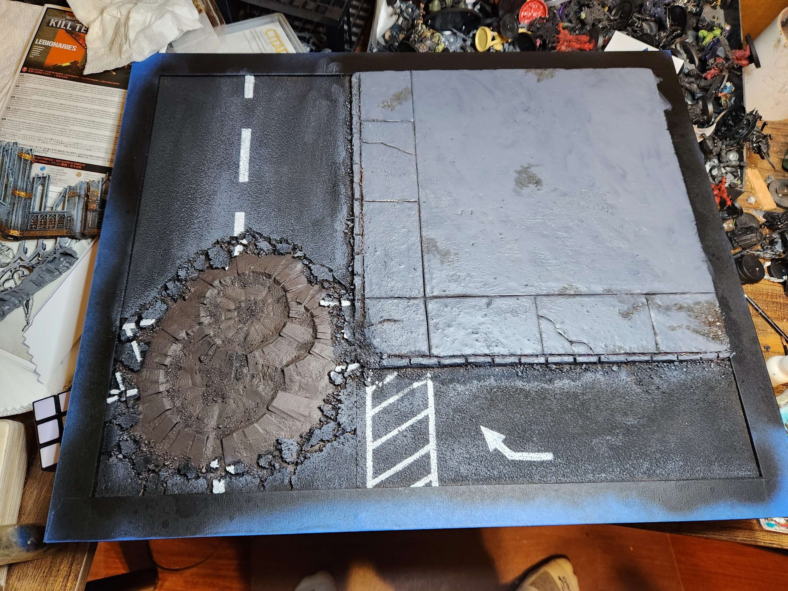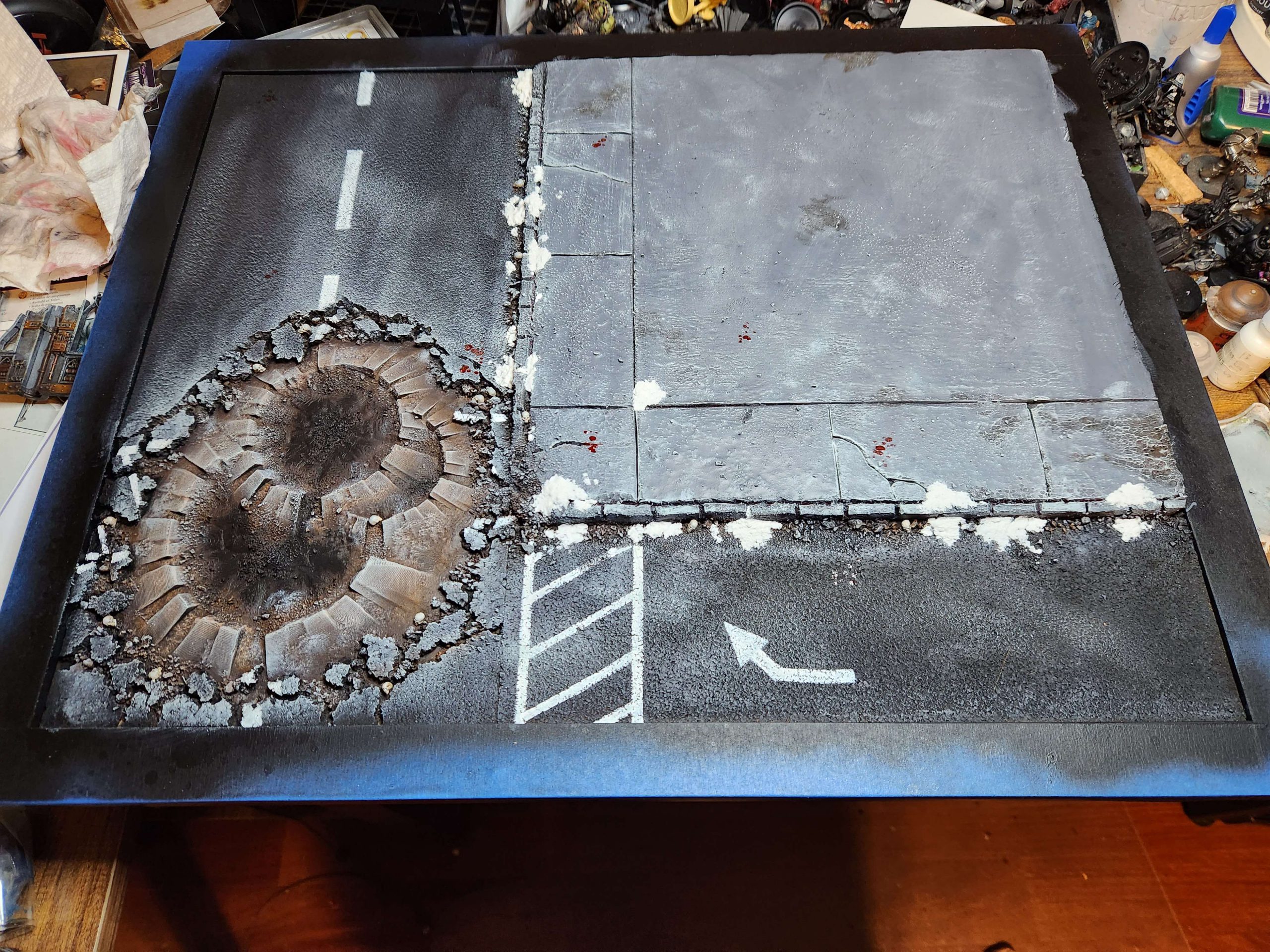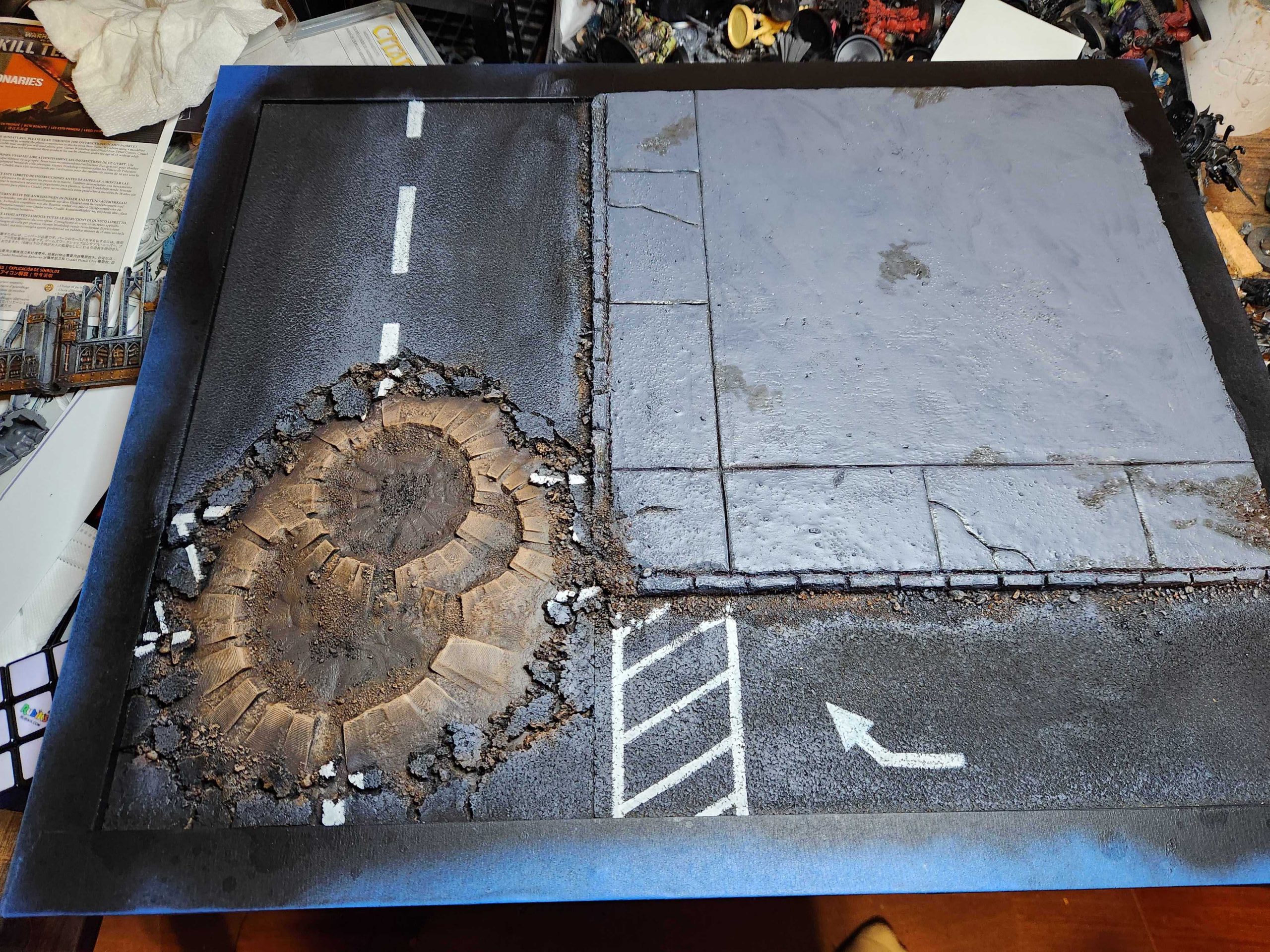 I painted the roads black, added some grey, and painted on some road markings. These go a long way toward giving the street a real feel and make the chunks of road more visible, I painted the crater with Dryad Bark for the base layer.