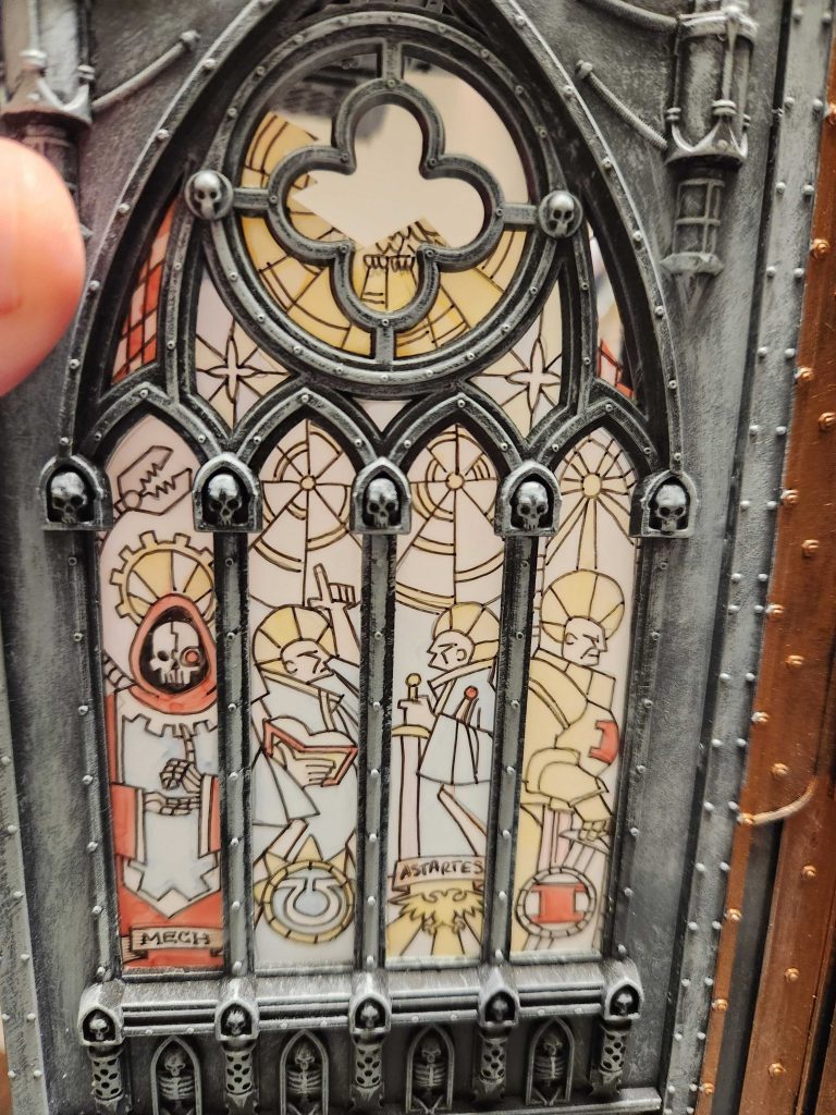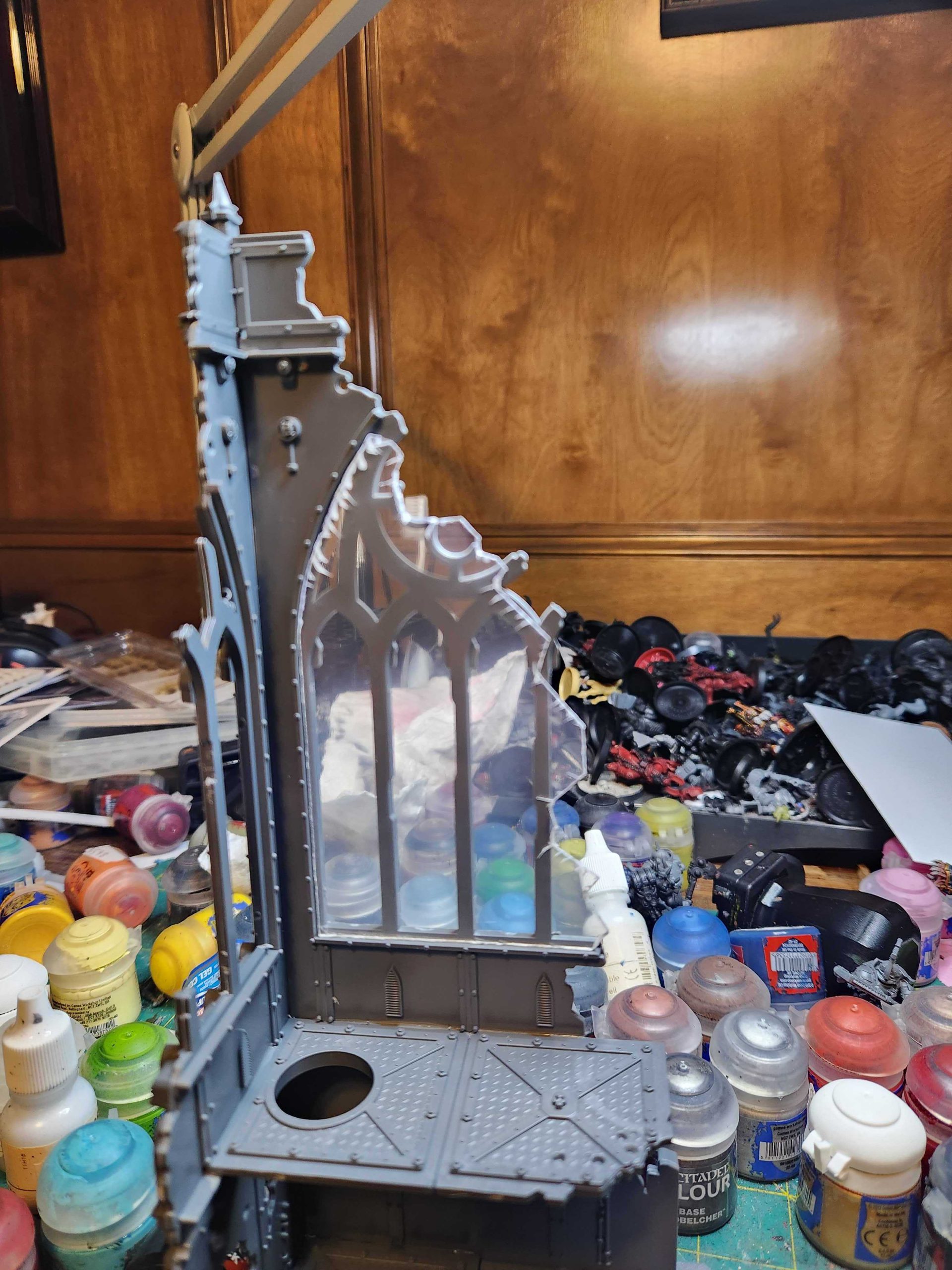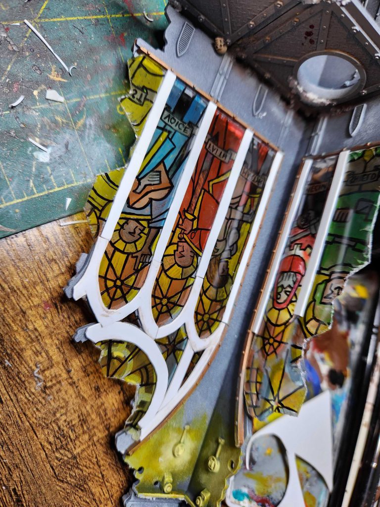 real hard part began: Creating the inner frame. See, you can trivially glue the window to the interior of the shrine of the aquila ruins. That's what I did on my old terrain. But if you do that, it just looks like a big pane of glass with nothing around it. And that's not good enough for best painted. So I painstakingly cut plasticard to fit around the window, then painted it to match the rest of the building.