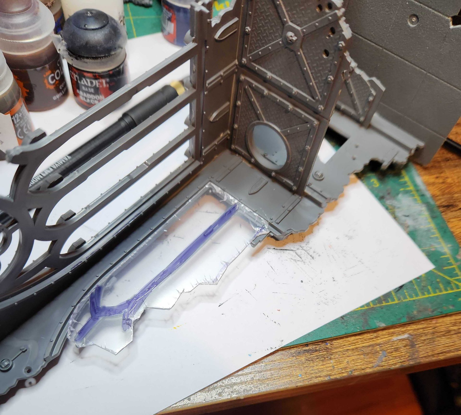 As it turns out, the clear plastic from the frame was perfect for this. I cut some smaller pieces of it to use as windows and fitted them to the ruins. I left the protective plastic film on both sides as I did this, as it would be super helpful to keep that on as long as possible. The plastic is pretty rigid and didn't like being cut, but having cracks in it works for my aesthetic anyways.