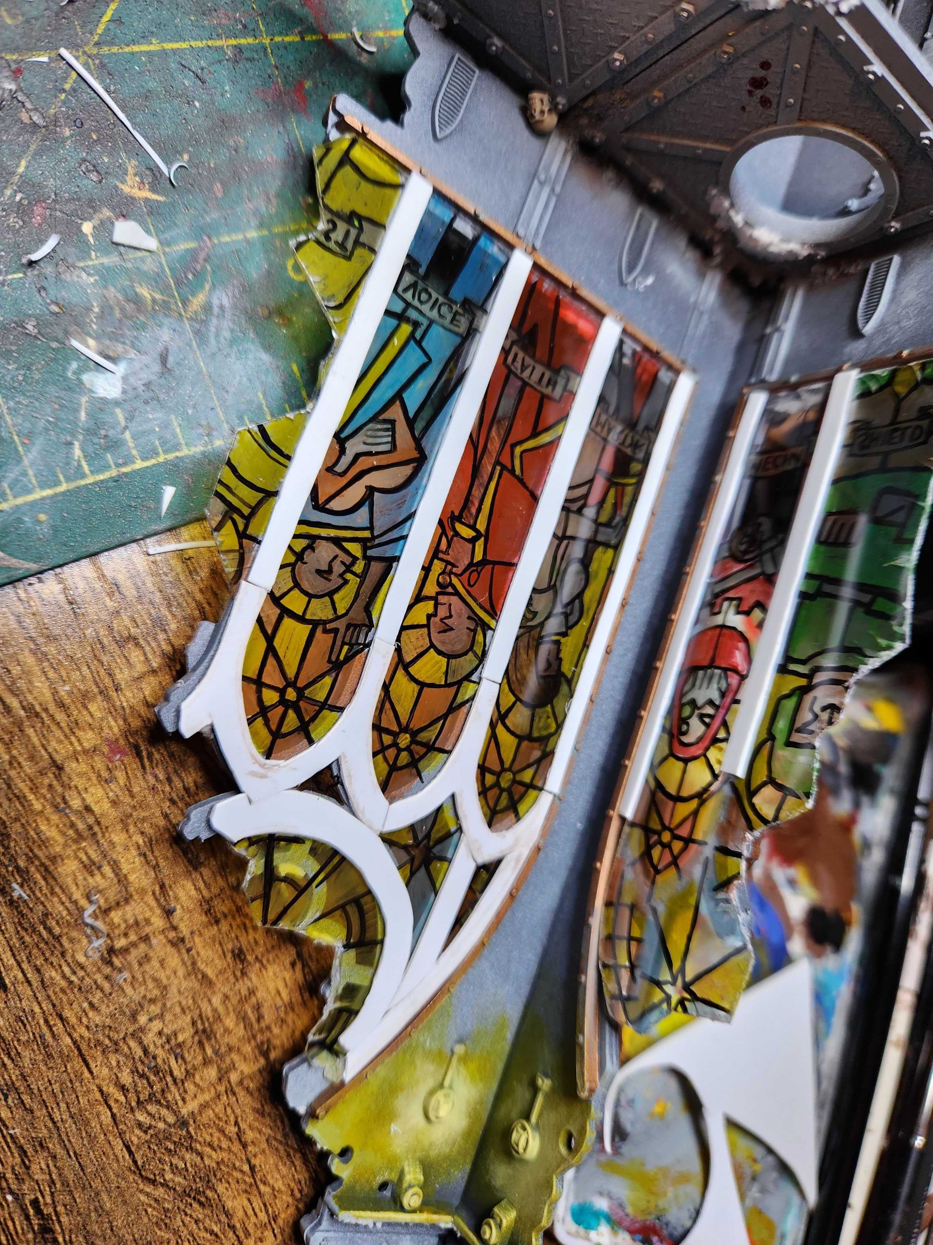 Painting the windows is a multi-step process. I started by roughly sketching what I wanted on the sharpie side using a micron pen. Then I peeled off the plastic on the other side, flipped it over and started painting. I used Abaddon Black to do the lines, making them dark and double-coating where needed. You want these to be opaque when light comes through. I traded the designs from the other side until the whole thing was done, then I colored it in with contrast paints, using very thin layers to avoid pooling. That needs to sit for a while to dry.