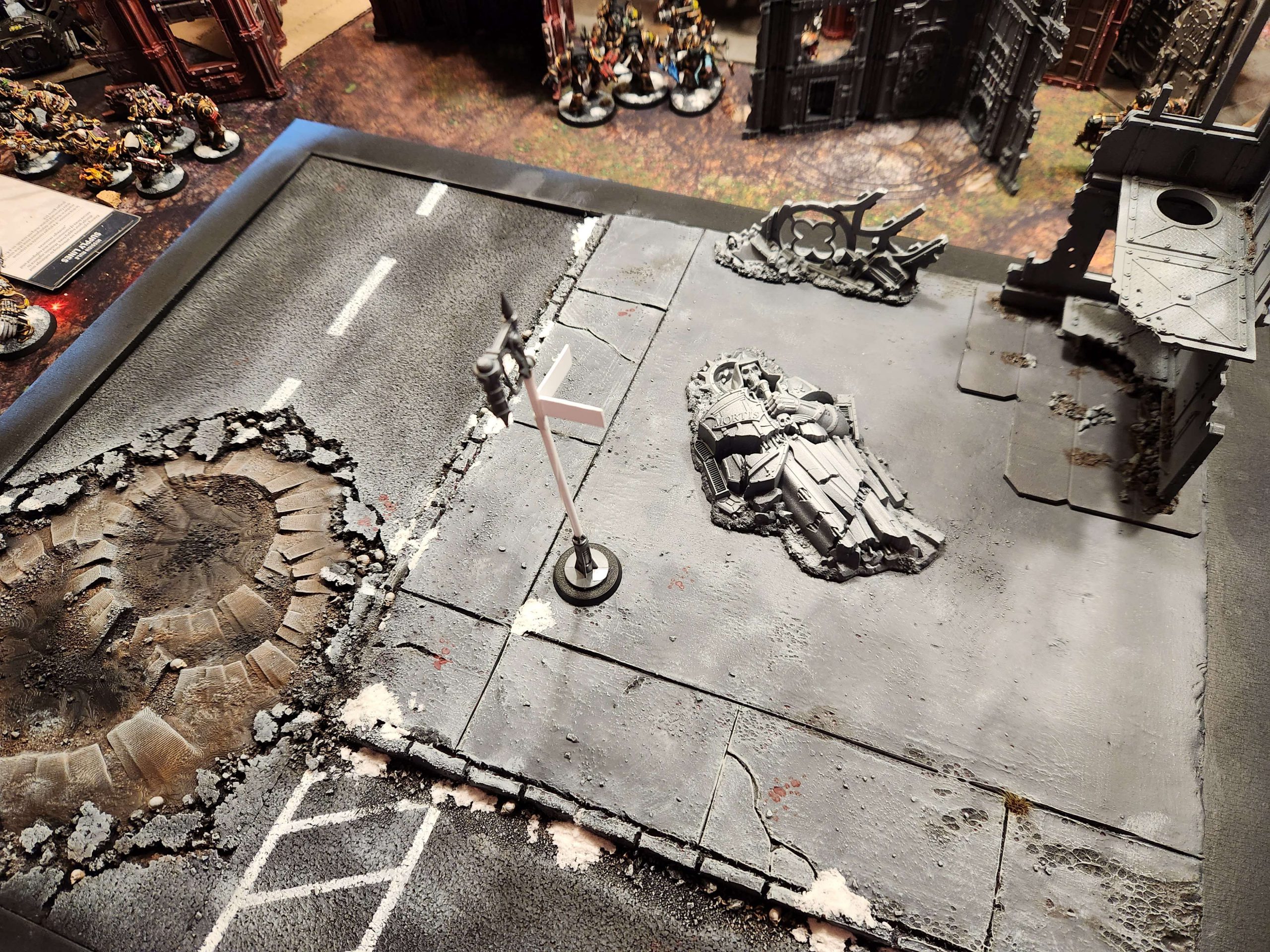 The raised platform was cool but it took up too much space and I didn't want things to be so crowded you couldn't see the board. So I decided to pull it in favor of a smaller ruin element. I went with a tiny corner built from parts of the Shrine of the Aquila, one of the best terrain kits GW ever made. I can pair this with a downed statue and a small piece of ruin (which matches the aquila) to add some interesting visual elements to my sidewalk block without eating up too much valuable space for the models.