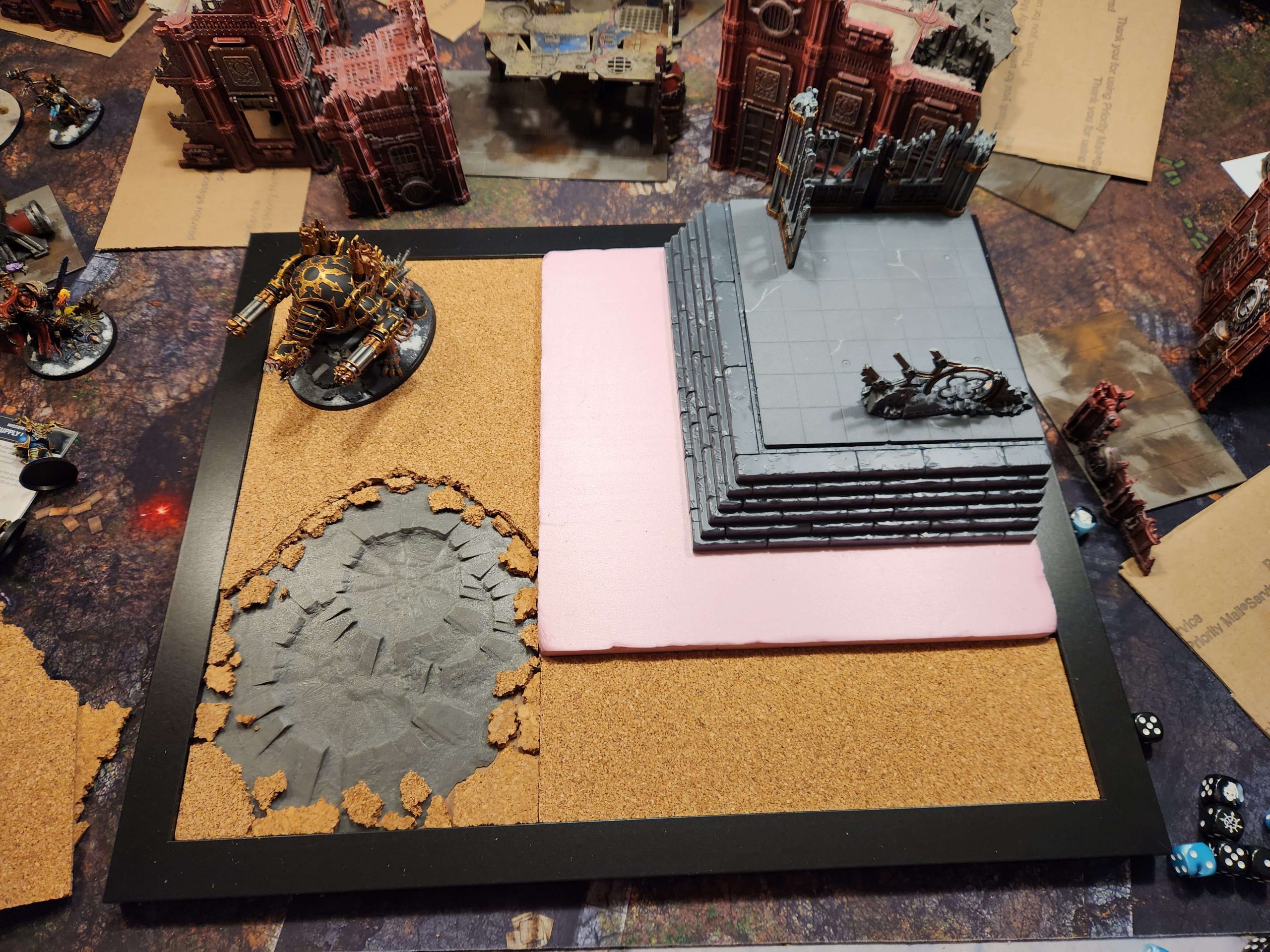 This time around I want something with a more urban feel to it. My original plan here was to do a city block with a raised sidewalk area leading to another raised platform with steps, using the leftover part of an Age of Sigmar ruin I had already cut up to build the stairs to my
