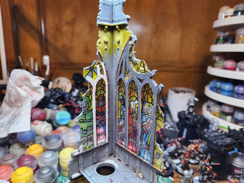 After that, all that was left to do was the rest of the scatter terrain. I added a couple more stained glass pieces to the rubble, then painted up the broken statue and the street light.