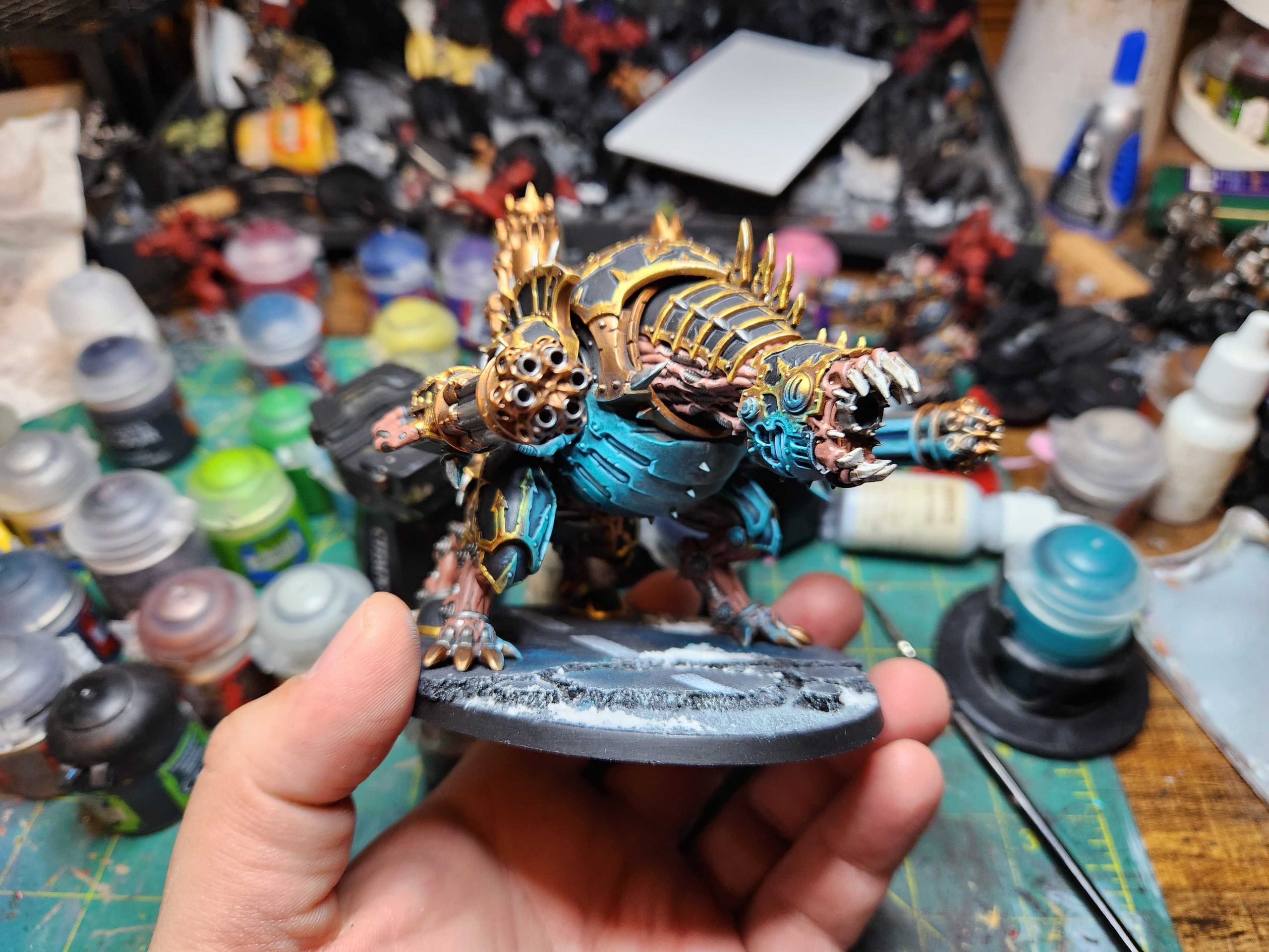 The net result really works to brighten up the models and the only shame is that you have to get down to model level to really see it, but it's striking enough you notice from above and it draws you in to that level. I also touched up the Warpsmith a bit, adding some more OSL effects to him and doing a second pass at his highlights.