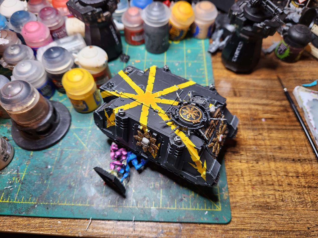 I did similar work on my Berzerkers, who needed the second level of grey highlights, then turned to my vehicles. Both my Rhino and my Land Raider needed some love. In the case of the Land Raider, I added a bunch of freehand details and runes to break up the monotony, and added some gray dust weathering to help it blend in with the display board and rest of the army. For my Rhino, I added shading to the chaos star painted across it and a second layer of celestra grey highlights. This was basically a process of shading inside the star with