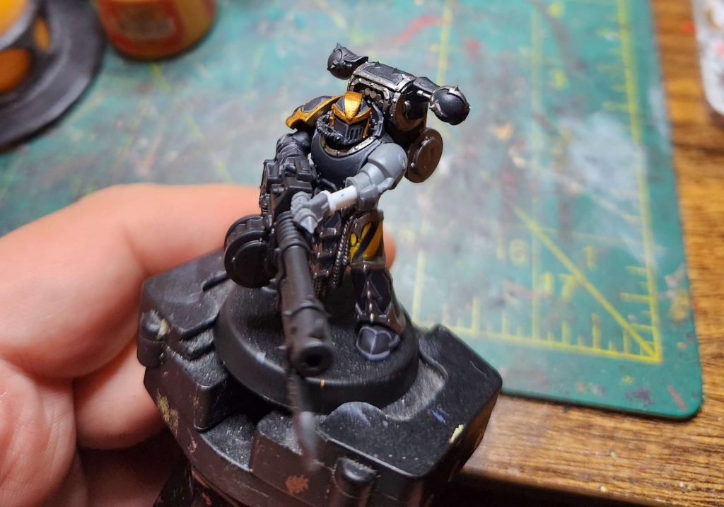 Imperial Fists Contrast paint and Fuegan Orange shade, then edge highlighting with Dorn Yellow.