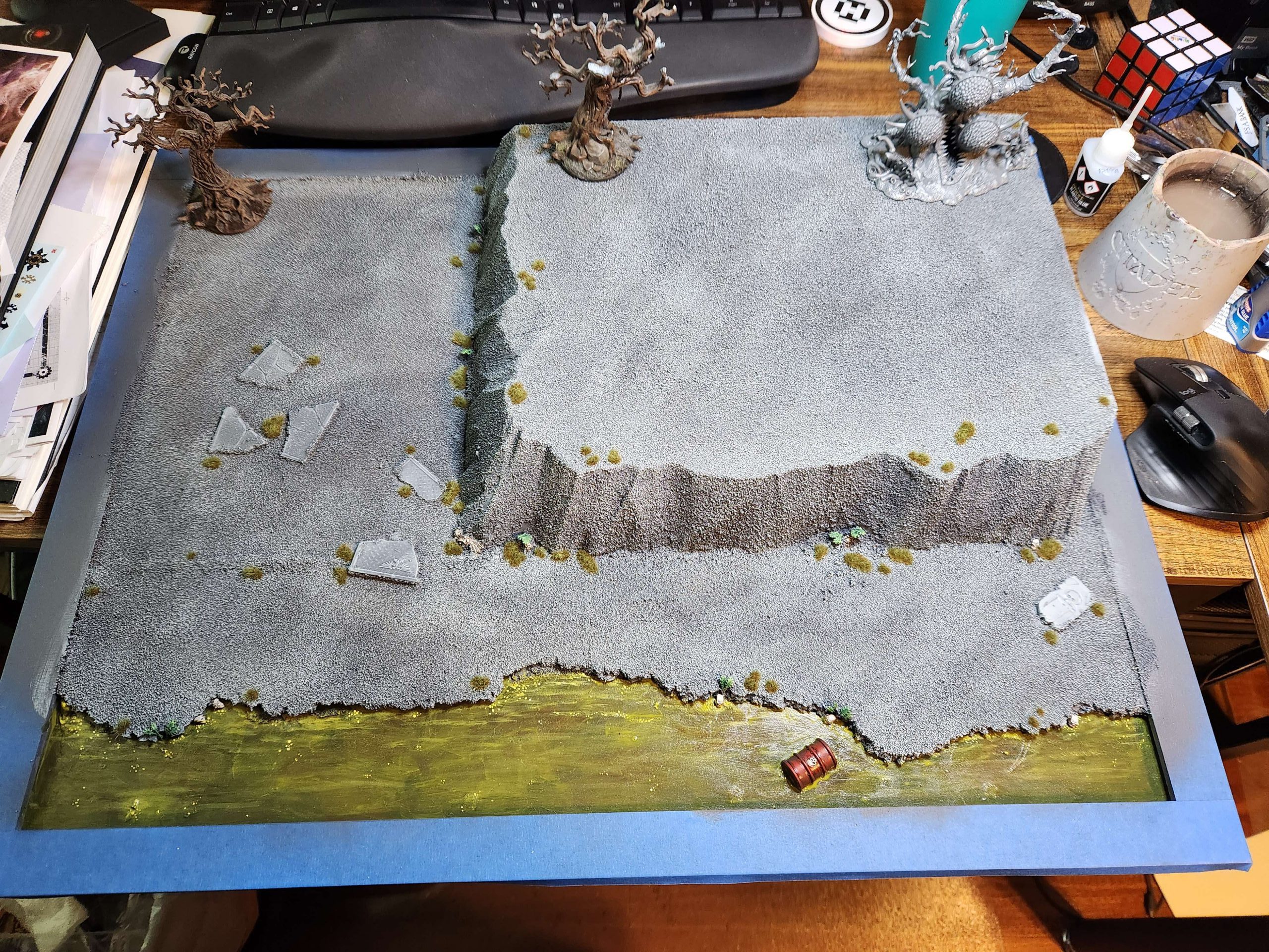 Next up it's time to add the first coat of paint to seal the board. Super glue and spray paint will eat the foam so I need to make sure it's protected before I start really going to work on it. I use a can of gray latex paint I had custom mixed to be Astrogranite Gray a long time ago. Once that's down I start adding bits and pieces of additional detail - ruined barrels and pieces of floor, skulls, barbed bracken, and so on.