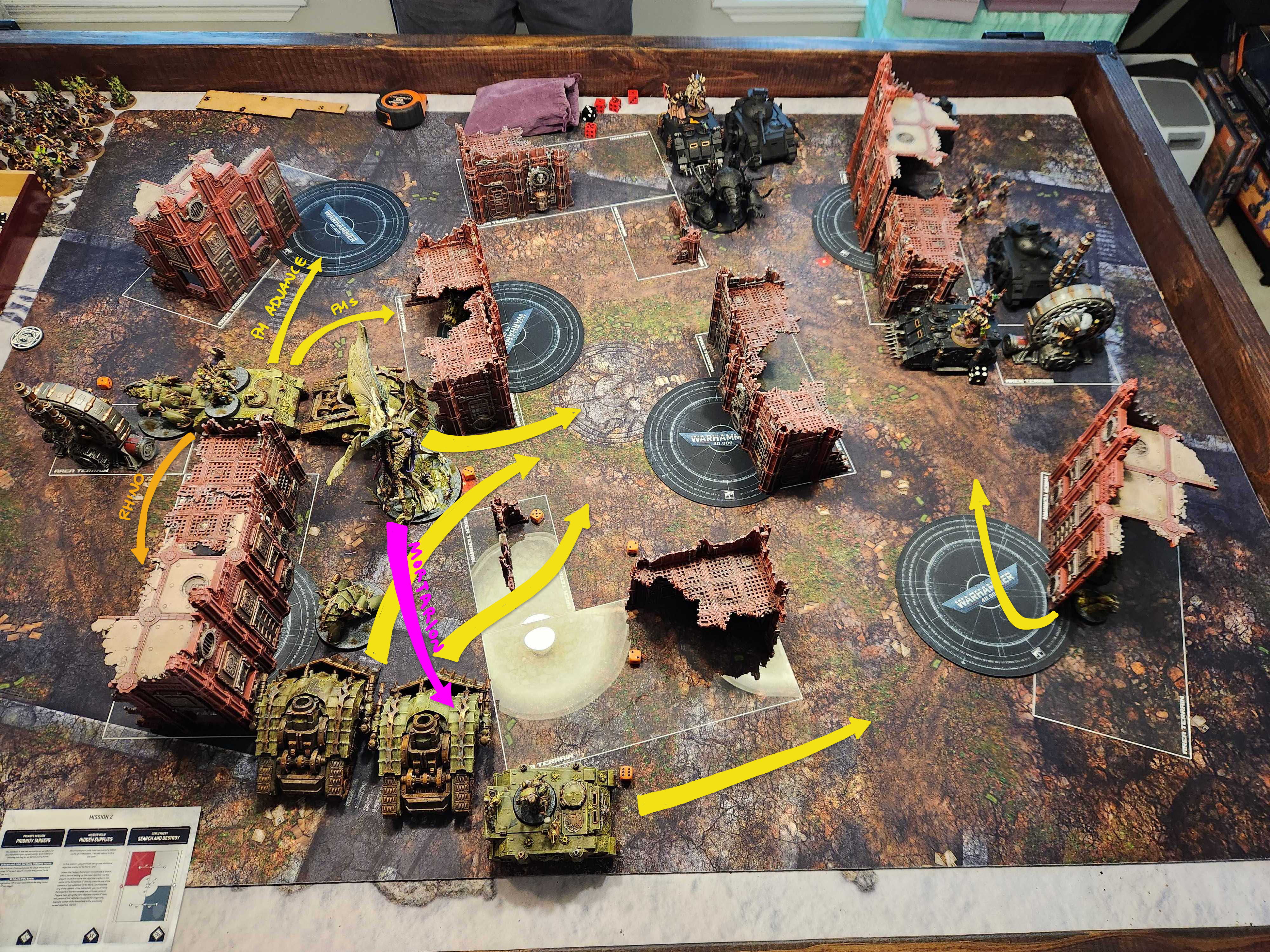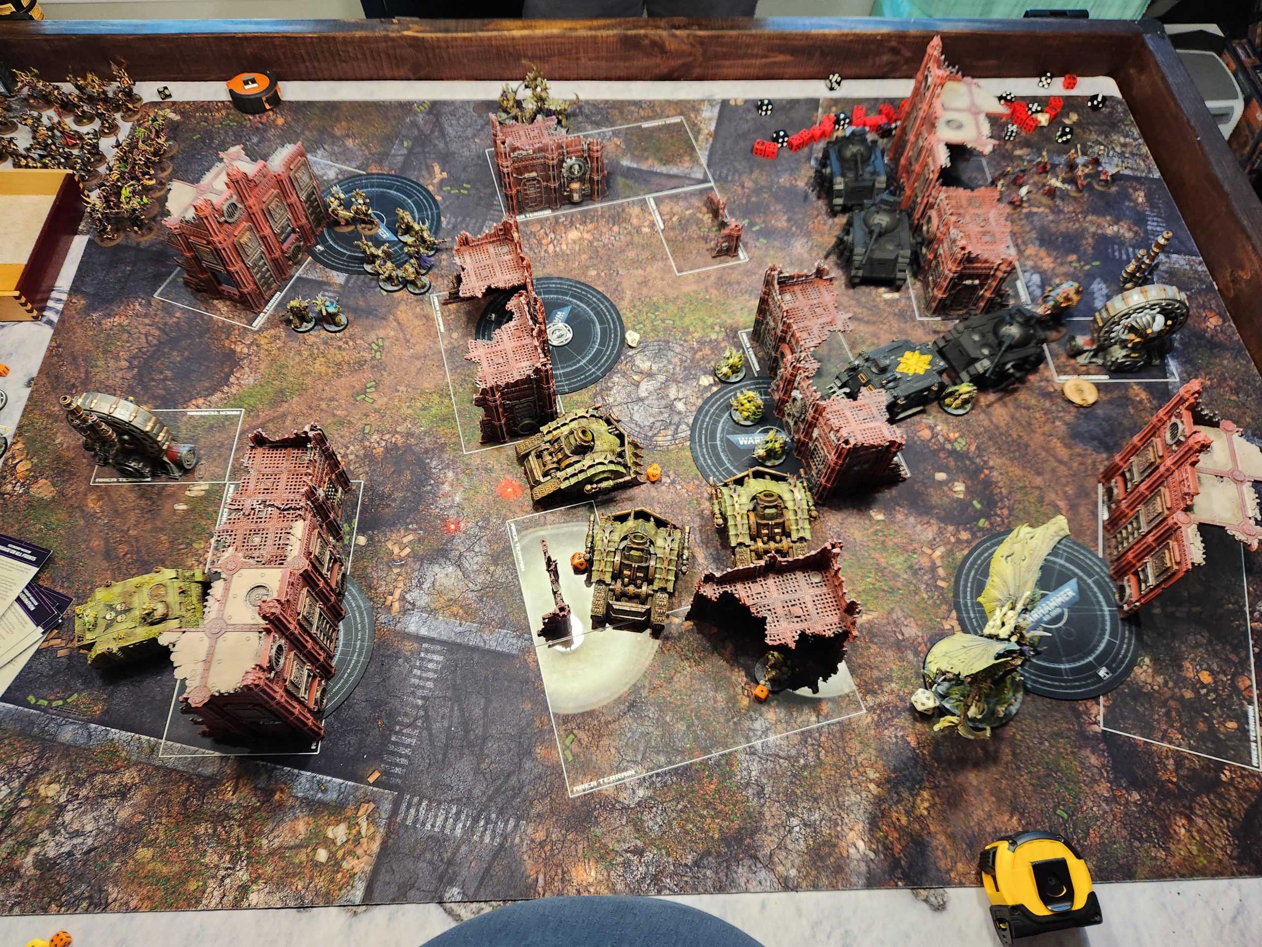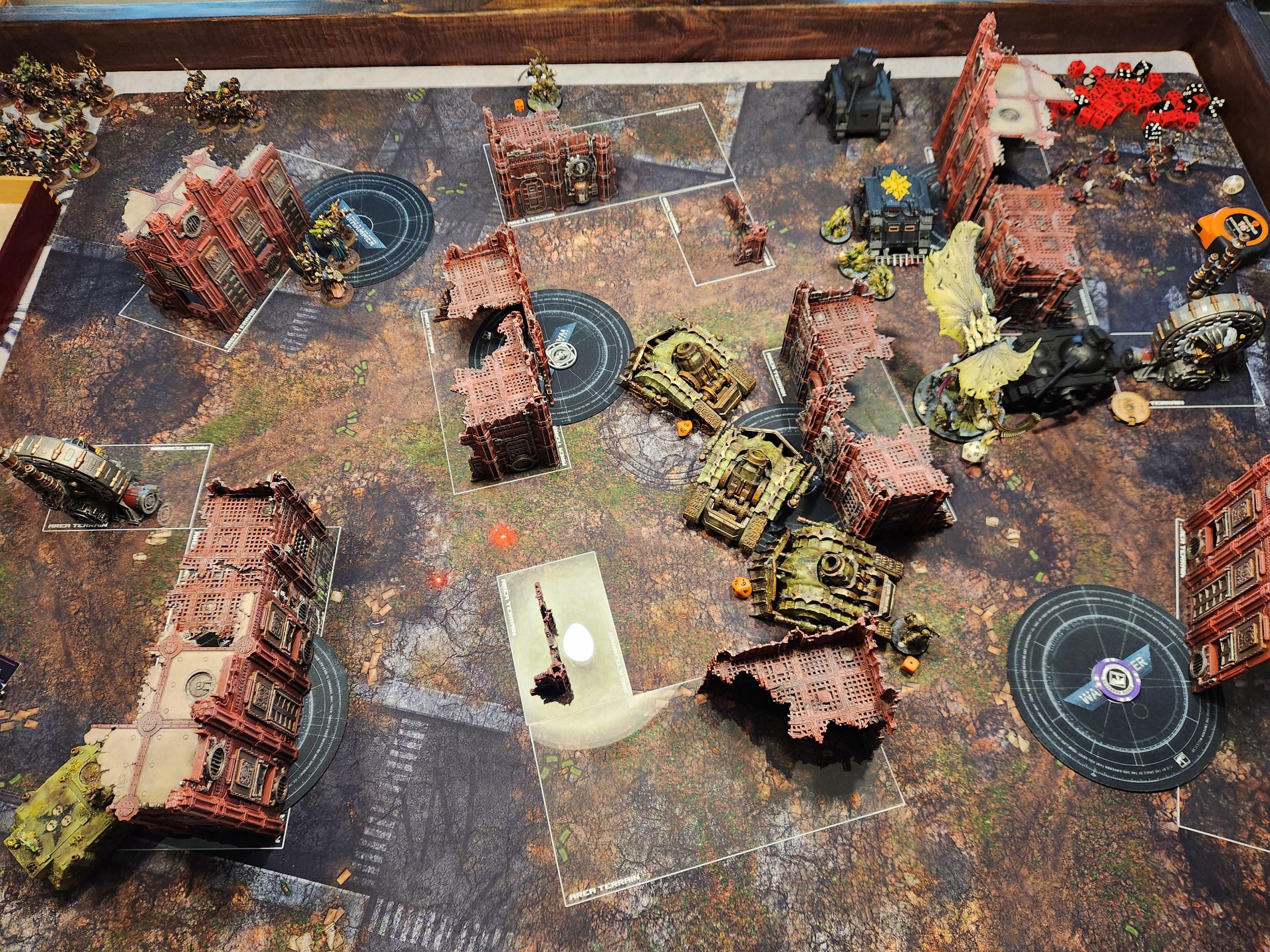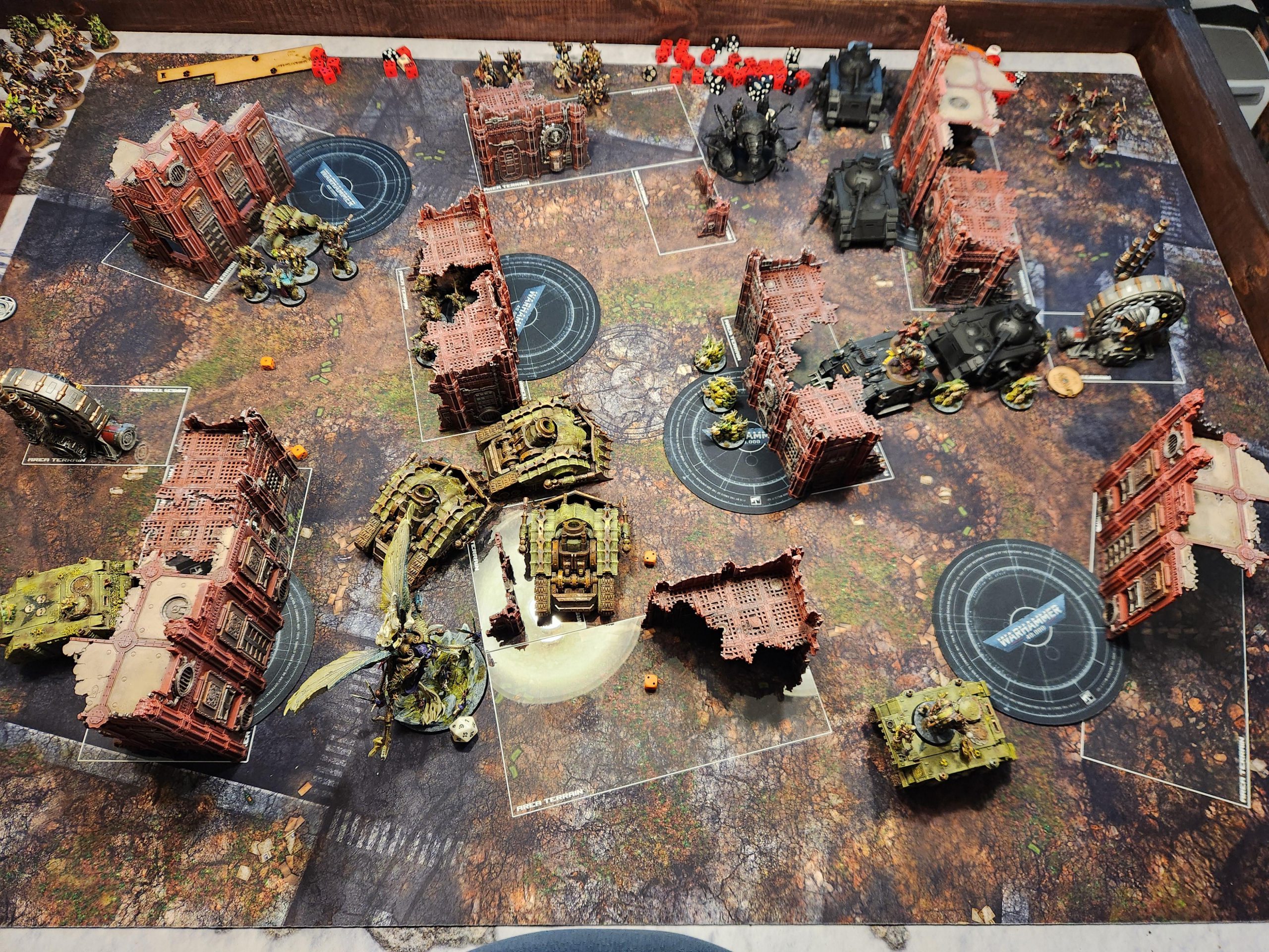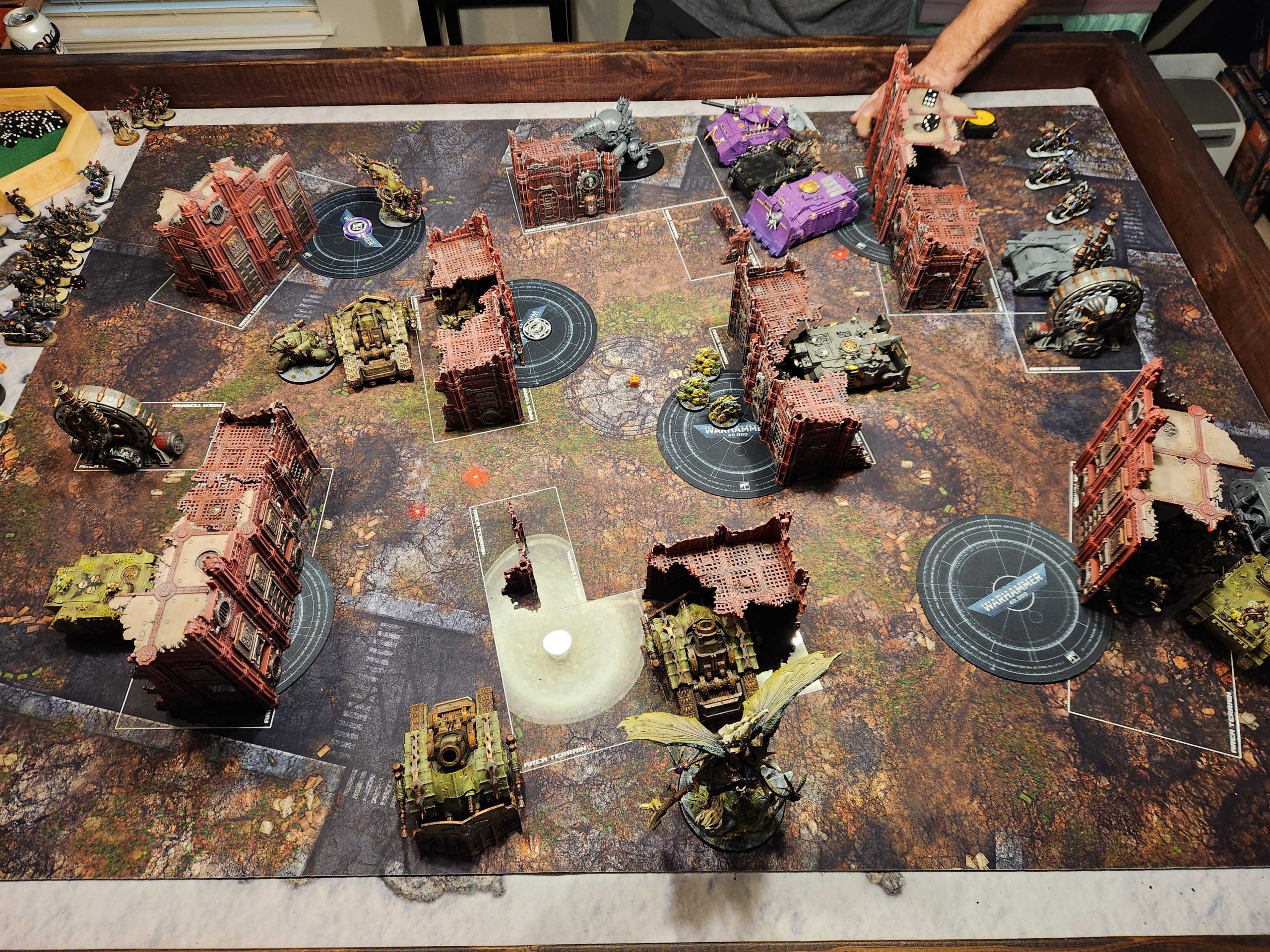 I played things pretty safe turn 1, staying out of line of sight and working on some better angles. I did the same trick again with my Plague Marines on the upper left objectives, this time getting a better advance roll to hide in the ruins and using my Fleshmower for support. I don't have as many photos of this game but it was pretty wild. There was a ton of back-and-forth and while on the whole our dice tended to be average, it was in that "rolling lots of 6s and then lots of 1s" way where we'd go back and forth spiking rolls in ways that made things kind of ridiculous.