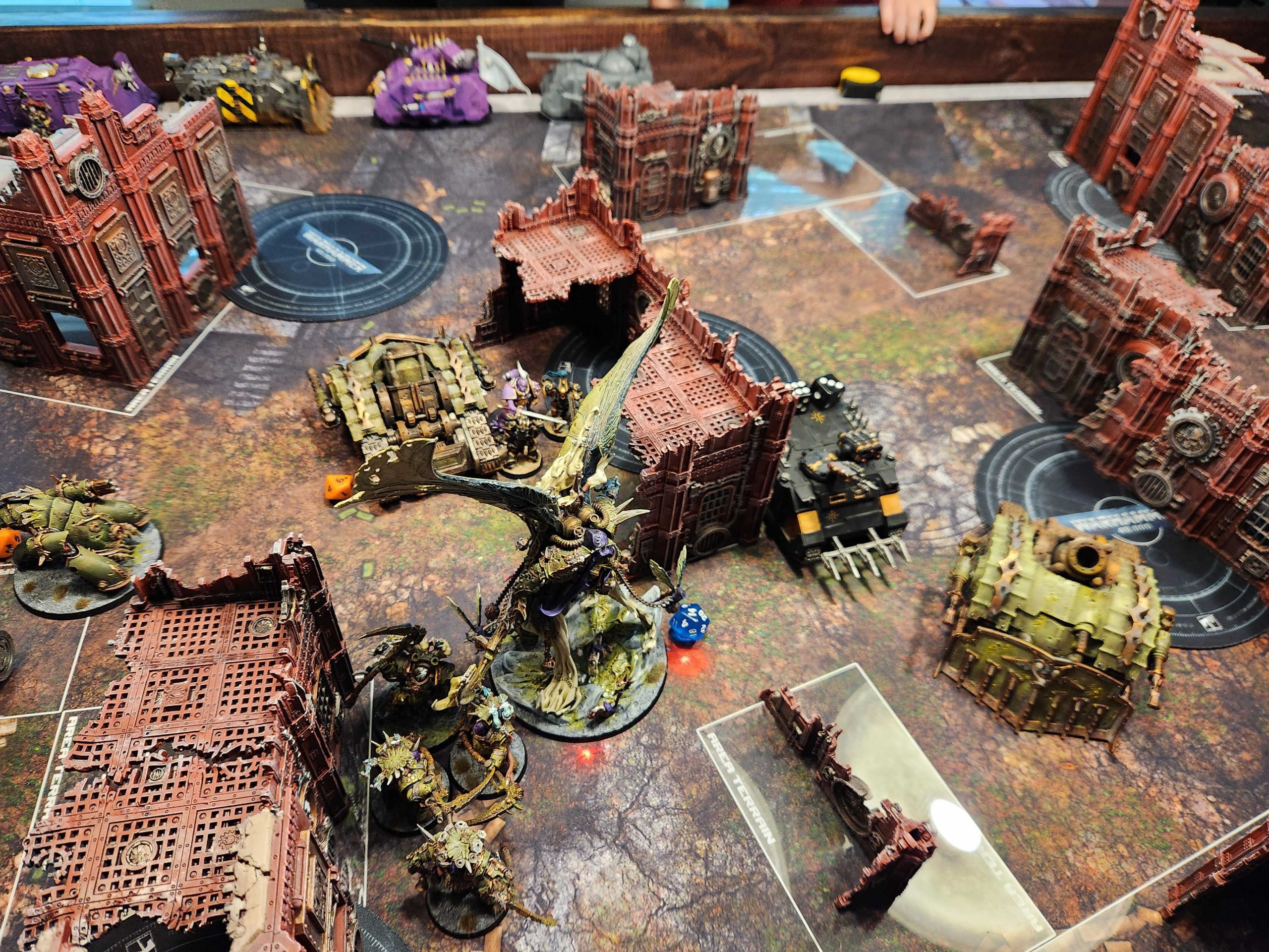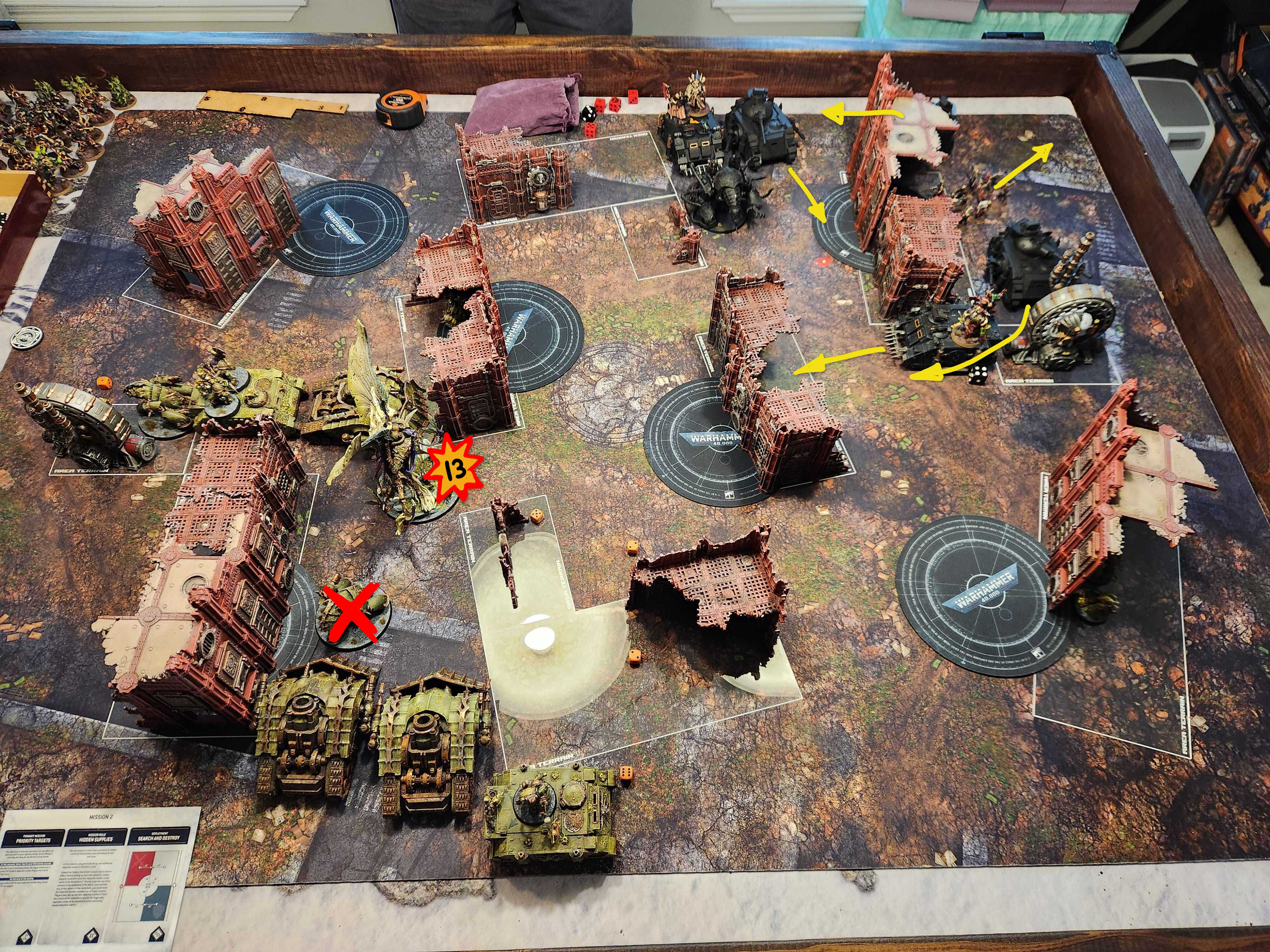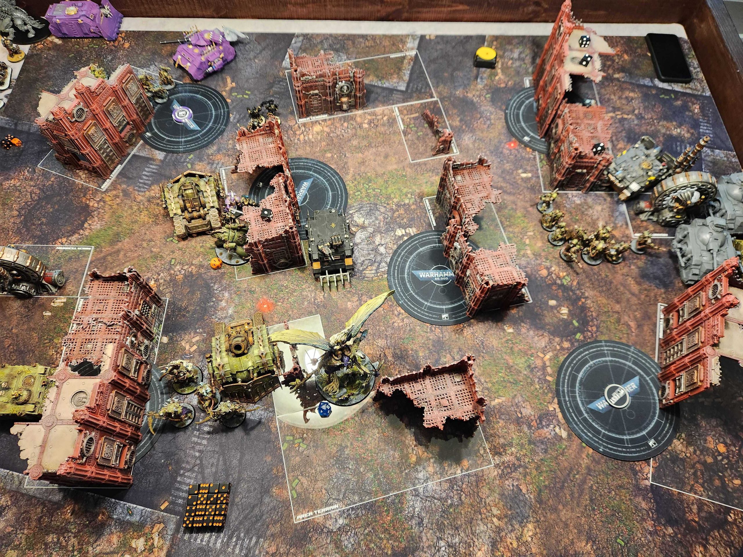 This was a game I ultimately felt I shouldn't have lost - I managed to put a steady hurting on Erik's units and removed them from the board before they could make profitable trades. Erik for his part kept pushing for points, and ultimately beat me on card draws - I had a disastrously unlucky final turn, pulling three unscorable objectives and losing by four VP. Likewise, Erik pulled the coup of the game with a 10" charge out of reserves on his bikes in round 4, getting insanely lucky and doing 10 damage to my rhino with the two power fists in the unit and allowing them to sneak onto the lower right objective, allowing him to get to 50 VP on primary instead of 45. Just a perfect storm at the end to cap things off but it was part of a trend Erik noticed much earlier - I'd just been having really bad secondary all game to that point, pulling unscorable objectives turn after turn when trying to overcommit to score them would have lost me the game. Meanwhile Erik had been reliably pulling 6-8 per turn and staying just far enough ahead. Brutal loss but I don't think I'd chalk this one up to play mistakes.