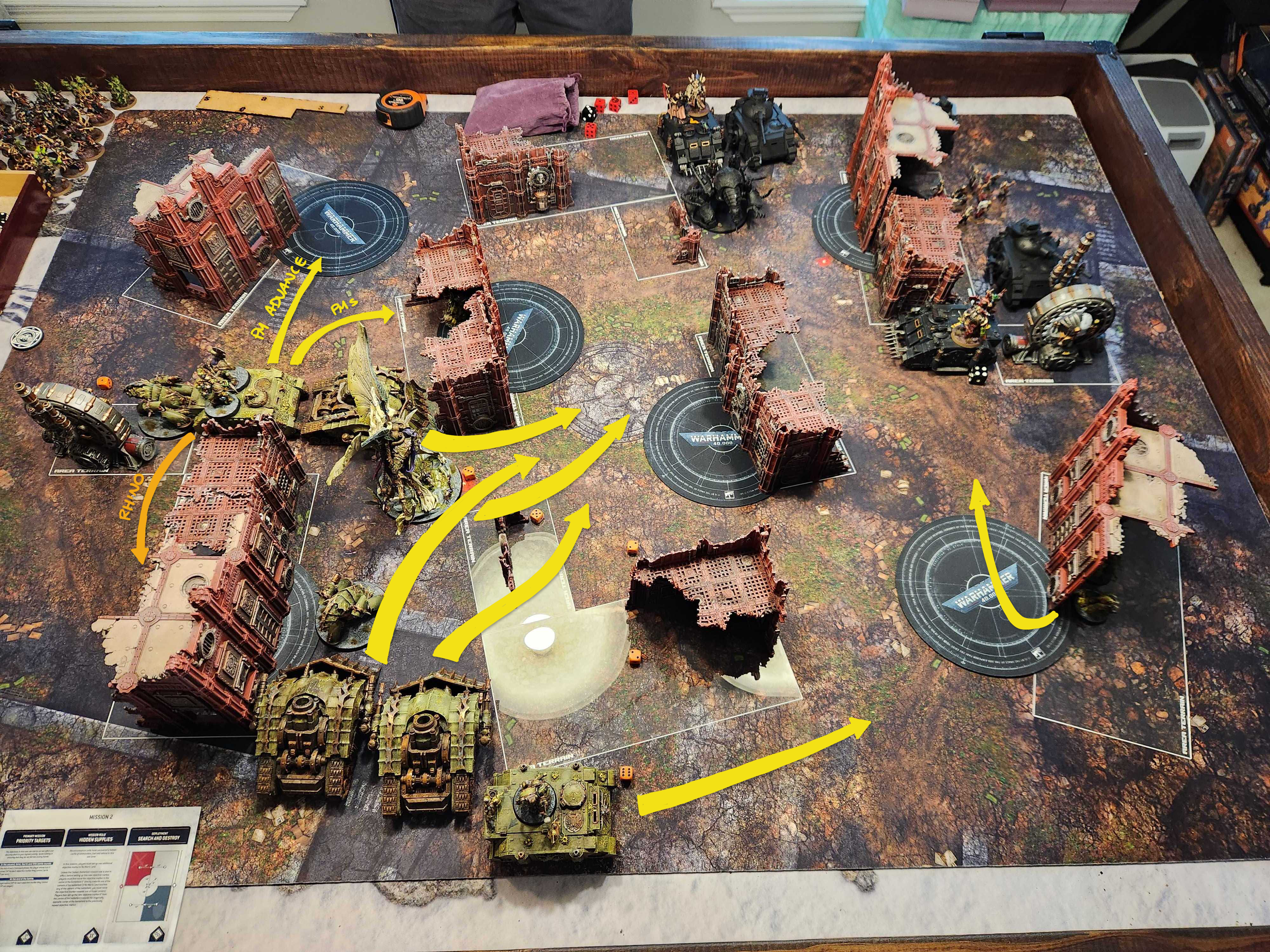 Up top Dan sweeps into my units on the objective and loses a few models to Overwatch but is in good position. His other Predator makes short cross-table work of my other MBH and his Legionaries + MoE drop my Plague Marines, scoring one CP in the process for killing my Putrifier.