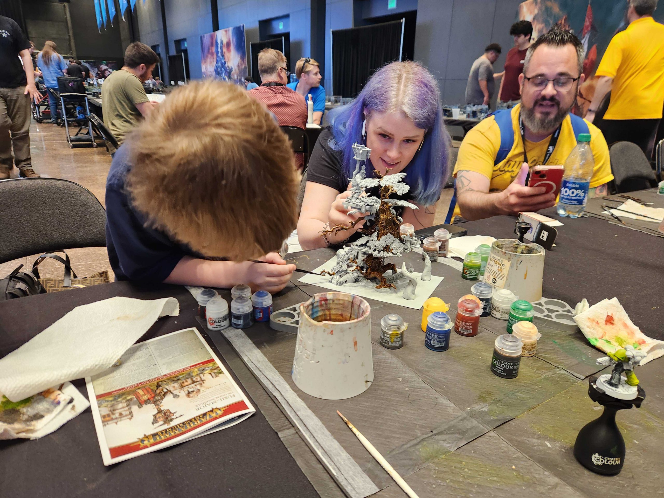 They're mostly working with Contrast paints, though we have a few extras Bryce had stashed in his minis case and those are going to be a real lifesaver when it comes to painting things like metal armor. The Contrast paints are a good set for Bryce to work with, though - he's very good at covering large areas with a single color. Really the two of them just need direction, so I offer some notes on how to apply them. The wife is more a builder than a painter.