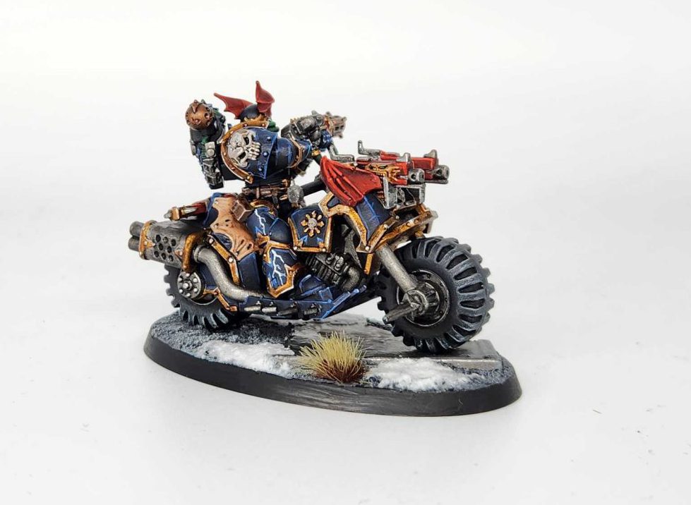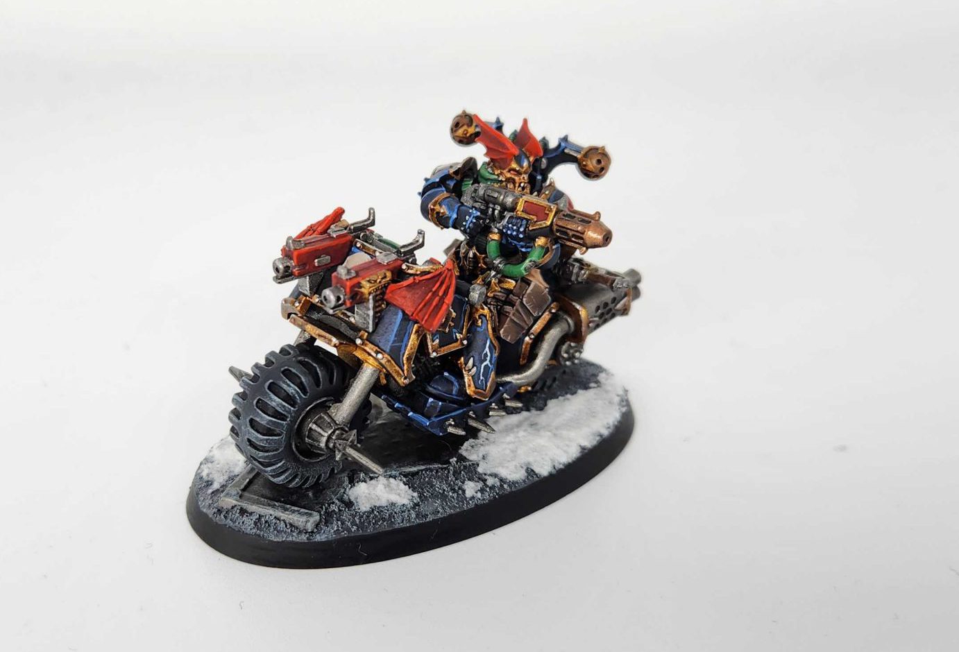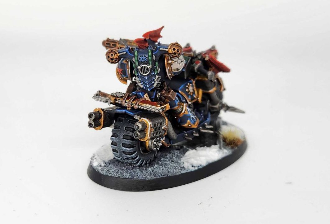 He turned out pretty well! I'm very happy with this so far - I think he looks great, and the effect of putting a modern Chaos Marine on a classic bike definitely works visually. There are a few rough spots on there, but they're nearly impossible to see without getting into the nooks and crannies of the model, and having him on the larger, 75mm base with some extra decoration really helps tie the whole thing together. I just have two more of these to paint and I think when they're done they'll look fantastic.