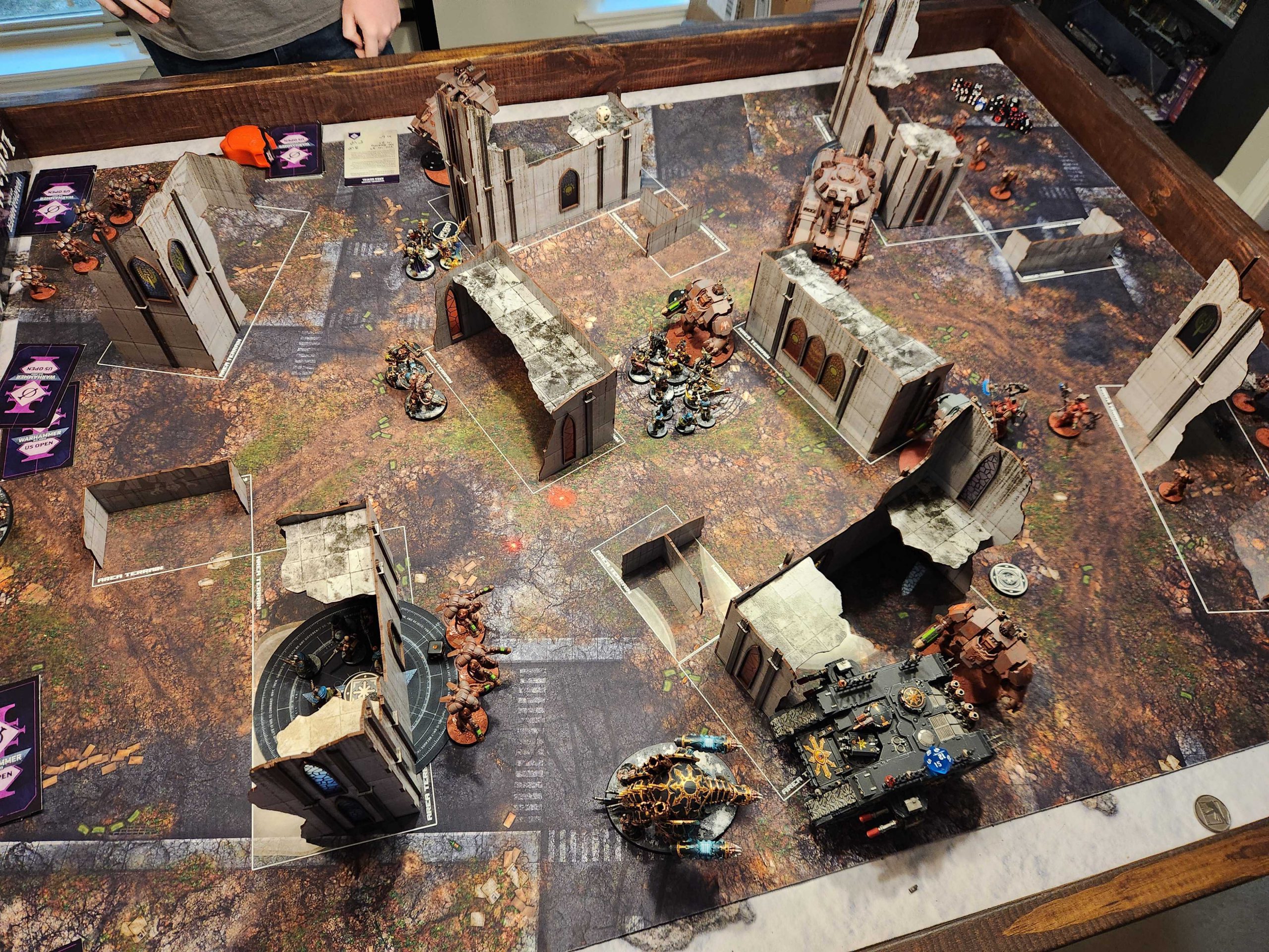 I'm playing against Andrew and immediately I realize I've made a horrible mistake when he trots out the Ironstorm list he took to the top 8 at the recent US Open event in Dallas. I'm running a relatively elite, vehicle-heavy build against an army with three Redemptors and two Repulsor Executioners. In our first game I misdeploy and Andrew's able to get shots on my Land Raider and kills it and a Forgefiend turn 1. I concede and we re-rack and I adjust deployment to the shot above.