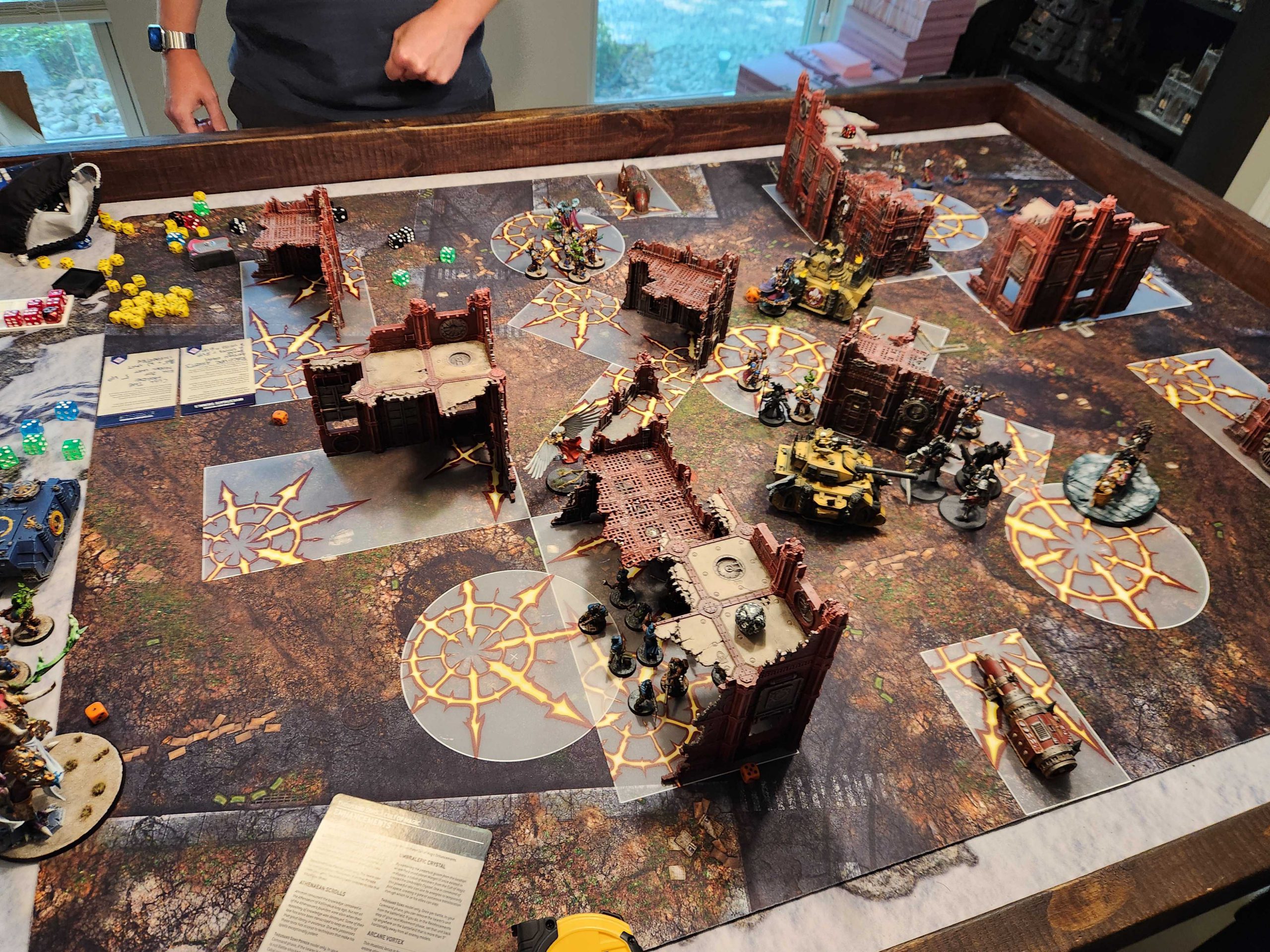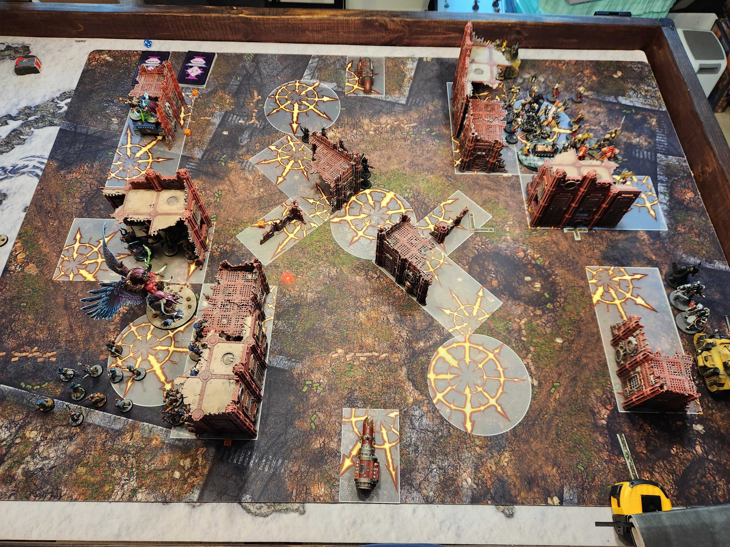 It took T two turns to score Cull the Horde when my Scarab Sorcerer survived and he followed that by drawing Marked for Death and spending two turns trying to score that. T struggled to take out my Scarabs with his Paragons, in part because I kept re-rolling saves and blanking him to avoid losing models. Ahriman swings around and destroys the Immolator and I'm able to hold T to 5 primary in the final turn. All said and done I've gone 5-5-15-10 on Primary while T finishes 10-10-10-5, so we tie it up at 35 there.