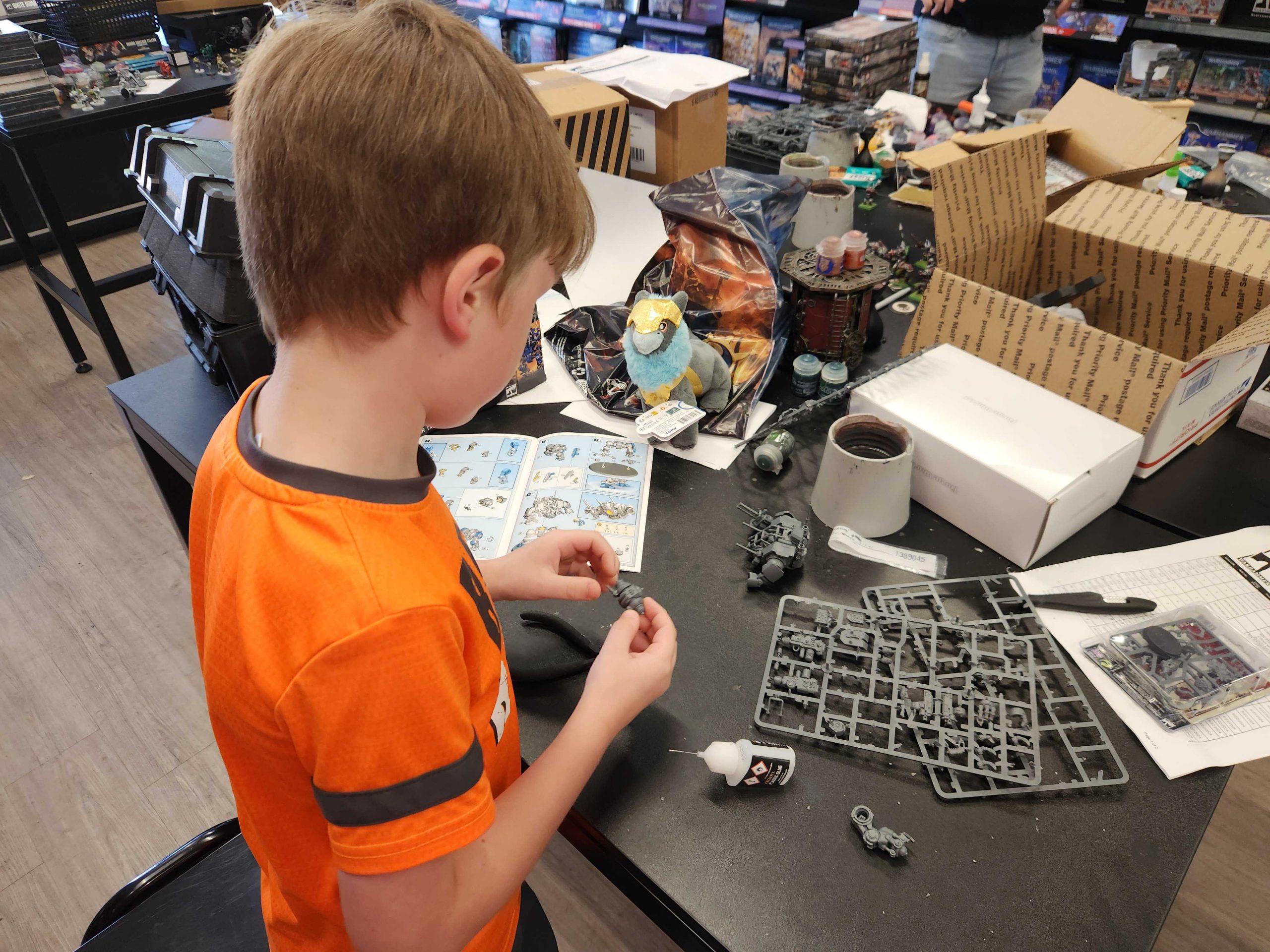 We finish assembly and get stamps in Bryce's workbook and there's apparently a prize for doing this: Max, the store employee, hands Bryce a custom Games Workshop bitz box. It's a pretty solid little piece. It's obviously not amazing as a free bit of swag, but it holds the bitz Bryce has left over and it has removable tray walls to change container sizes. Bryce immediately fills it.