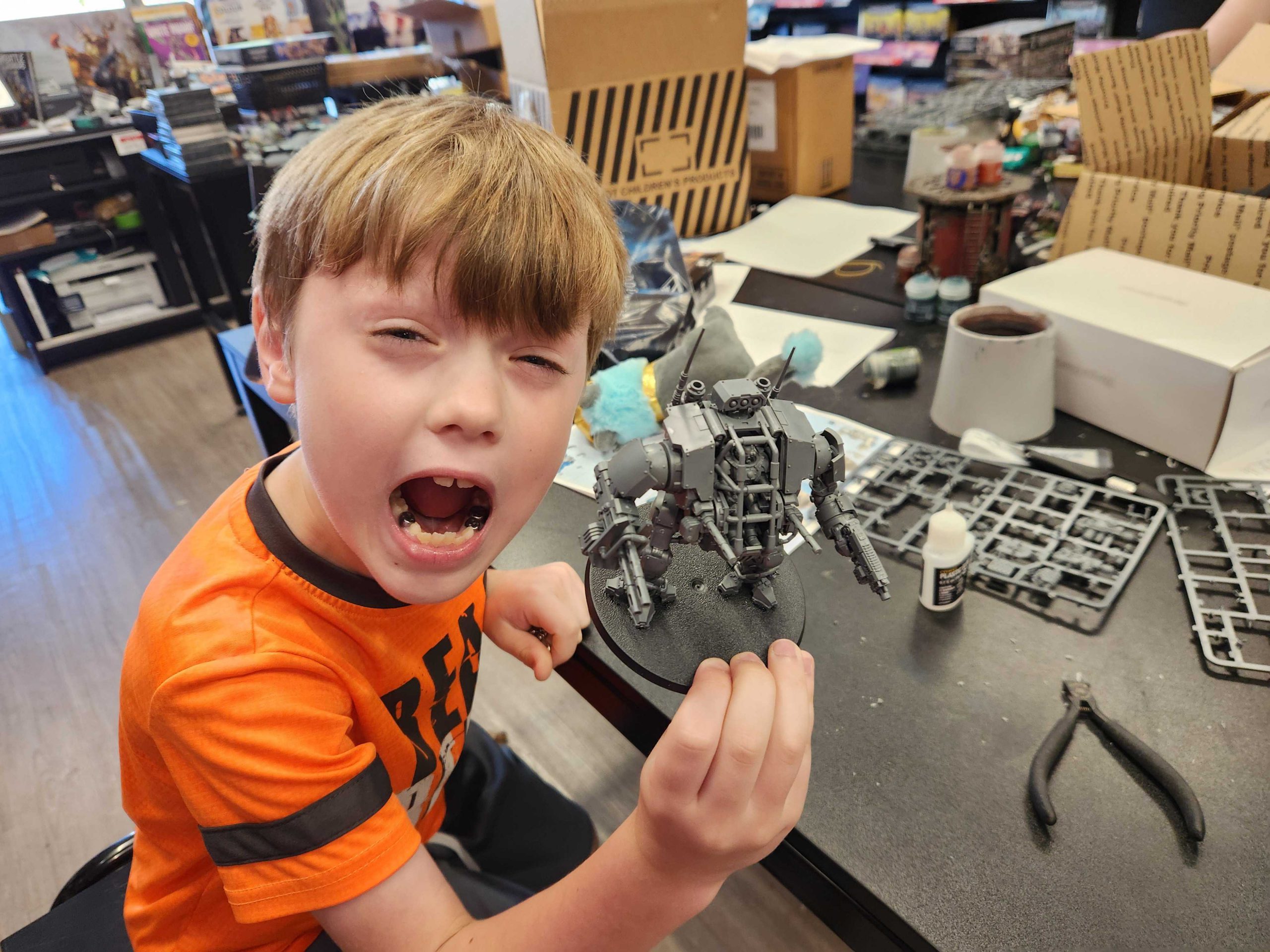 My other big hobby progress this past week involved working with my son, Bryce, to build his first vehicle. We're slowly working our way through the Games Workshop "Build. Paint. Play." guide and while he's painted a character and five Assault Intercessors, the book next calls for his first vehicle. He picked out an Invictor Warsuit a couple weeks ago so that's what we've been working with. It's a bit of a hateful kit to assemble, but tag-teaming it we make decent work of it. We hit up the Warhammer store on Saturday to get some progress done.