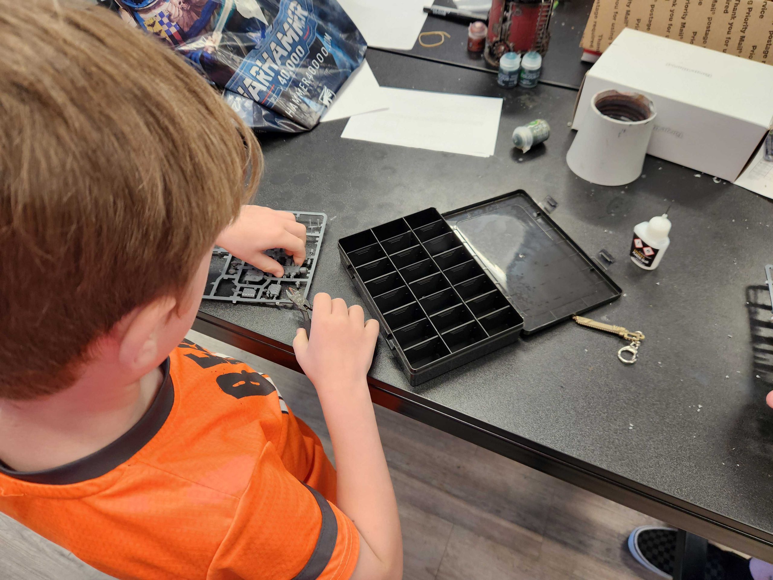 Bryce is solid with clippers but isn't old enough or experienced enough yet to use a hobby knife for trimming/cleaning parts he's clipped. We'll likely approach that in another year - he just doesn't hold the knife right or sure enough to be doing that part yet, so the process is mostly him identifying from the instructions which parts to clip, cutting those out, then I clean them and glue them together. We get most of the warsuit done on Saturday, then come back the following Tuesday afternoon.