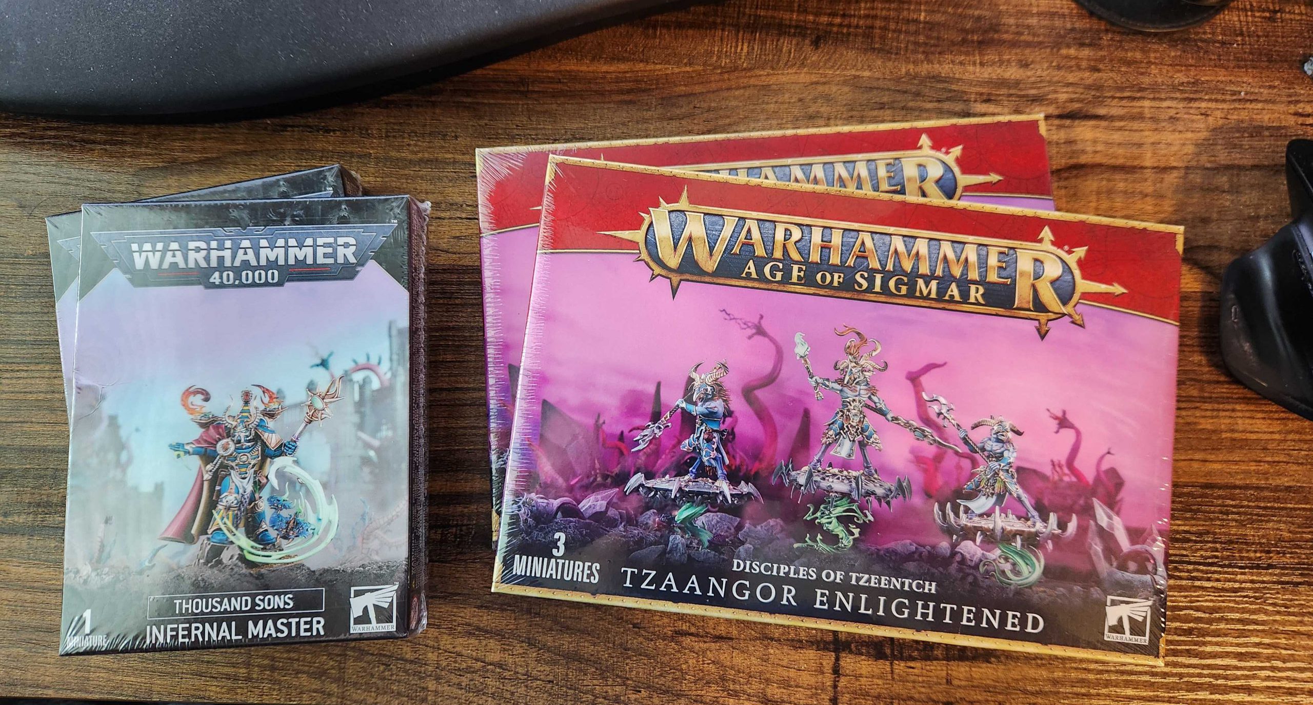 Last time around I threw around a few ideas for my updated Thousand Sons list. I'm still big on using a brick of ten Scarab Occult Terminators, so I'm mostly playing around the edges. I'm pretty loathe to drop the Rhino, as I think it gives me some much-needed mobility and another unit to do actions when I need the Rubrics to shoot. On that note, actions are a big issue I need to address in the army generally - it became apparent pretty quick that one unit of Cultists wasn't enough for those turns when I needed to do 2-3 actions. So I'm putting Ahriman on foot to gain 10 points, swapping out a Sorcerer for a third Infernal Master (5 points gain), and dropping the Cultists (55 points), which gives me a total of 70 points, and with the remaining 20 I pick up from the points drop on the Scarabs I can fit two units of Tzaangor Enlightened.