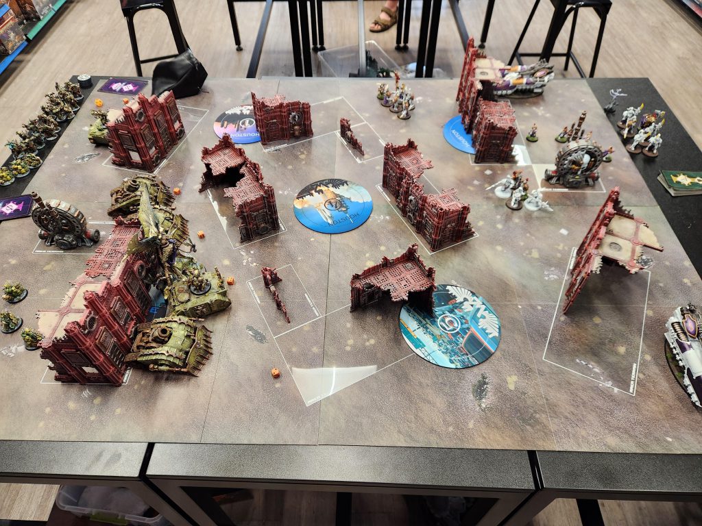 At this point things have gotten pretty far out of hand. Trajann's good but not kill-mortarion-in-one-round good and without a unit to lead he'll quickly get ground into a paste by the -1 save effect. Colin brings in his remaining custodian unit and assassins the following turn but he's only scoring 5 on primary and making that up is going to be tough, especially as he draws some bad secondaries. It's pretty much over heading into turn 3 and we call it. I don't have time to re-rack and play another game but we talk about what could have been done differently.