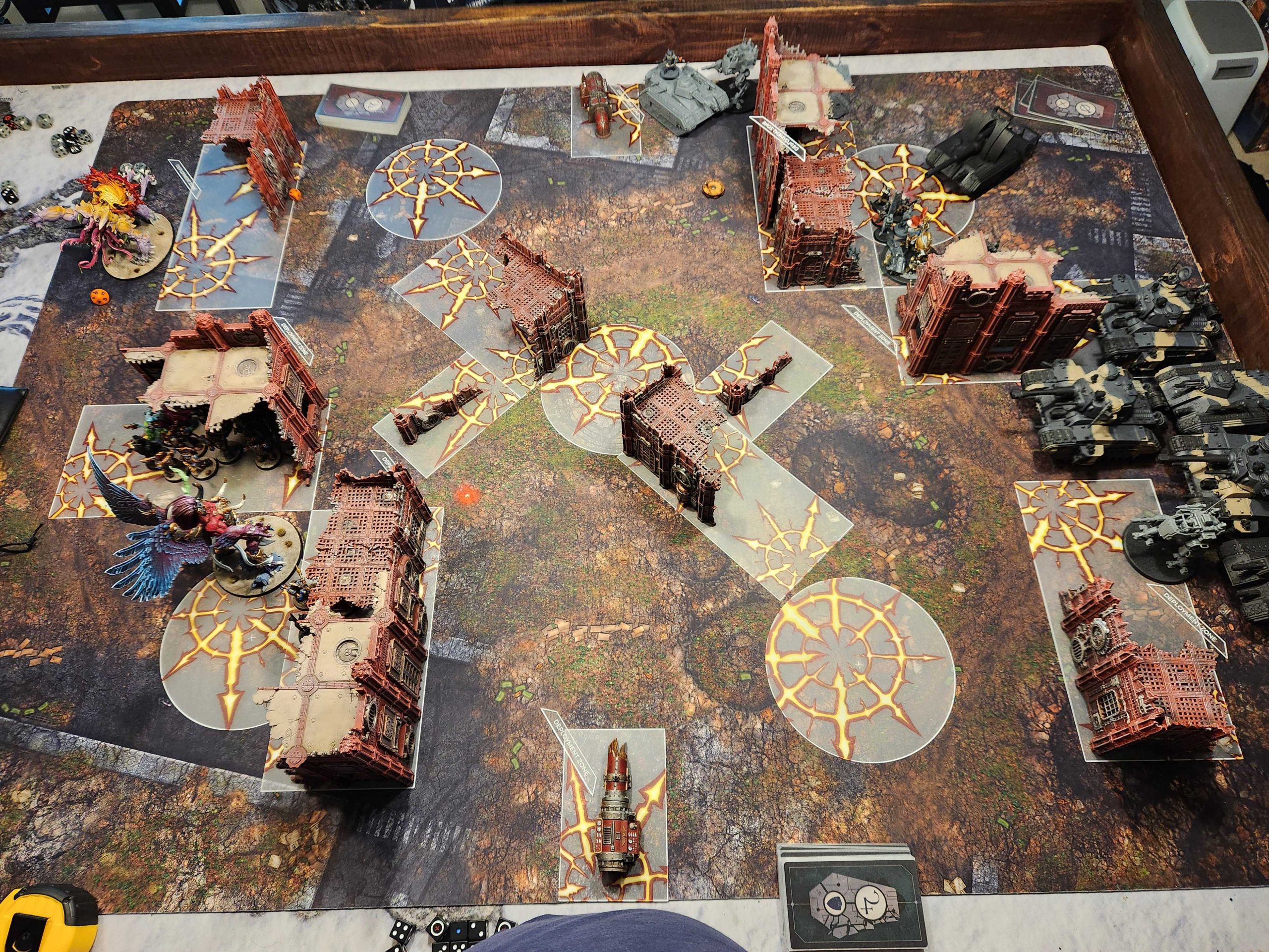 Not usually what you want on Purge the Foe but I can work with this. I draw Marked for Death and Overwhelming Force on turn 1, both dead draws (Marked for Death is the game's worst secondary, in my opinion - and I did the math to prove it). I'll keep Force but discard Marked at the end of the turn. My objective right now is to remove all of Andrew's threats from the top half of the table, so that means killing a Scout Sentinel, a Chimera, and the Kasrkin inside. I wheel Magnus up that way, pull out the Mutalith, Temporal Surge out Ahriman's unit, and bring in the reserves.
