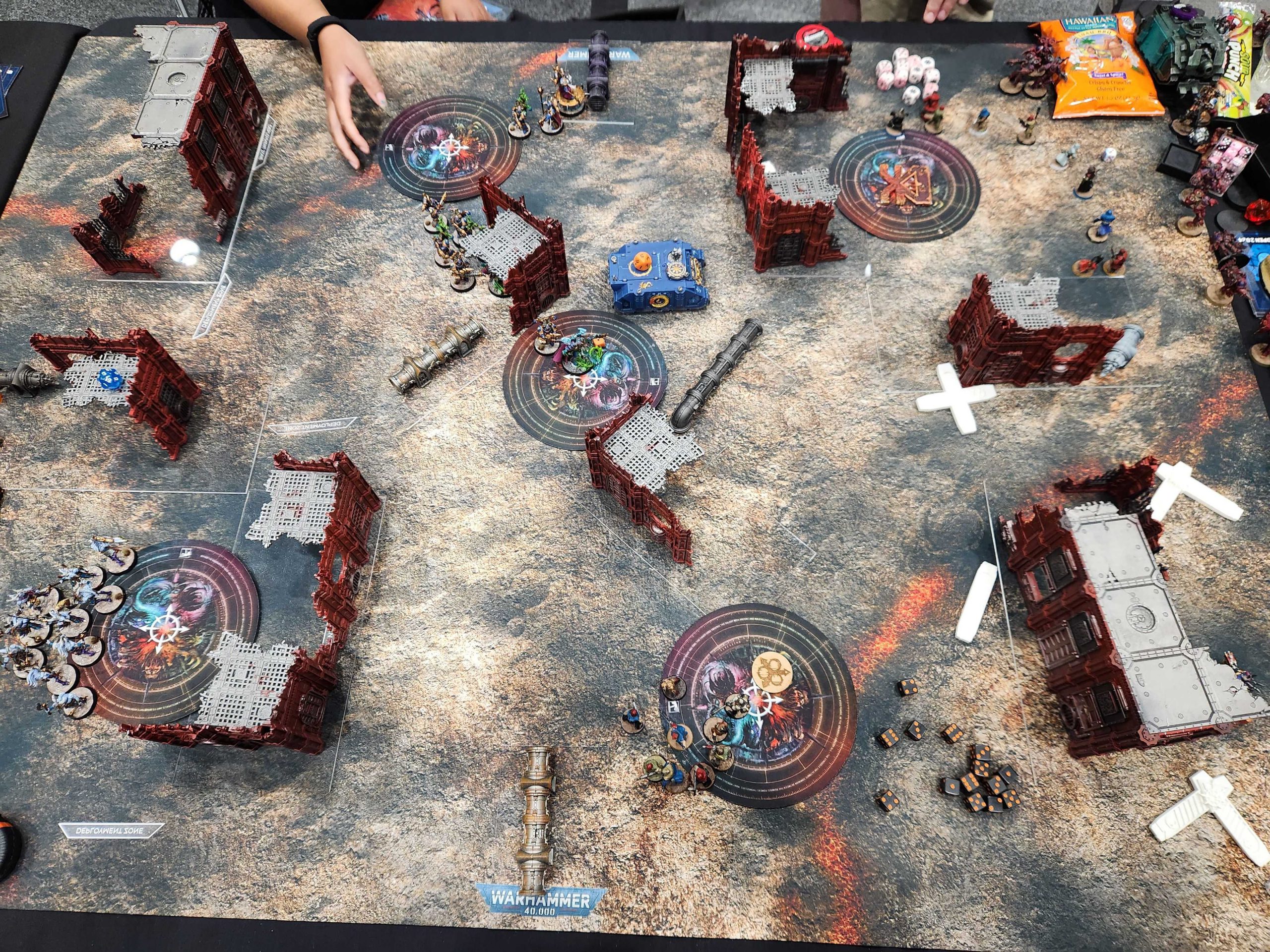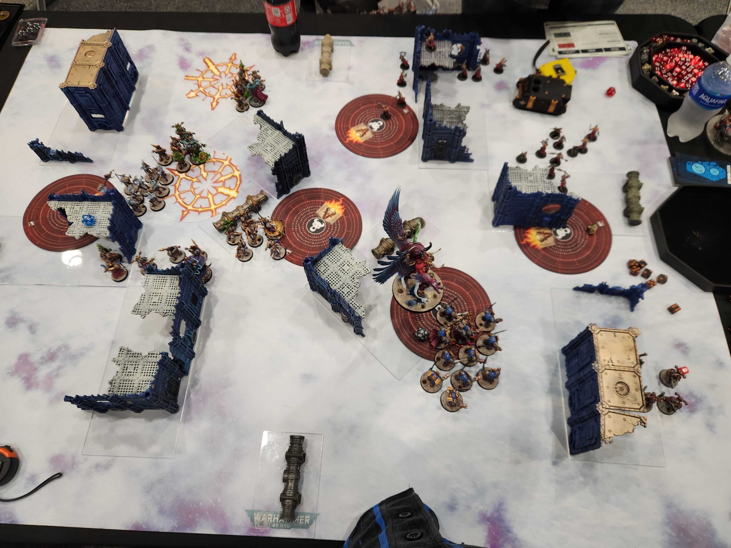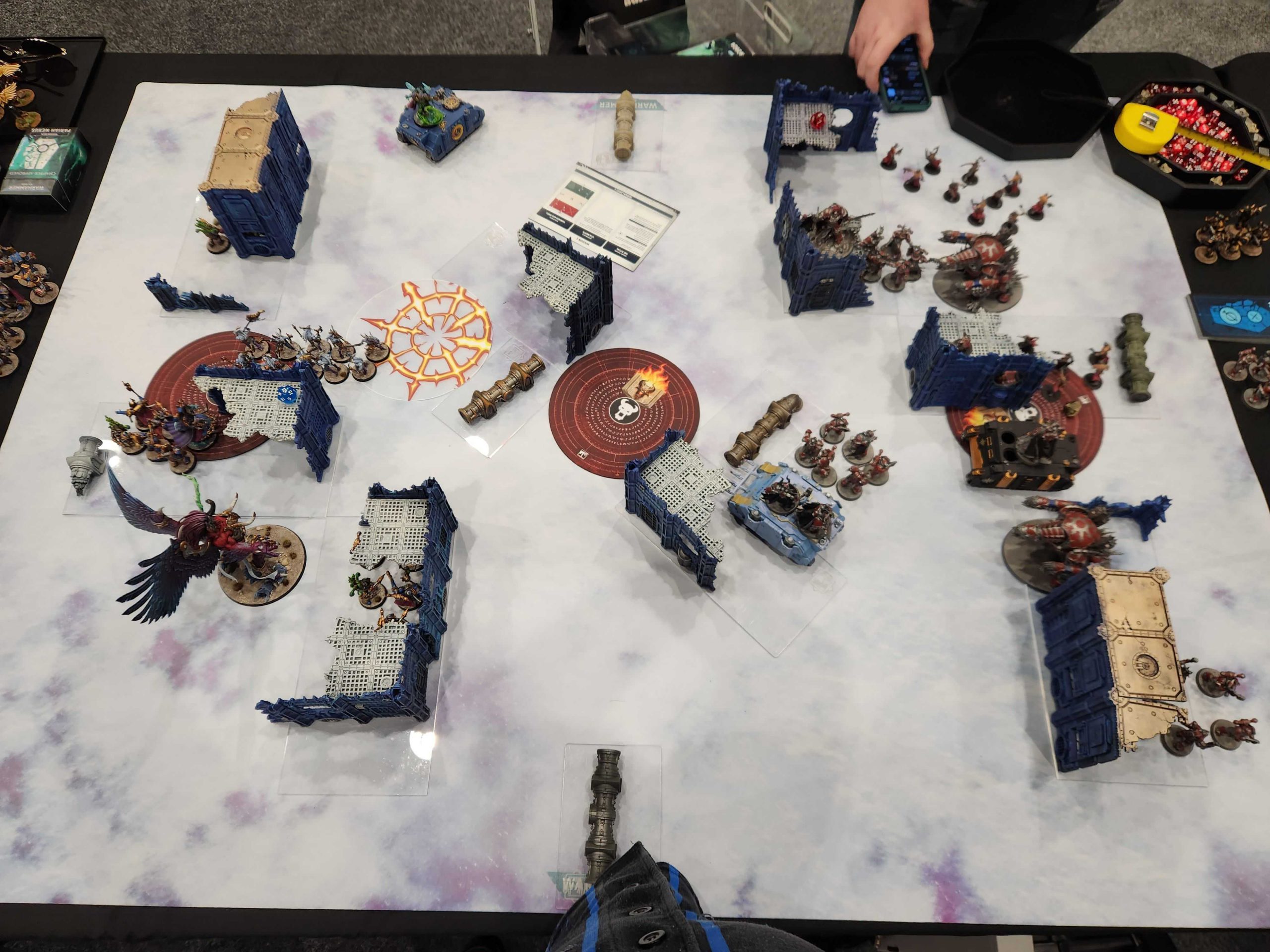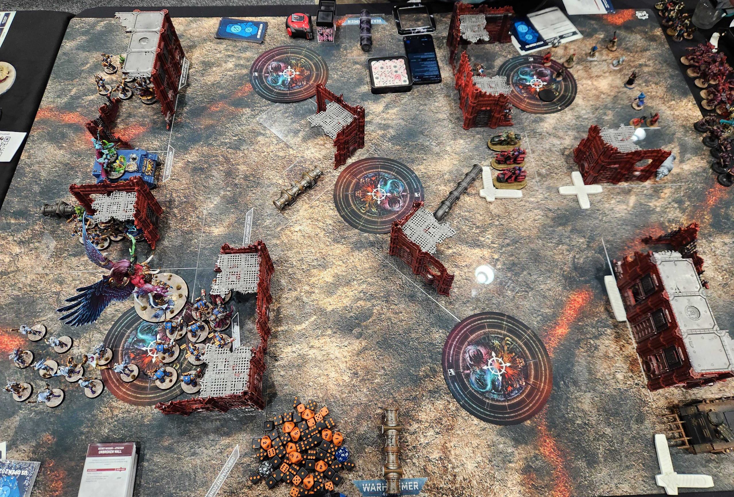 Final turn of the game and I pull Containment and Sabotage. You have to be kidding me with these secondary draws. Despite all of it, I can easily score Sabotage with the Rubrics for 6, so I'll have to live with that. Chris then draws Storm Hostile Objective and Engage on All Fronts, another free 8 VP. As we tally up scores, we talk about the outcomes and the Screamers with a judge. It's a tough situation because I didn't want to penalize Chris for forgetting a unit, but as Daemons there's nowhere I can have him put that unit where it won't immediately be super relevant to the game - and in this case the back of his home corner didn't even require big teleport shenanigans. After some additional discussion of proper play procedure, we settle on an 85-85 tie for the round, which we can both live with and makes sense given the misplay. Chris doesn't want to punish me for being too polite, and I appreciate that.