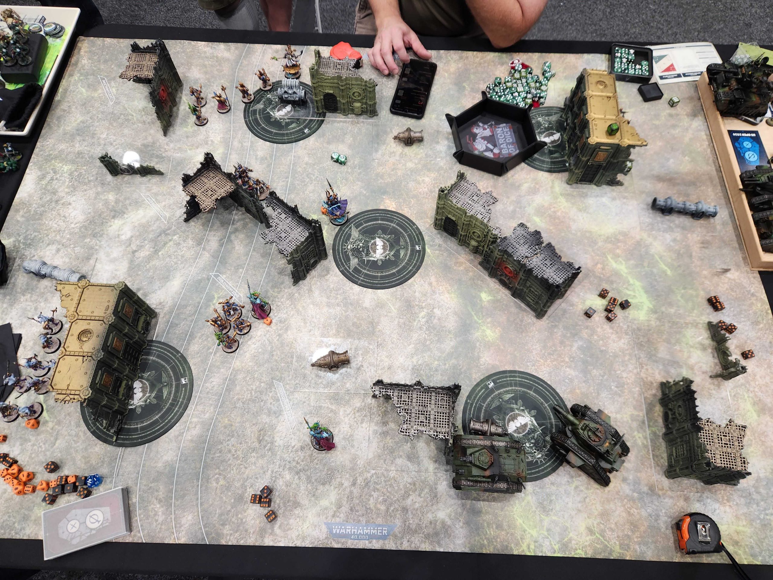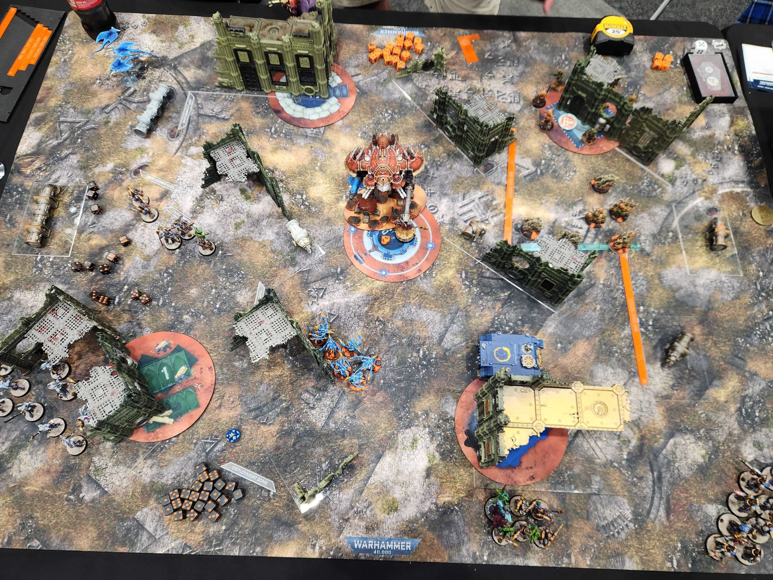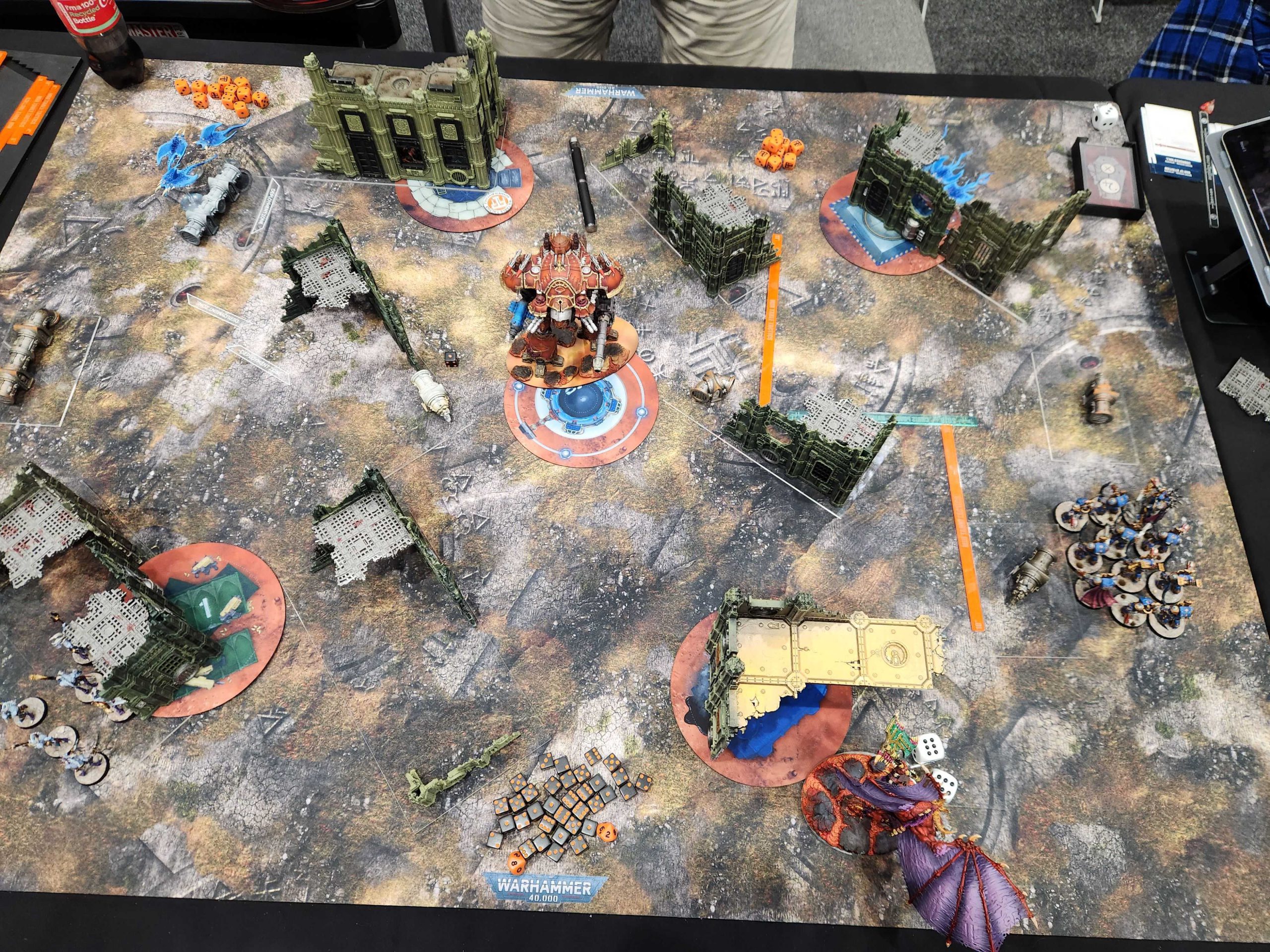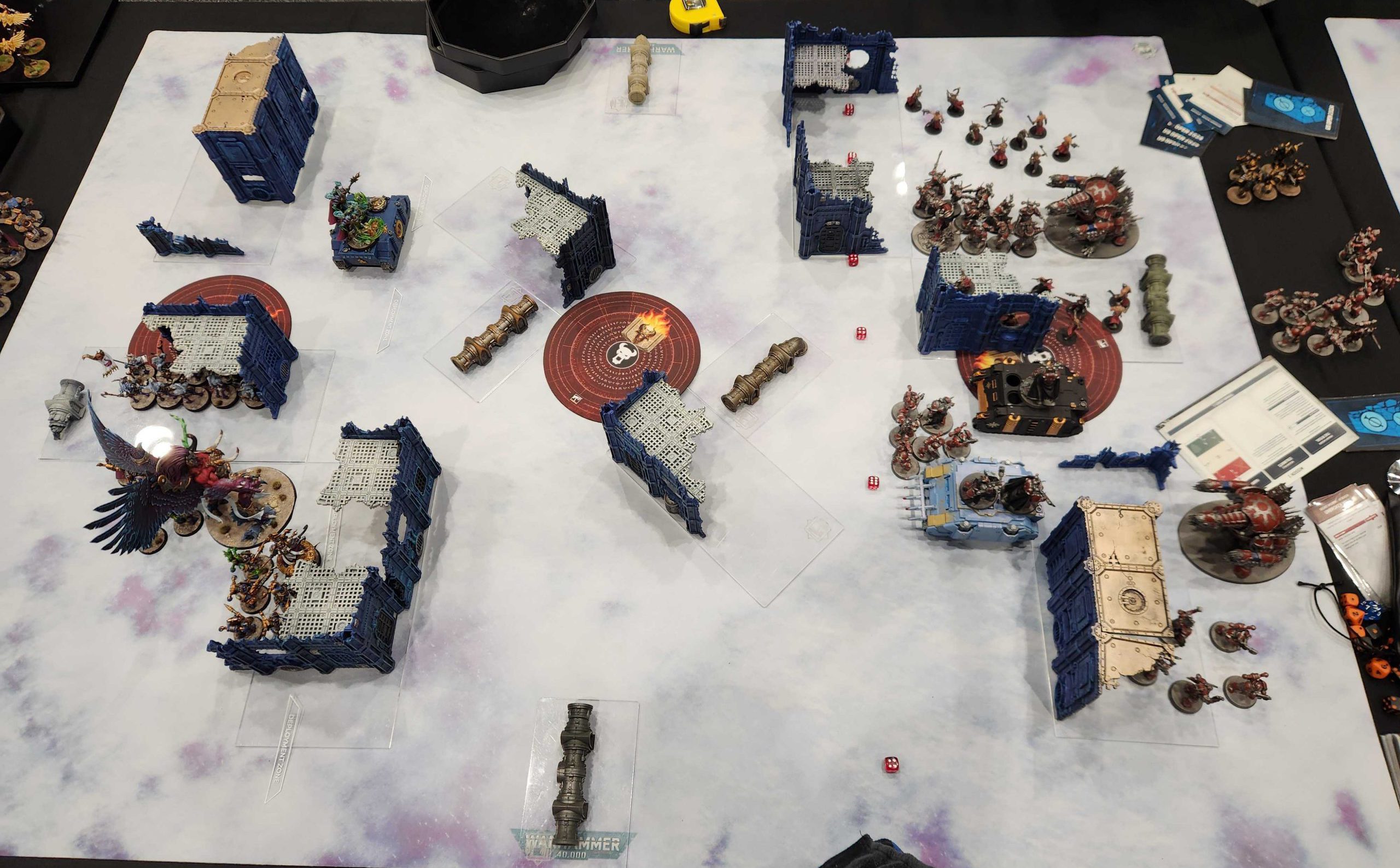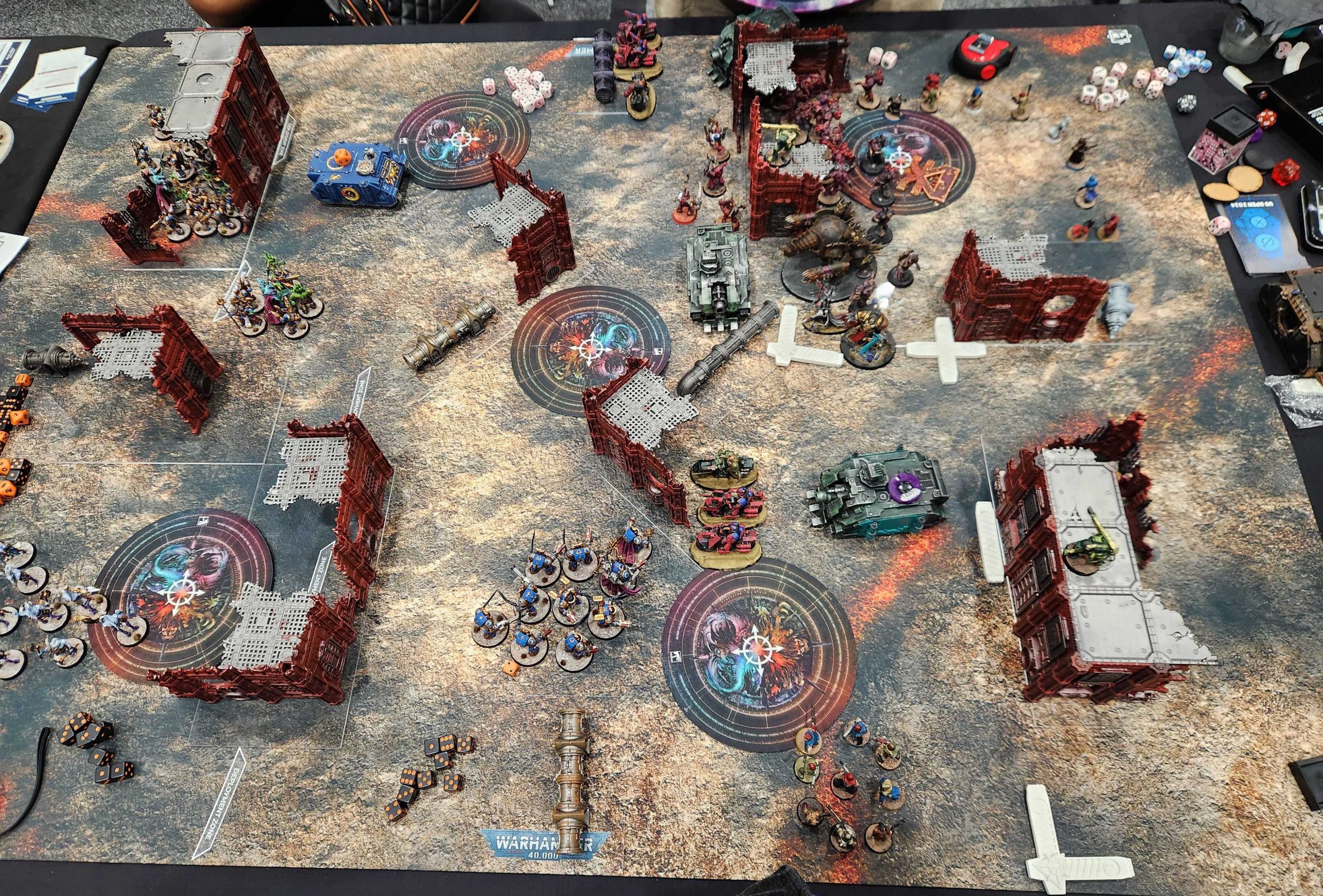 Final turn of the game and I pull Containment and Sabotage. You have to be kidding me with these secondary draws. Despite all of it, I can easily score Sabotage with the Rubrics for 6, so I'll have to live with that. Chris then draws Storm Hostile Objective and Engage on All Fronts, another free 8 VP. As we tally up scores, we talk about the outcomes and the Screamers with a judge. It's a tough situation because I didn't want to penalize Chris for forgetting a unit, but as Daemons there's nowhere I can have him put that unit where it won't immediately be super relevant to the game - and in this case the back of his home corner didn't even require big teleport shenanigans. After some additional discussion of proper play procedure, we settle on an 85-85 tie for the round, which we can both live with and makes sense given the misplay. Chris doesn't want to punish me for being too polite, and I appreciate that.