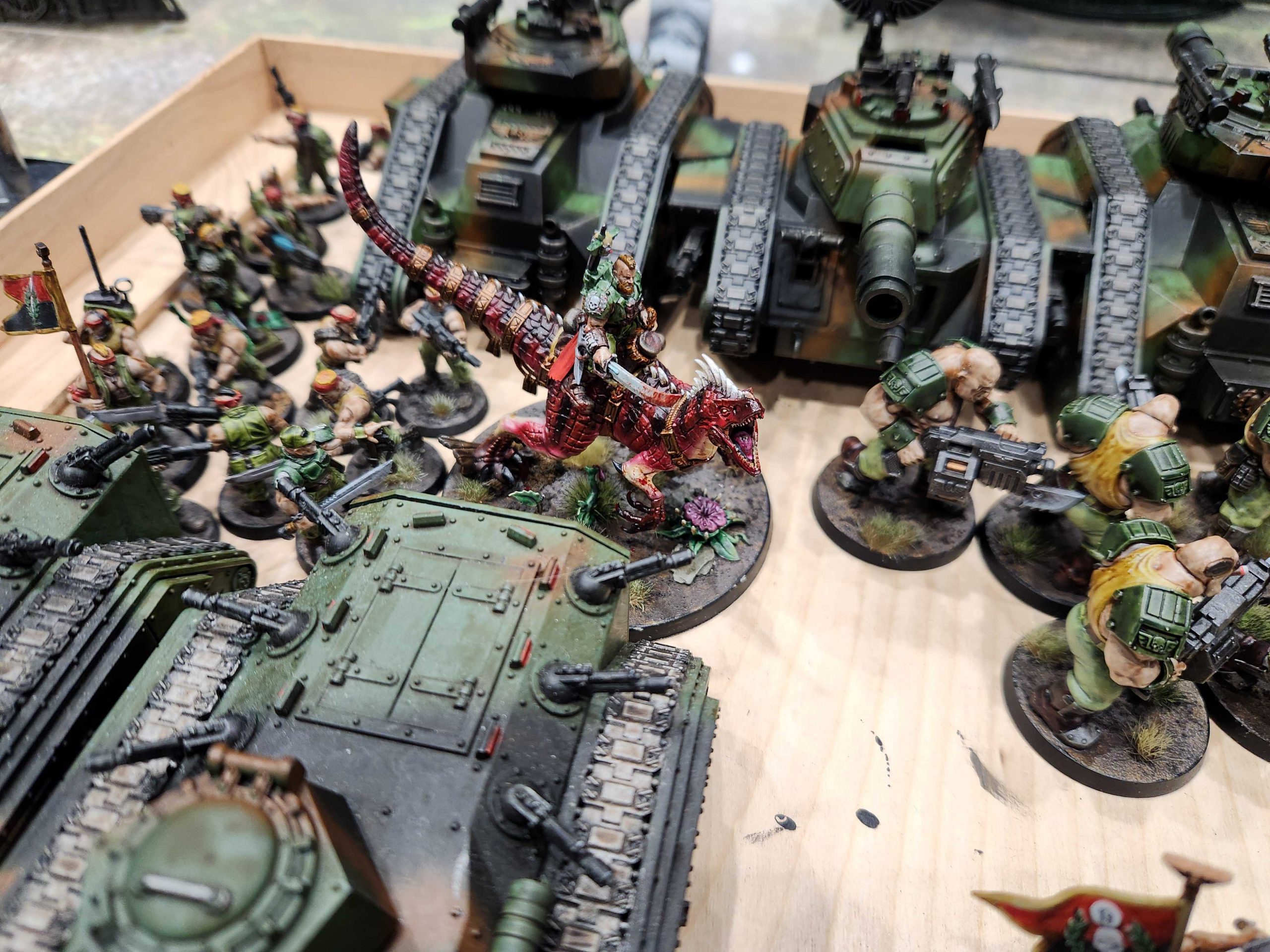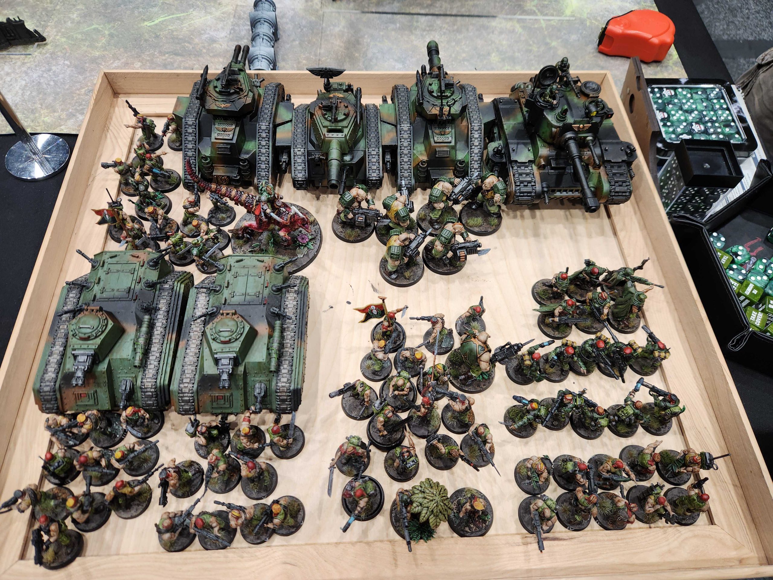 Tank Guard are my nightmare and while Scott doesn't have triple Dorns he has plenty of Leman Russ Battle tanks to work with. Guard are just really good right now - they play missions very well and just always seem to be scoring more points over the course of a game. While Scott doesn't have any indirect fire, he has lots of up-down tricks with Sly Marbo and Gaunt's Ghosts, deep striking Tempestus Scions, and a squad of Ogryn to scrap in the middle. That last unit is more a liability in this matchup, though.