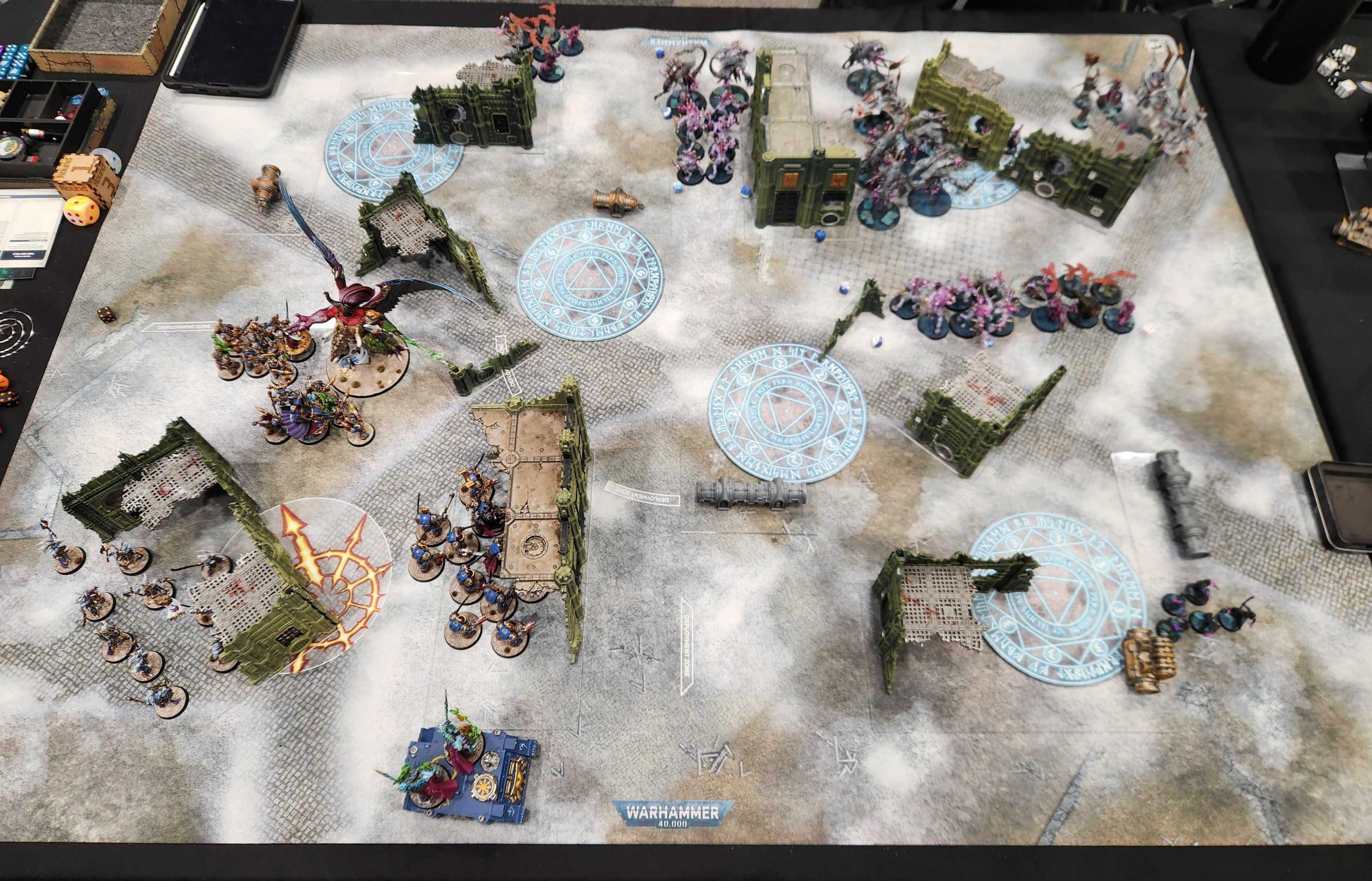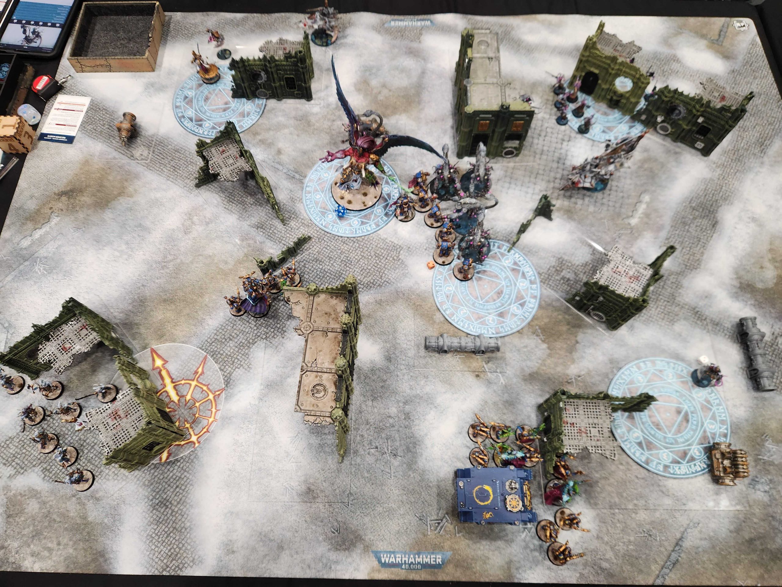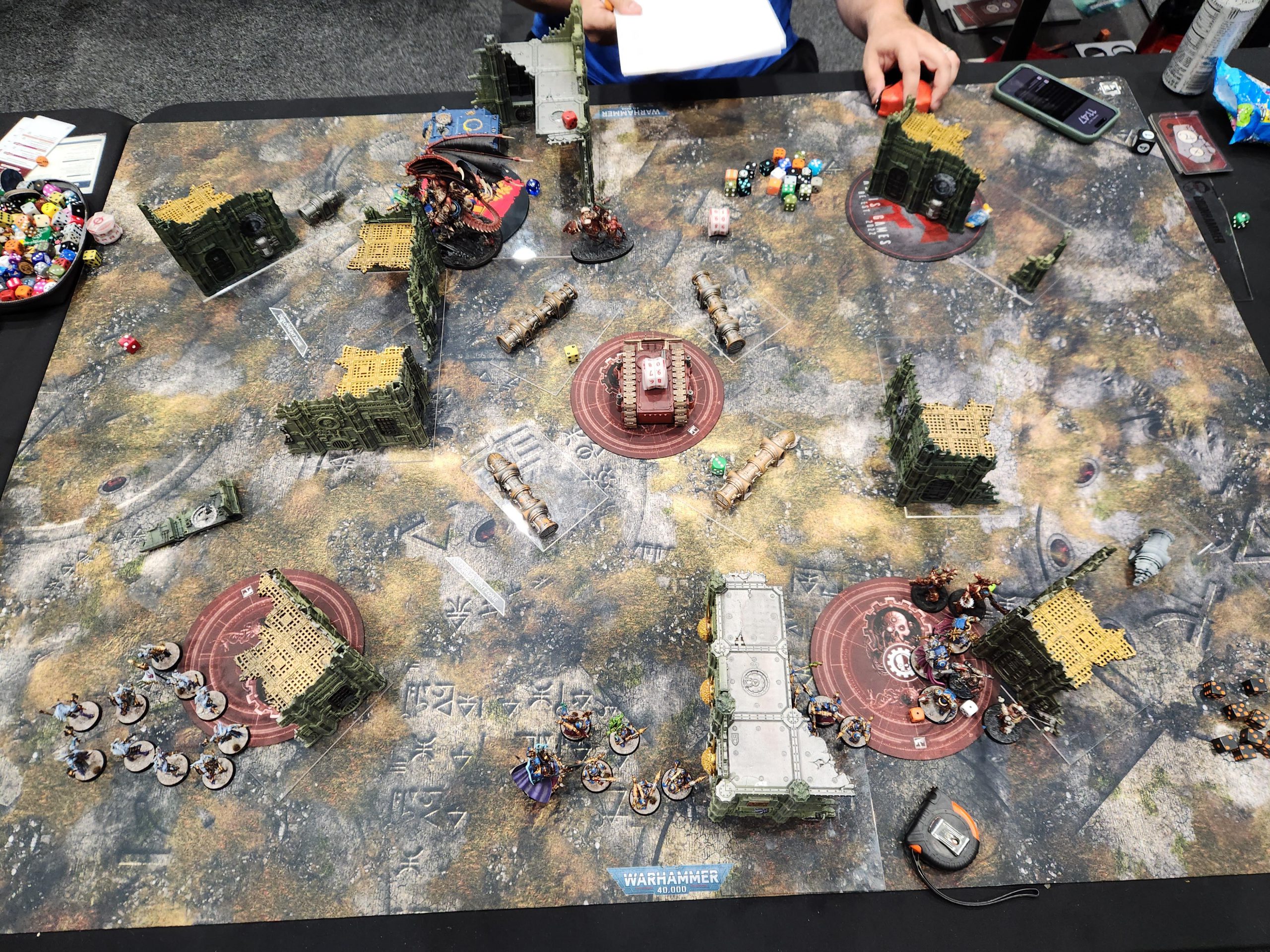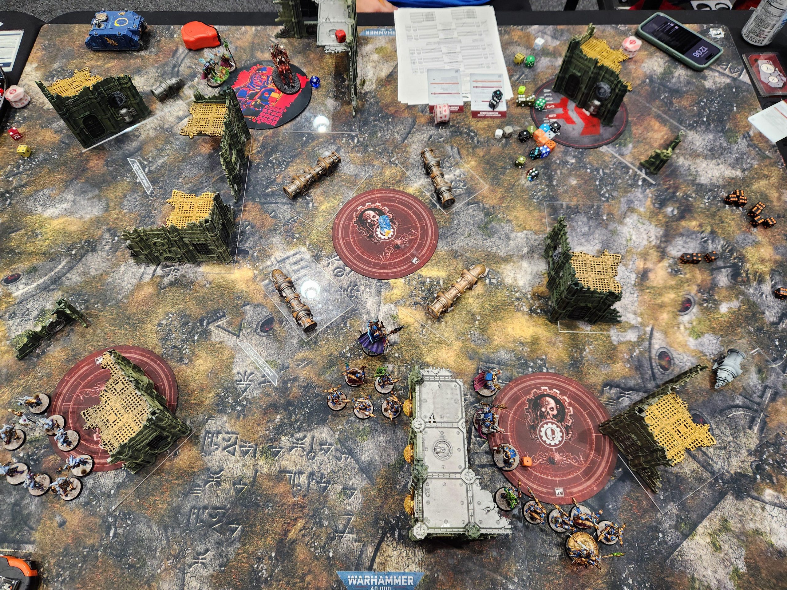 Yeah remember that worst-case scenario? That happens here. I draw Engage on All Fronts and Cleanse on turn 1, and I'm only able to cleanse one objective and score baby Engage. I teleport my Terminators to the upper objective and swing a unit of Rubrics around to kill a Neurolictor before it can cause problems.