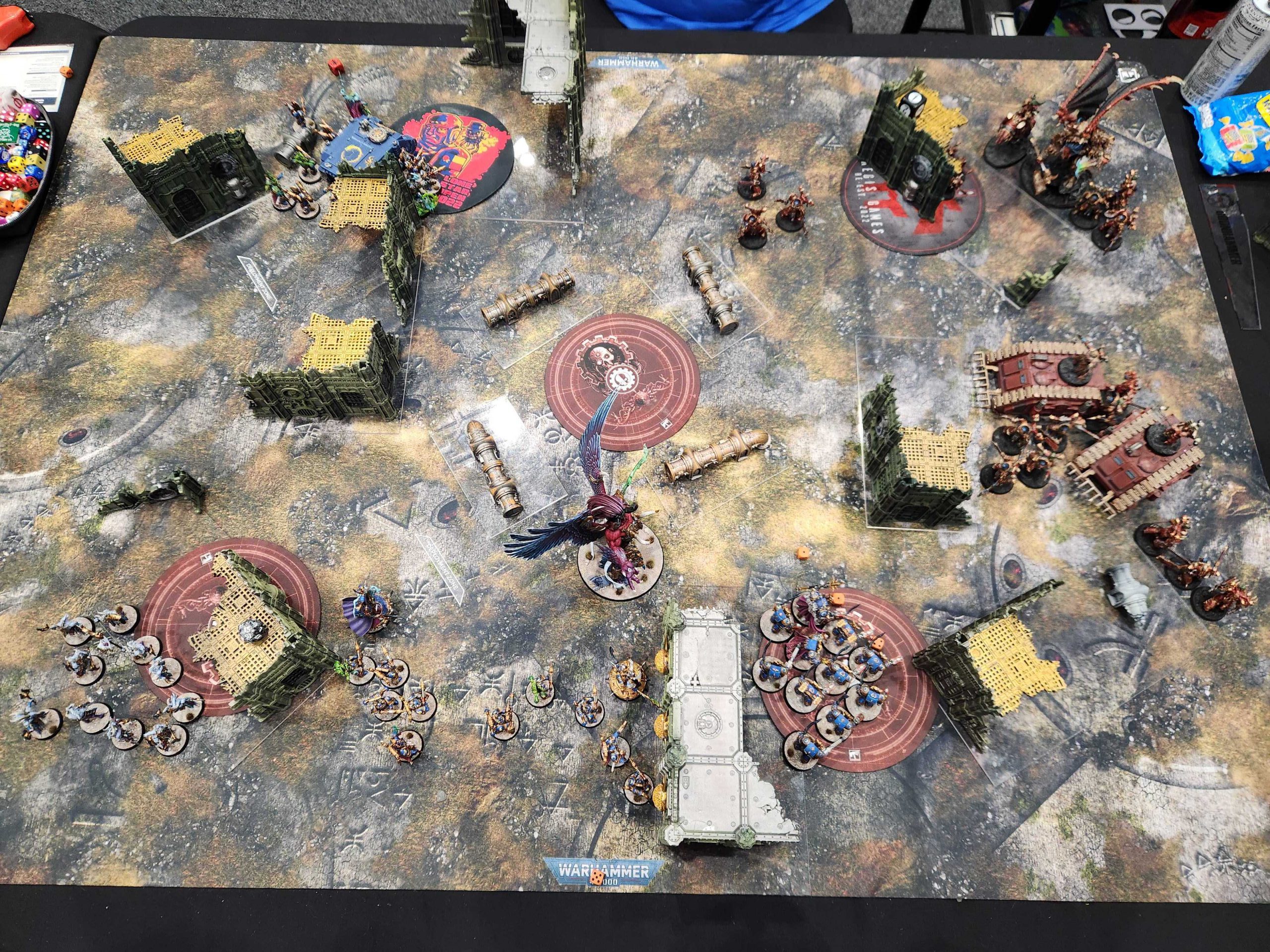 Then I make a mistake of my own, moving Magnus too close to the middle to score Area Denial. This was 5 VP I think I needed, but really just gave Alex the opening he needed to charge three units into Magnus and kill him, swinging the game back in his favor.