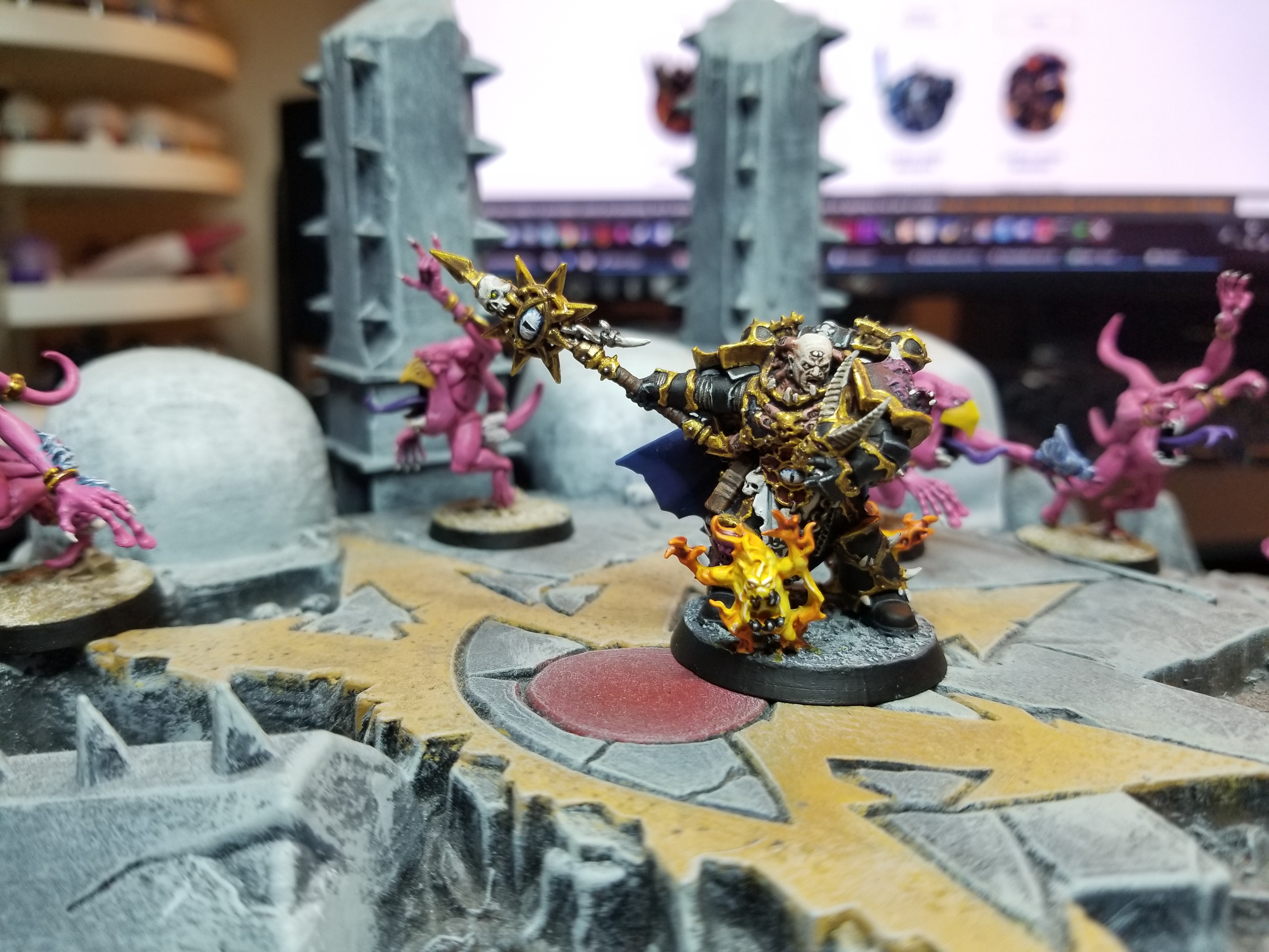 To celebrate Kaervek's promotion, show off his devotion to Tzeentch and newfound affinity for summoning daemons, and to put him on a 32mm base, I revisited the model, adding a pair of Brimstone horrors: