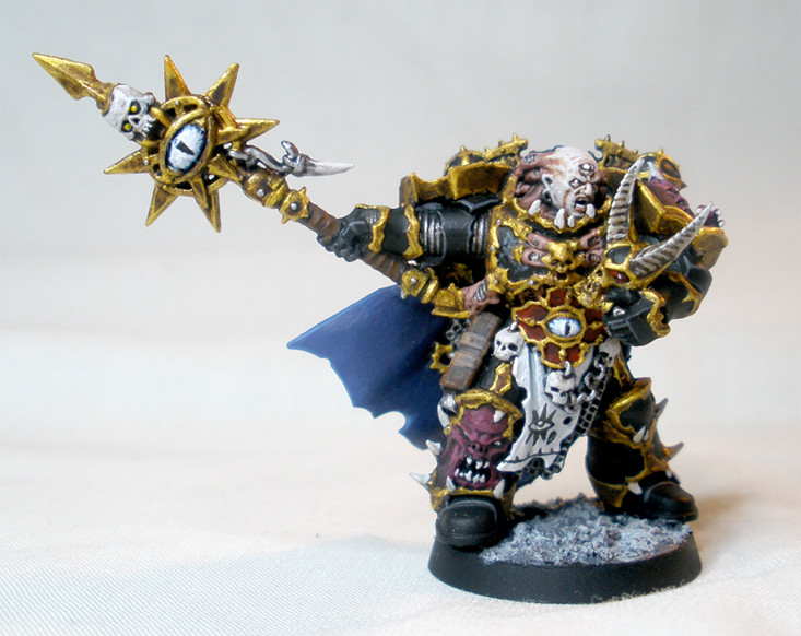 At the time Kaervek was just a Sorcerer I'd made, with a blue cloak to show his membership in the Cyclopean Cabal, a group of the Black Legion in the worship of Tzeentch, and whose members were formerly from the Thousand Sons. Kaervek was, at the time, in service to Chaos Lord Moloch, shown below: